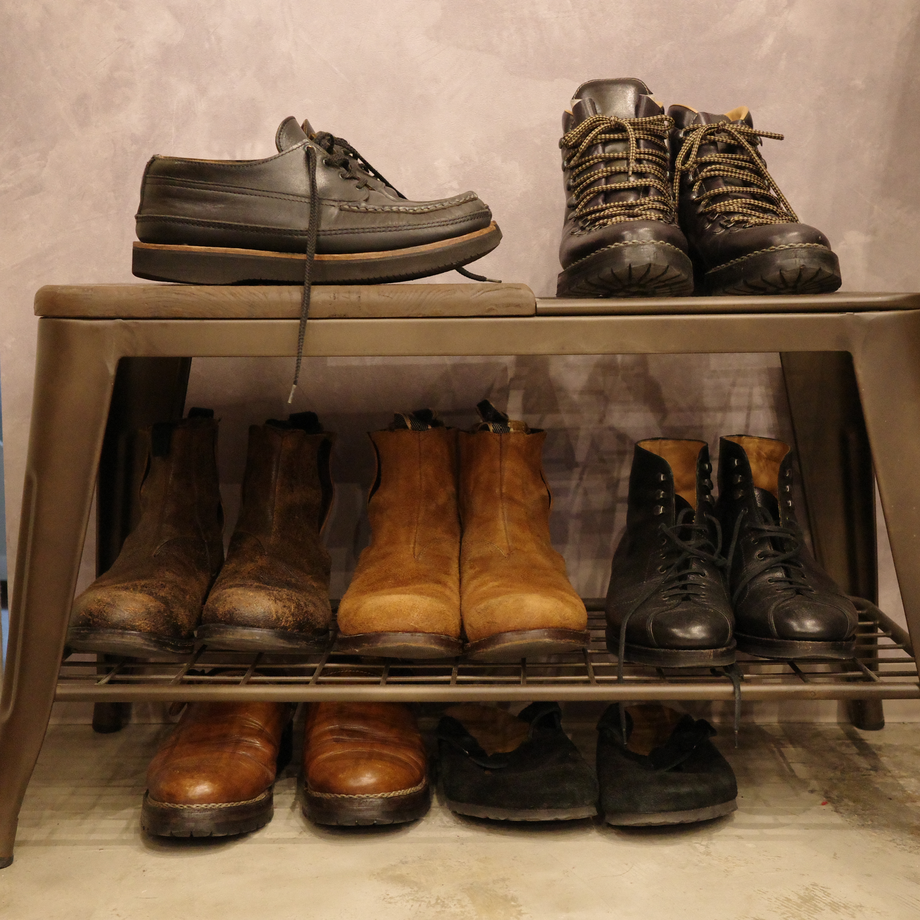 店の一角にはその日のコーディネートや撮影でも使ったりするように私物の革靴を置いています。