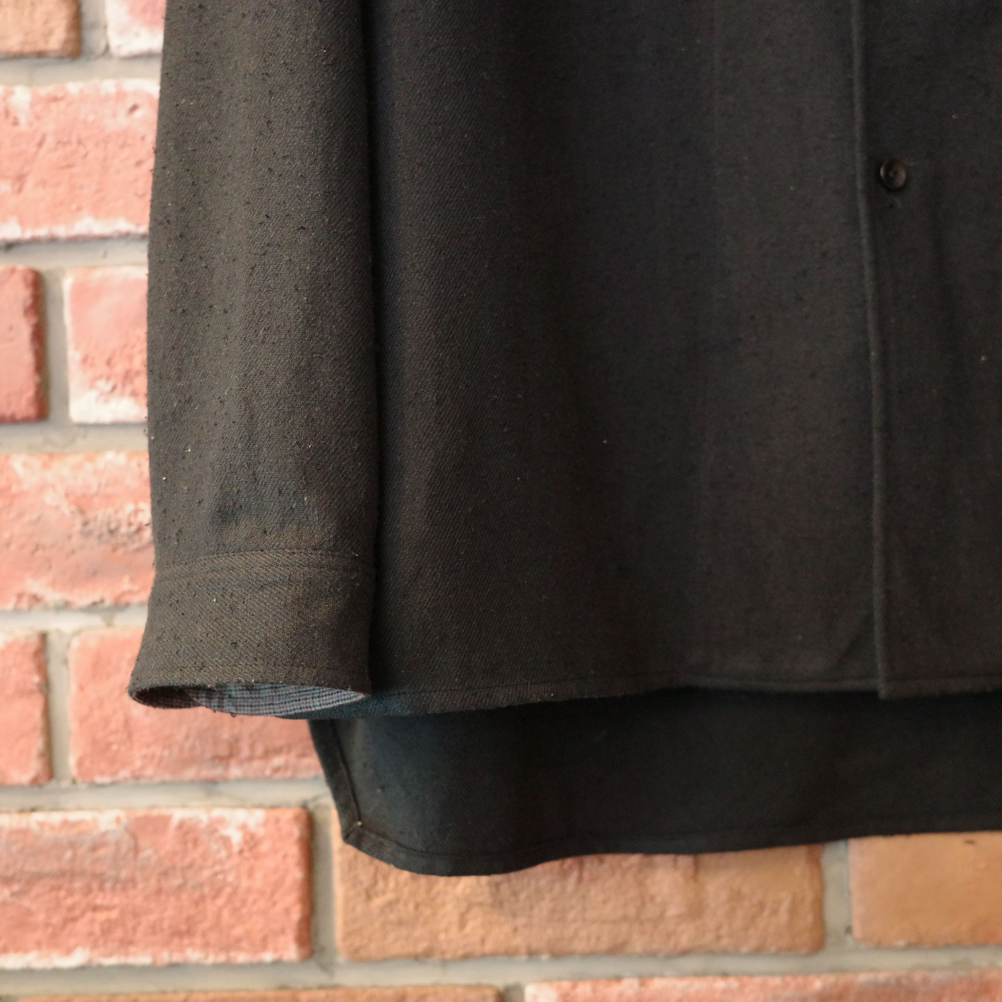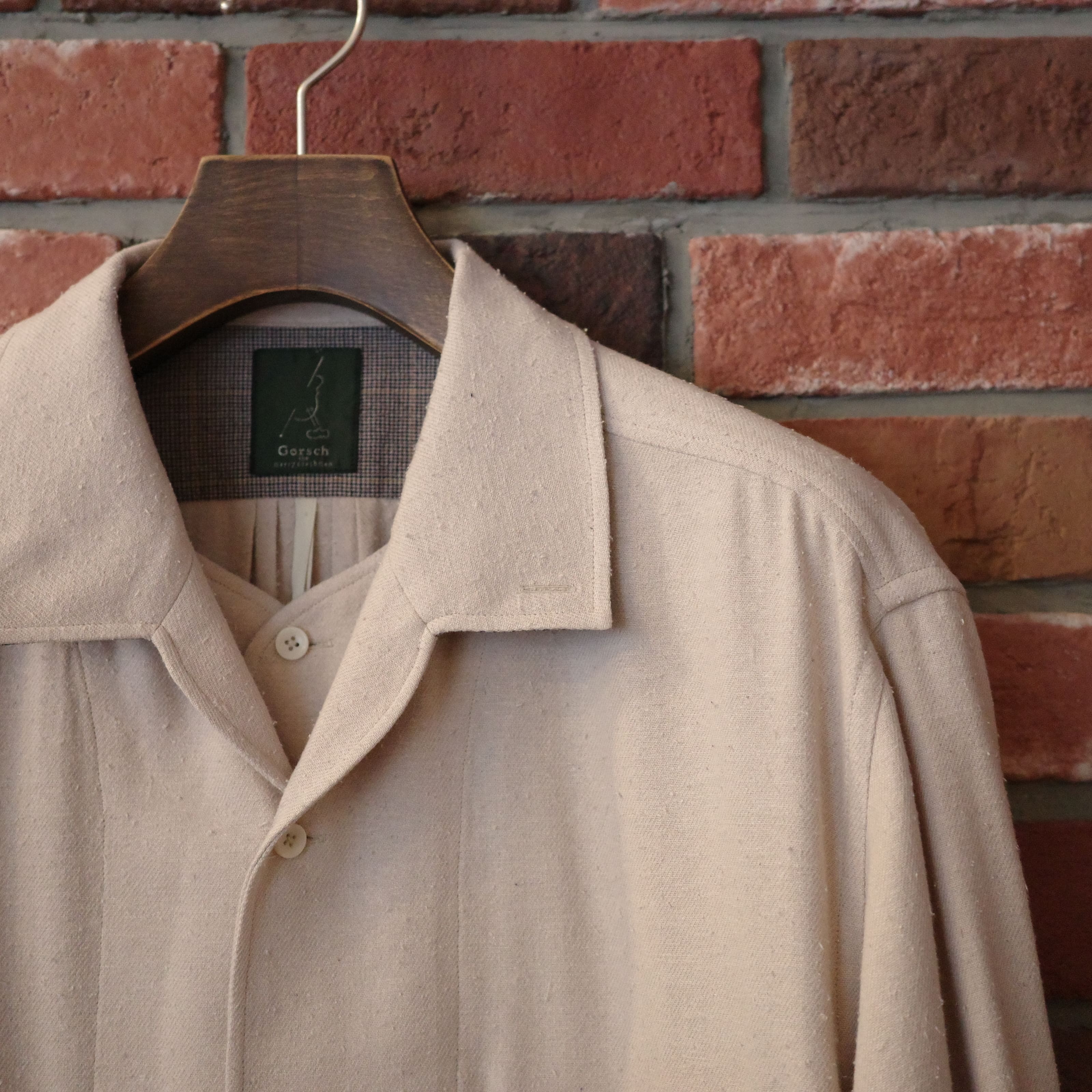 衿やカフス、そしてヨークにはウールとリネンを混ぜた生地を使用しました。こちらも違った肌触りの良さがあり、肌に直接触れる首元、手首にサラサラとした質感を添えいます。