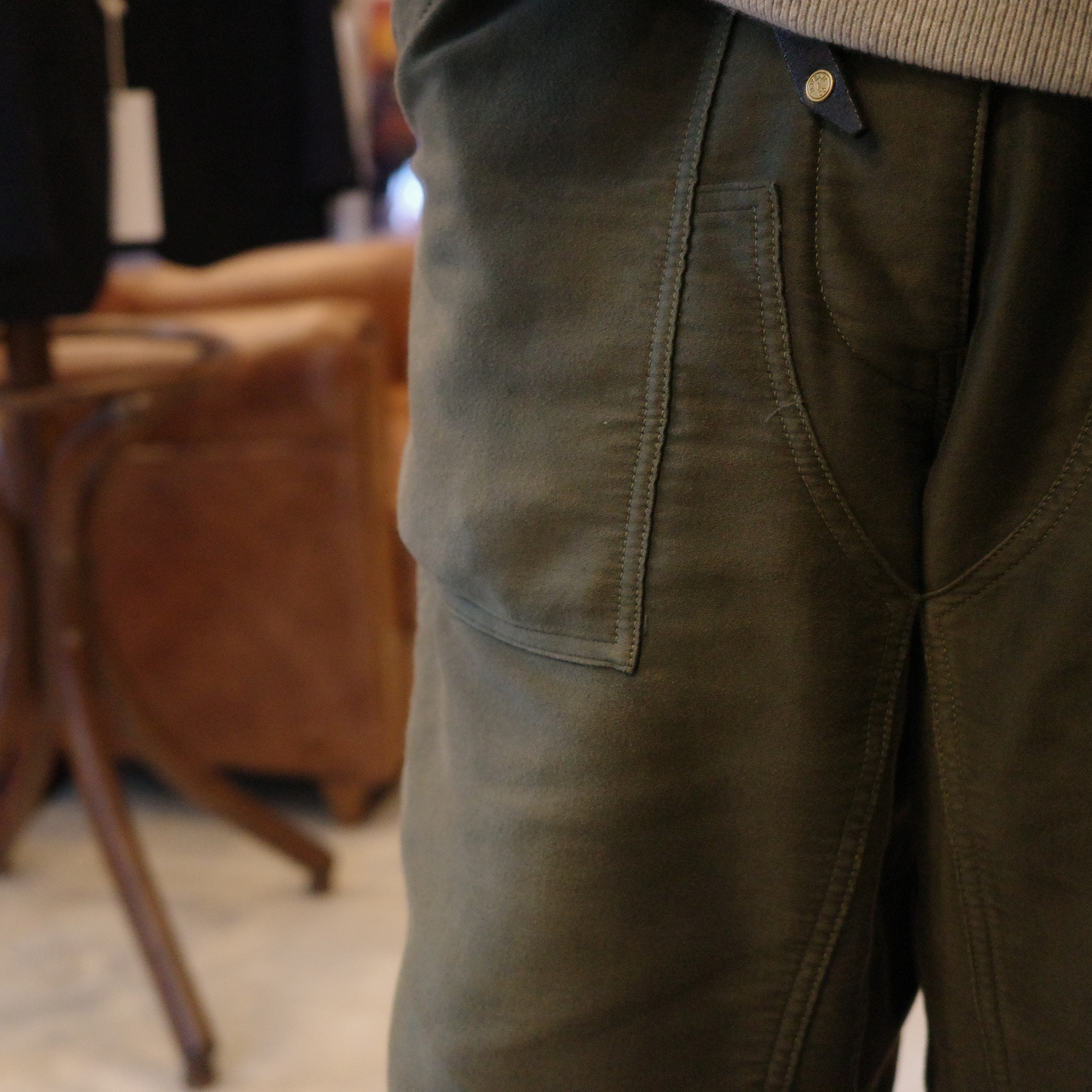 大好きなモールスキンで、カーキ色で、ファティーグ型で、ダブルニーという好きな要素が盛り込まれた一本。