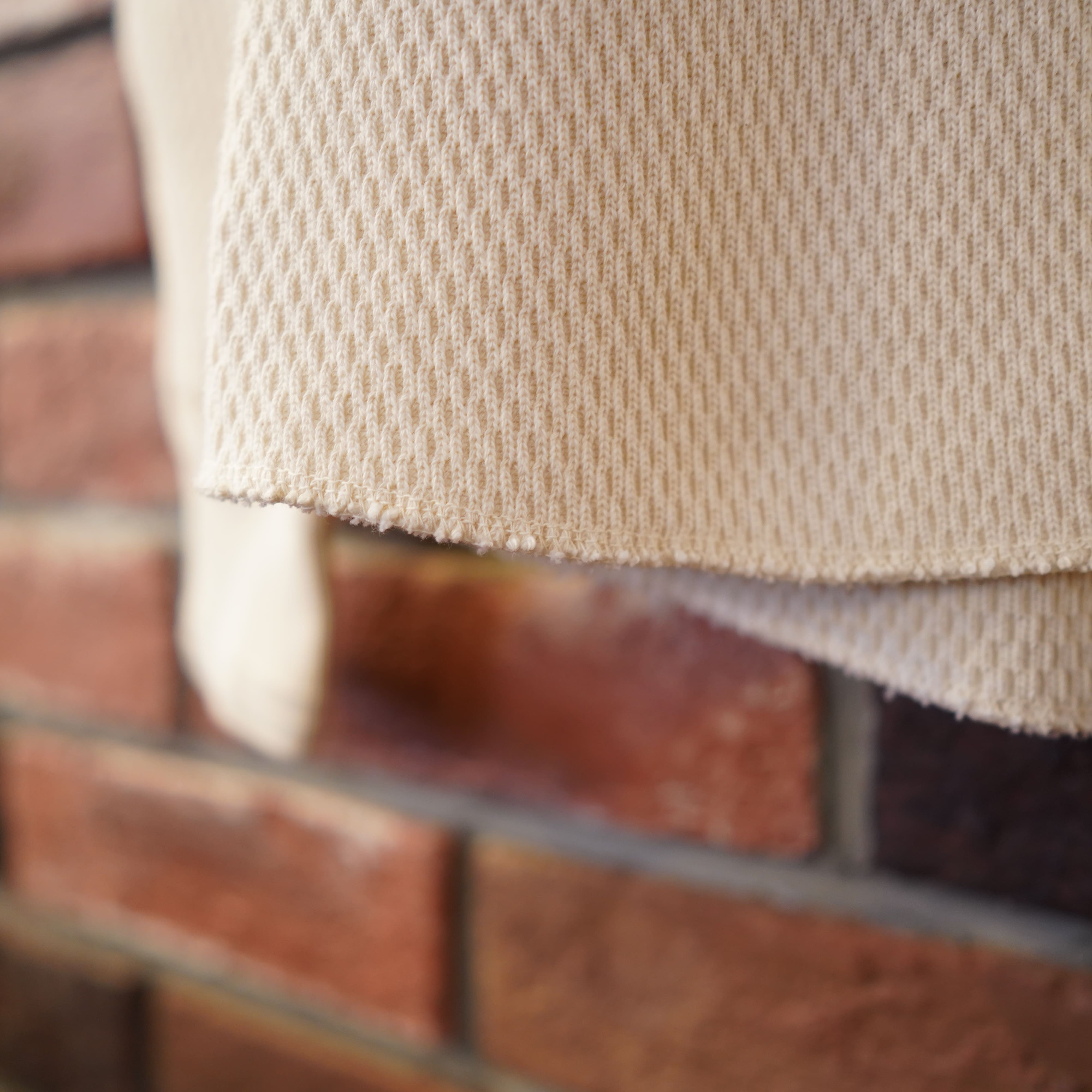 世界に誇る有数の丸編みニット生地の産地でもある和歌山のニット工場で作られたオリジナルのハニカムメッシュサーマル素材を使用しております。