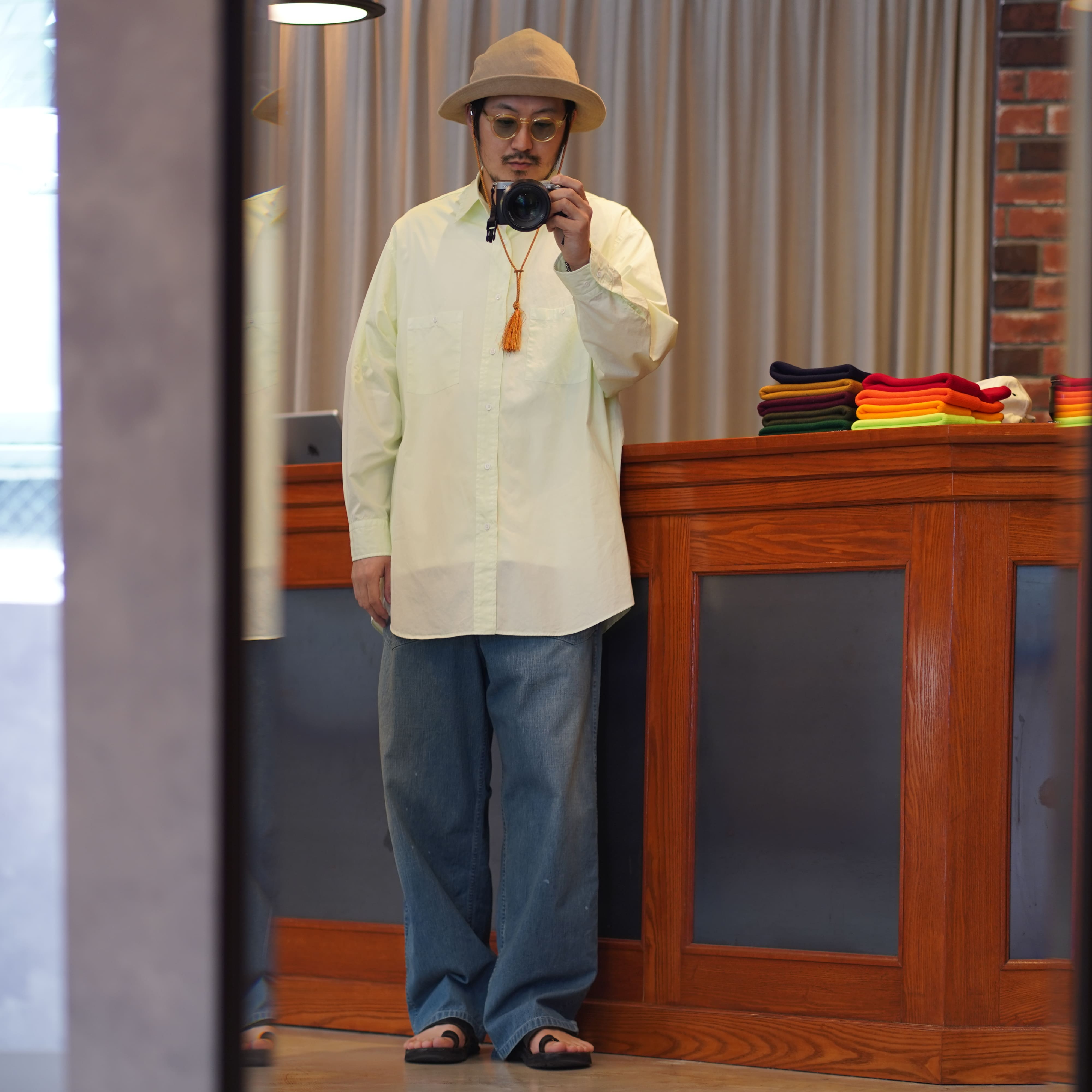 身幅75cmくらいあった気がします。腕周りも太く、肌に触れる面積が少ない、且つスビンコットンの滑らかさがあるからこそ僕はこのシャツは夏に着ています。ホント快適ですよ。夏はショーツにこれですよ。