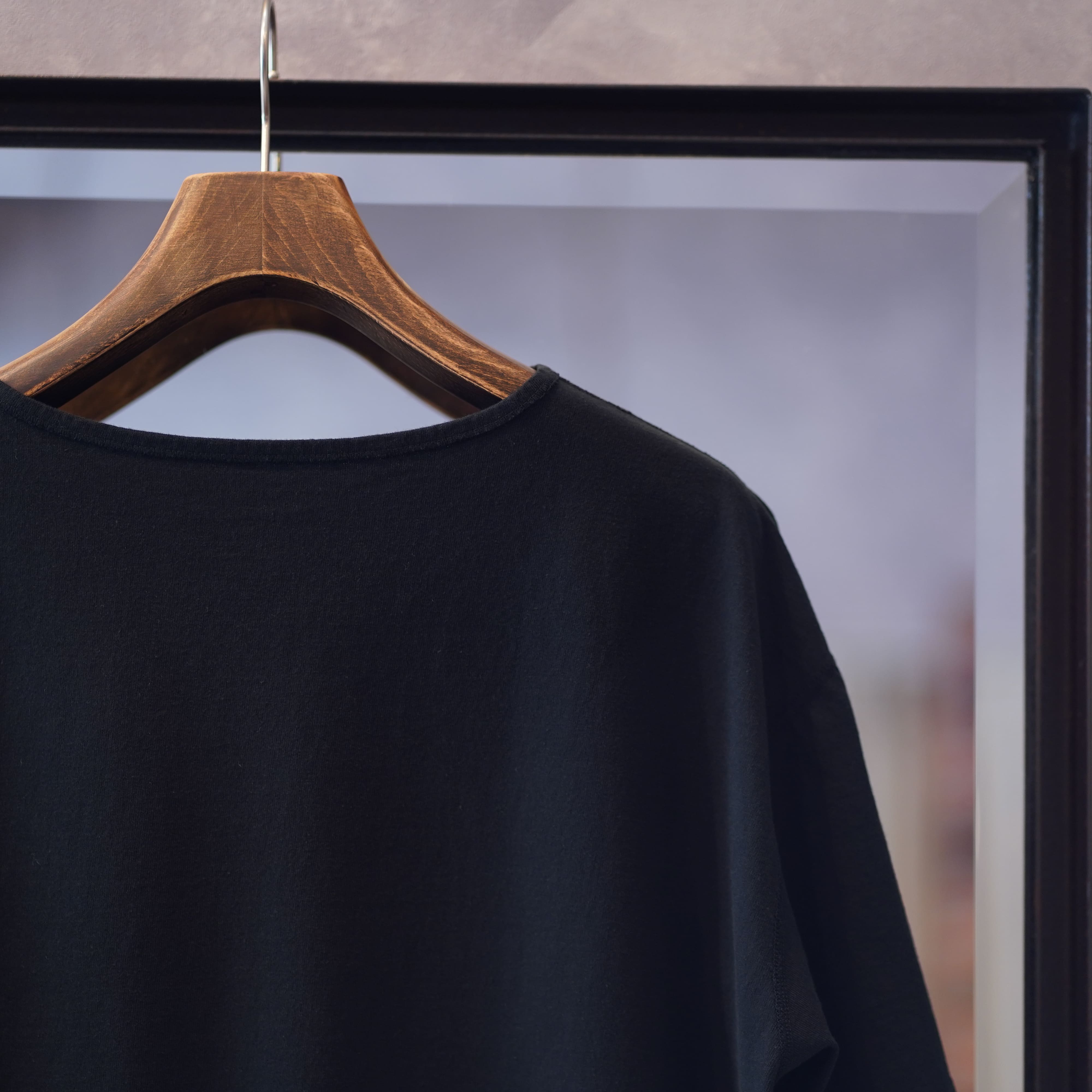 ボックスのシルエットで着ていてストレスフリー。ネックの詰まり具合が良く癖になる感覚です。