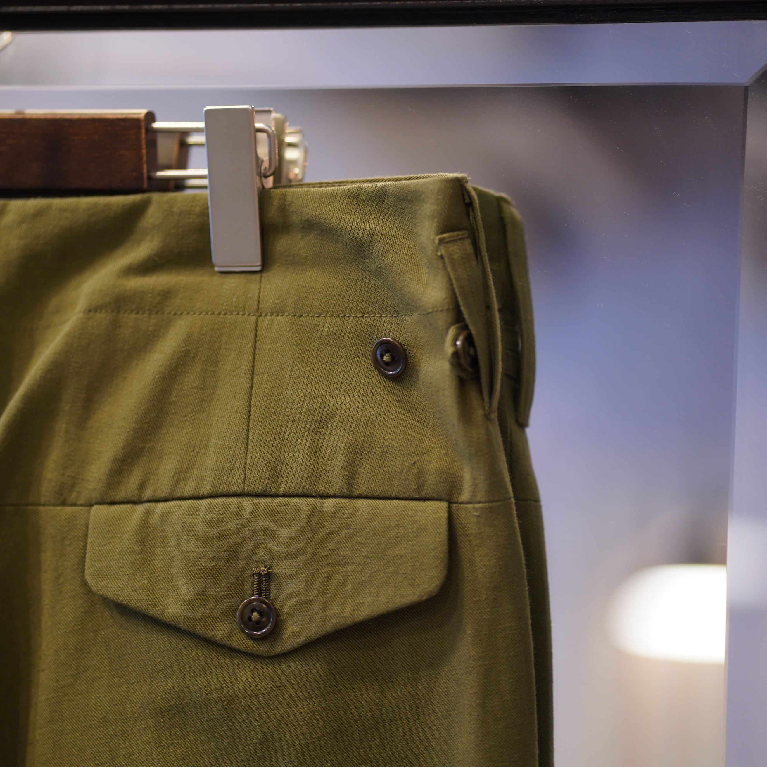 サイドのボタンアジャスターを1個ずつズラす事でウエストをギュッと絞って穿くのがおすすめです。
