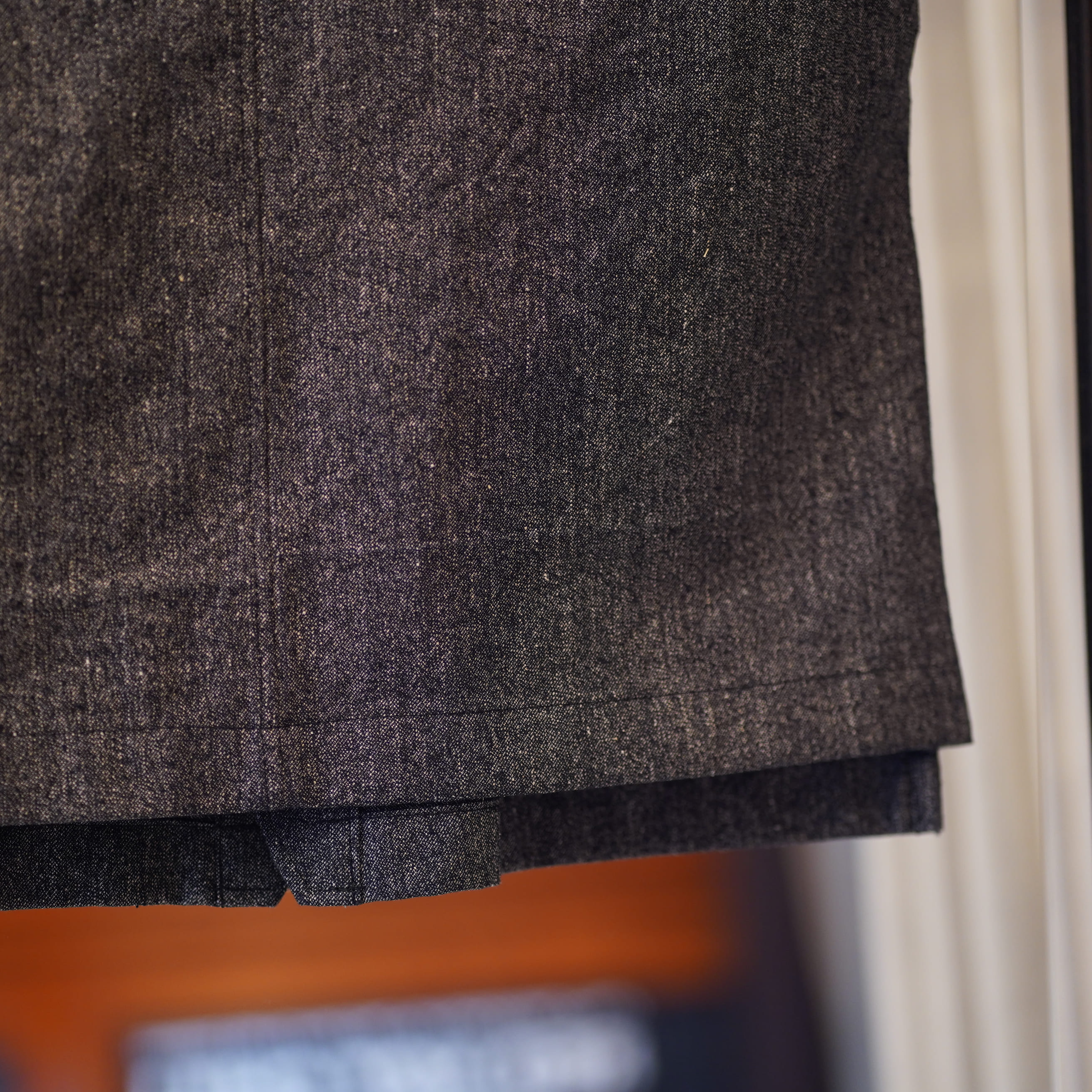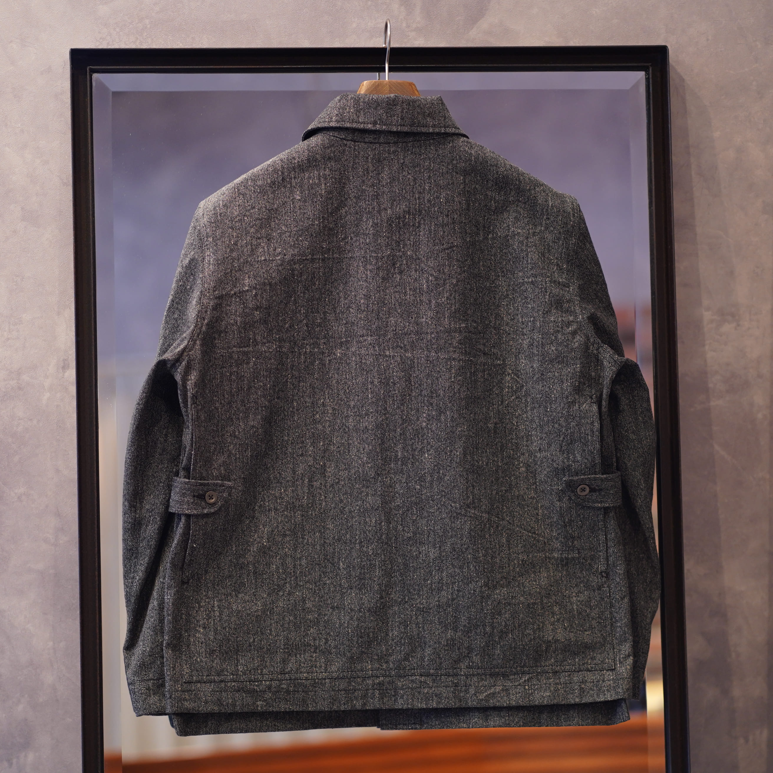 ハンティングジャケットをベースにデザインしました。今までは経年変化によるクタっとした感じのドロップショルダーとして着用するワークウエアをベースに作っておりましたが、多少フォーマル感も欲しいなと思い、肩幅をジャストで来てもらうように従来より狭め、袖山を高くすることで、ワークウエアながらも、背筋が伸びるようなしっかりとした印象のアイテム。