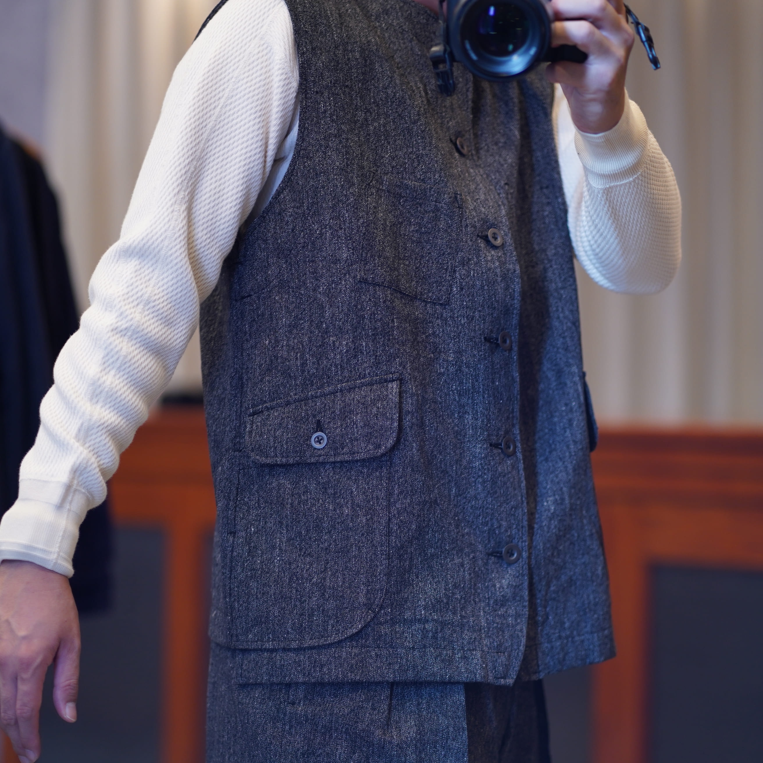 南部鉄器の過去の写真を見ていると、ベストを一番上に着ている職人が多いことに気が付きました。割と肩幅が狭いデザインが多く、当時のシルエットなのかもしれませんが、その感じが良く見えました。
