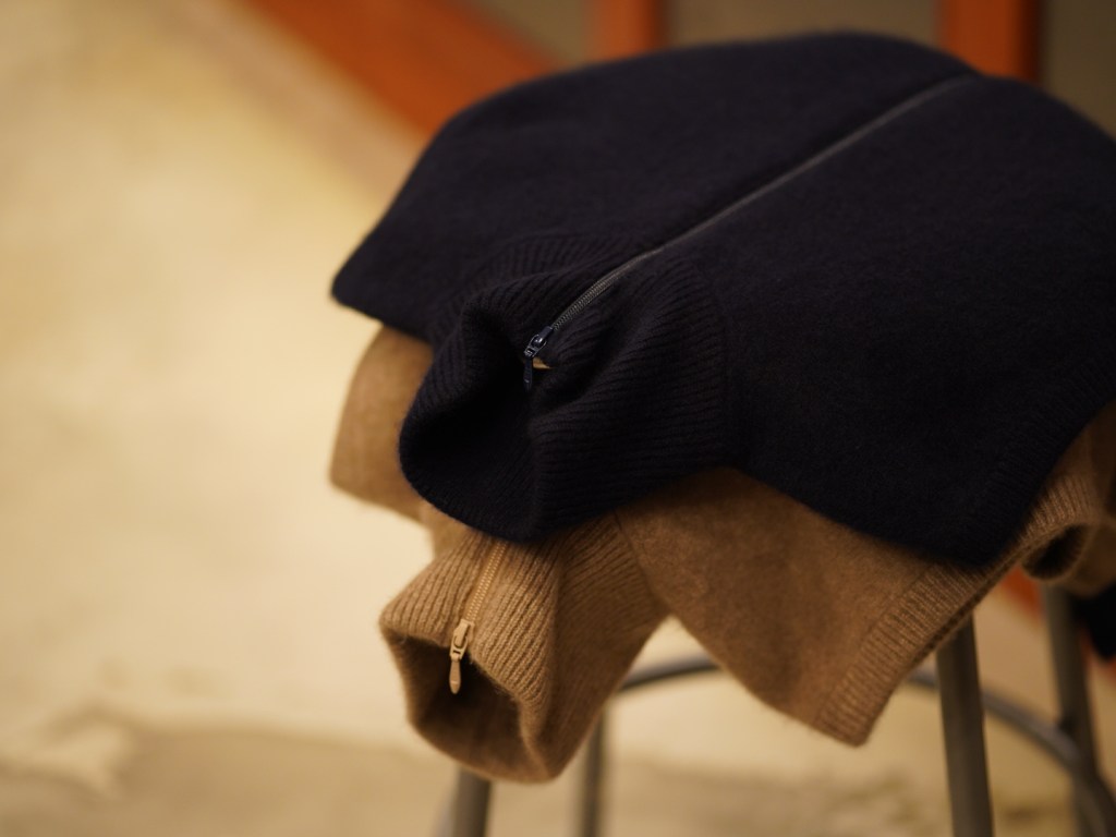サラッと綺麗に仕上げることが多いカシミヤのニットですが、今回は敢えて毛羽立たせる事でフワフワの着心地と肌触りに仕上がっています。それだけではない、ニットの弱点とも言える毛玉だがこの毛並みなら全く気にならないです。出来たとしてもハサミで軽くカットするぐらいの処理で充分です。