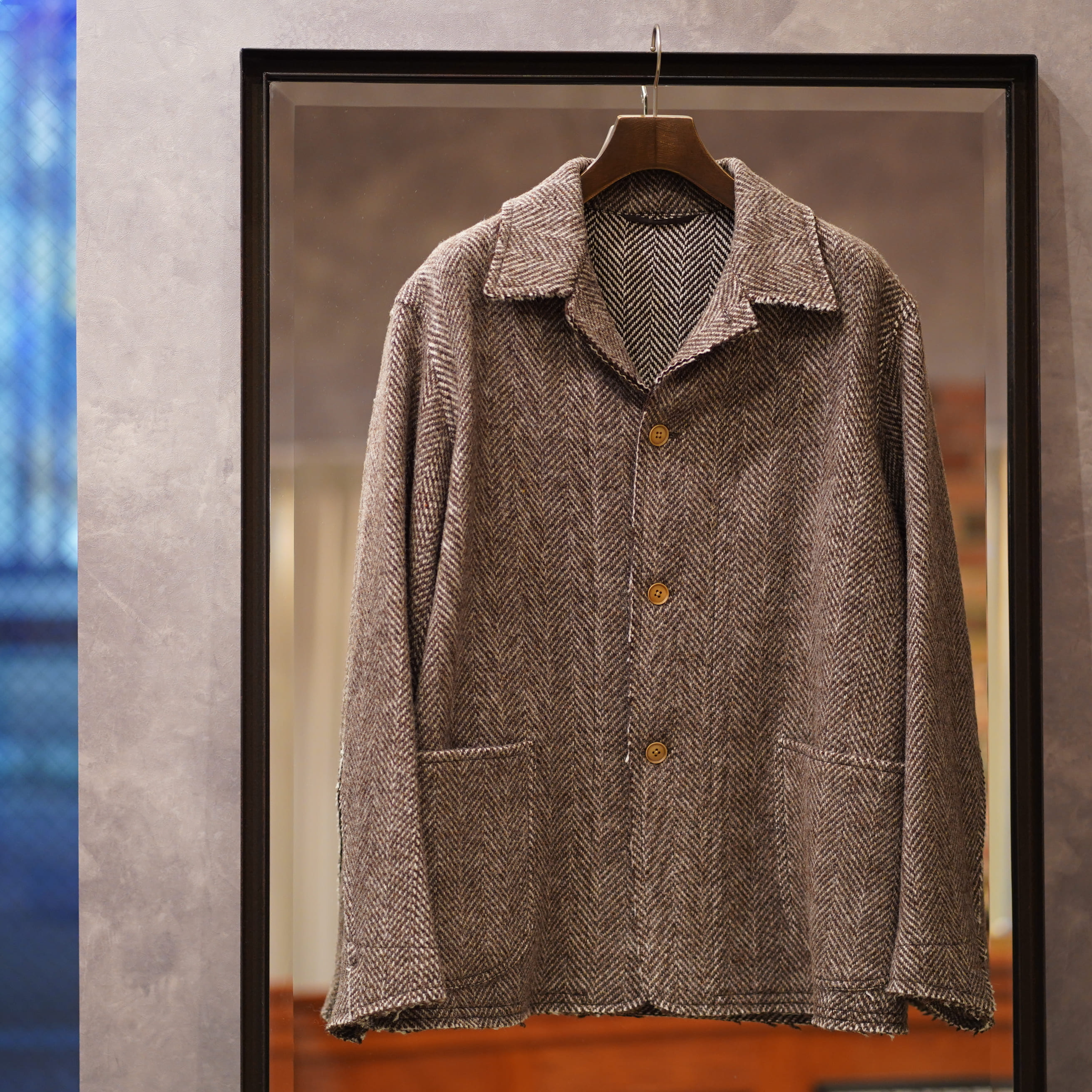 なるべくテンションを掛けず手織りの様な速度でゆっくりと時間を掛けて織り上げたツイード素材。シェットランドをはじめ、様々な糸番手が混在しておりクラシカルかつ非常に豊かな表情を持っています。