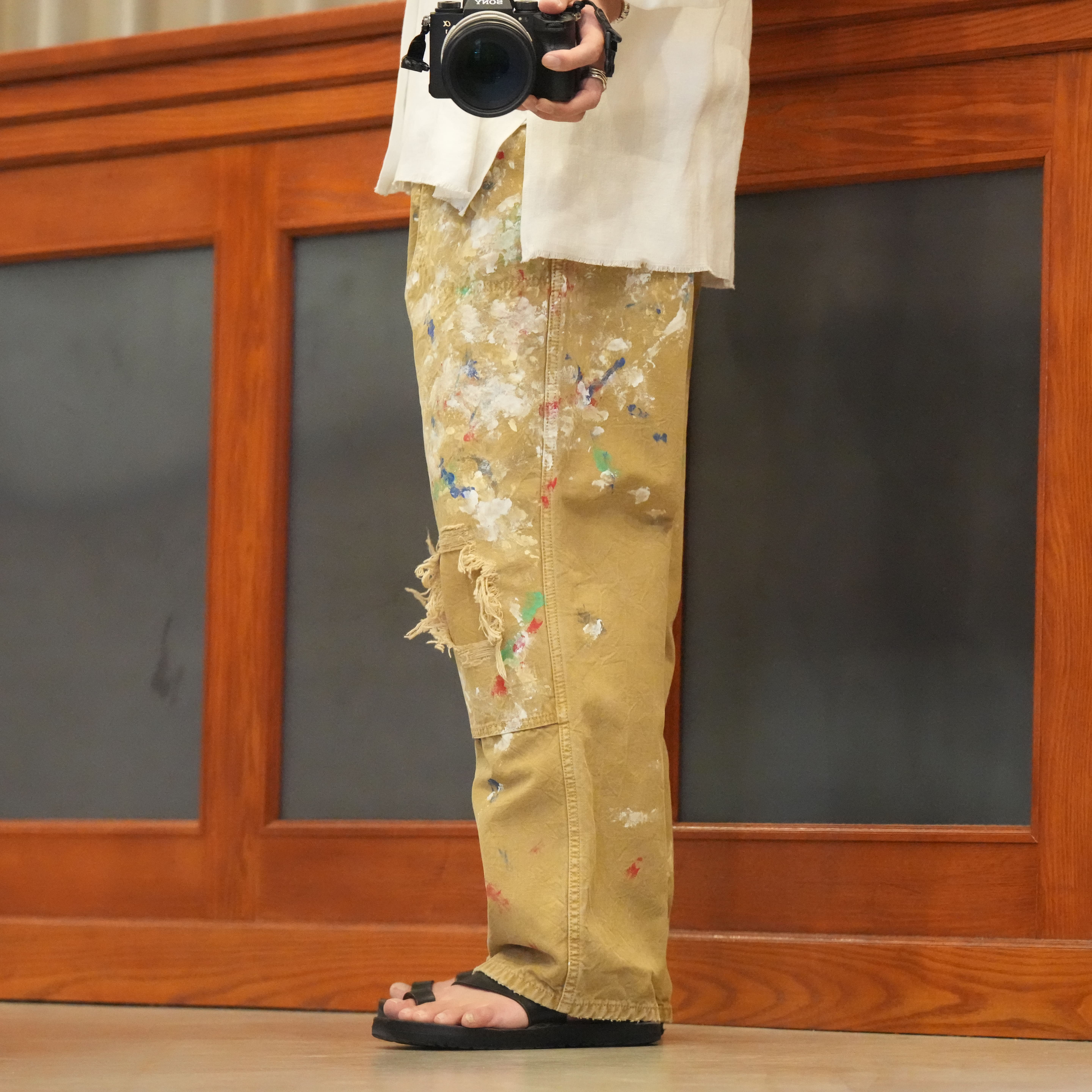 今回はいつものダック生地を使用しての、ダブルニー仕様。最近はカーハートのダブルニーにペンキを飛ばしている物も良く見ますが、やっぱりその辺りとは少し違います。大人が着ても良いと思わせるペンキのバランスとシルエットの良さ、僕らが好きなスタイルには取り入れたいと思わせてくれる1本です。