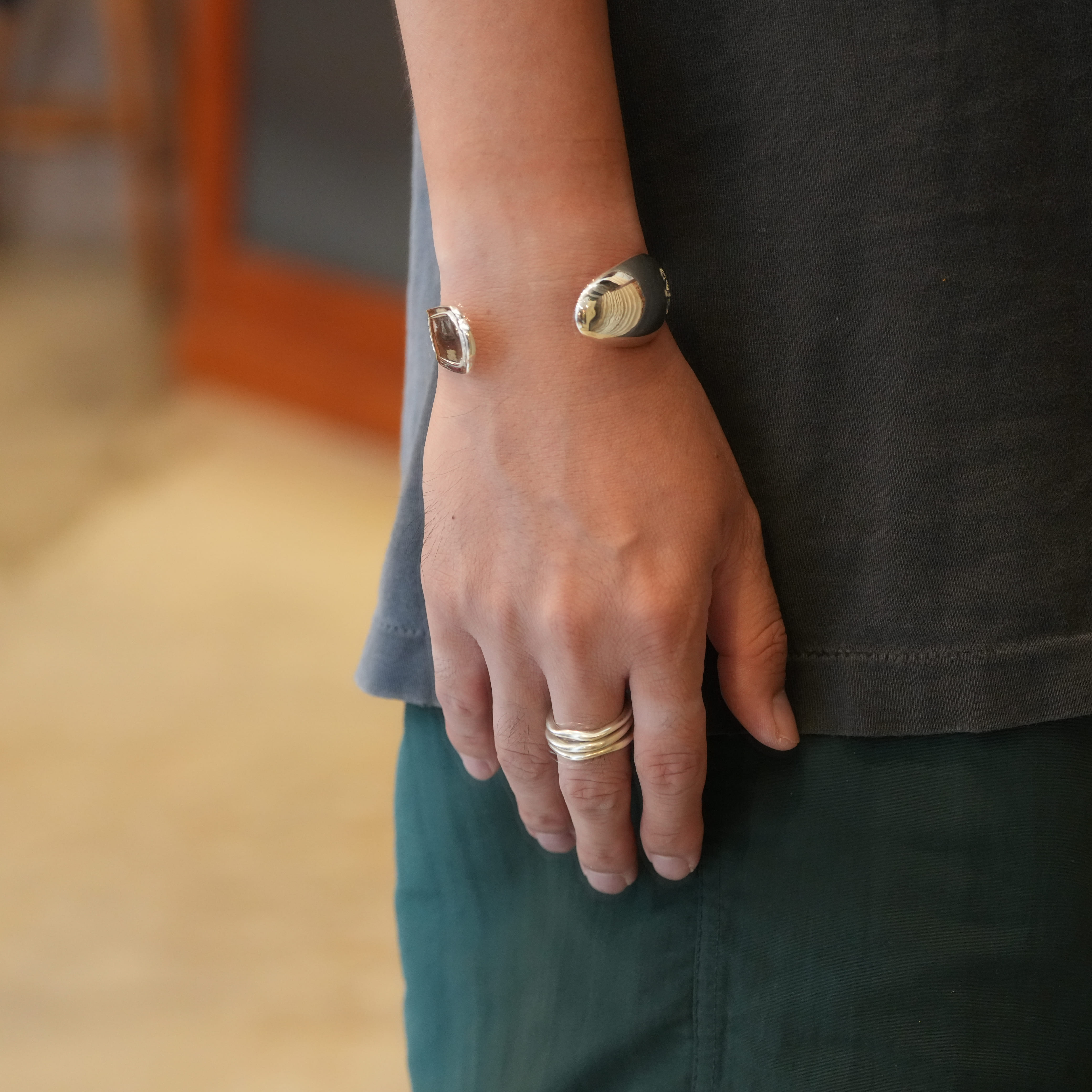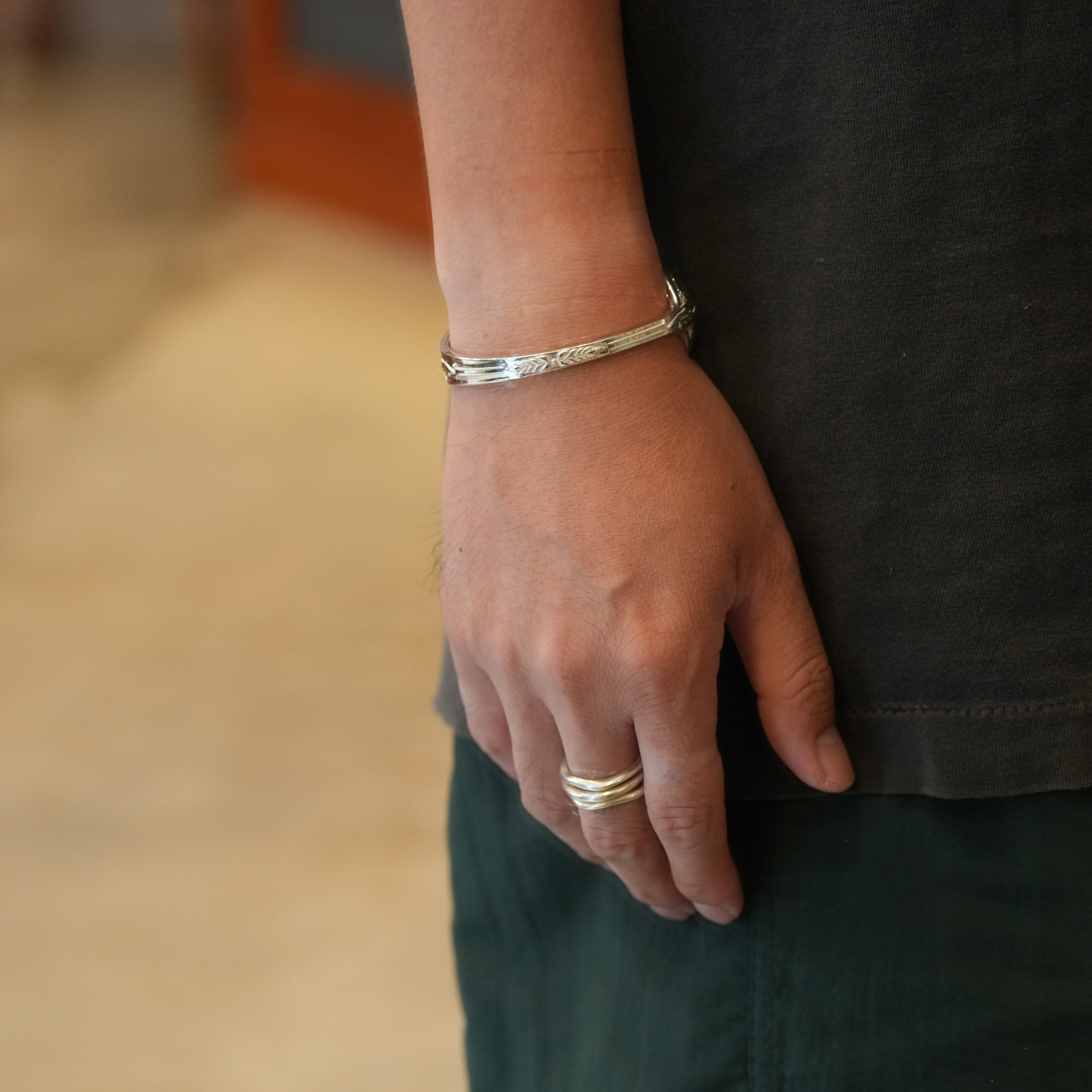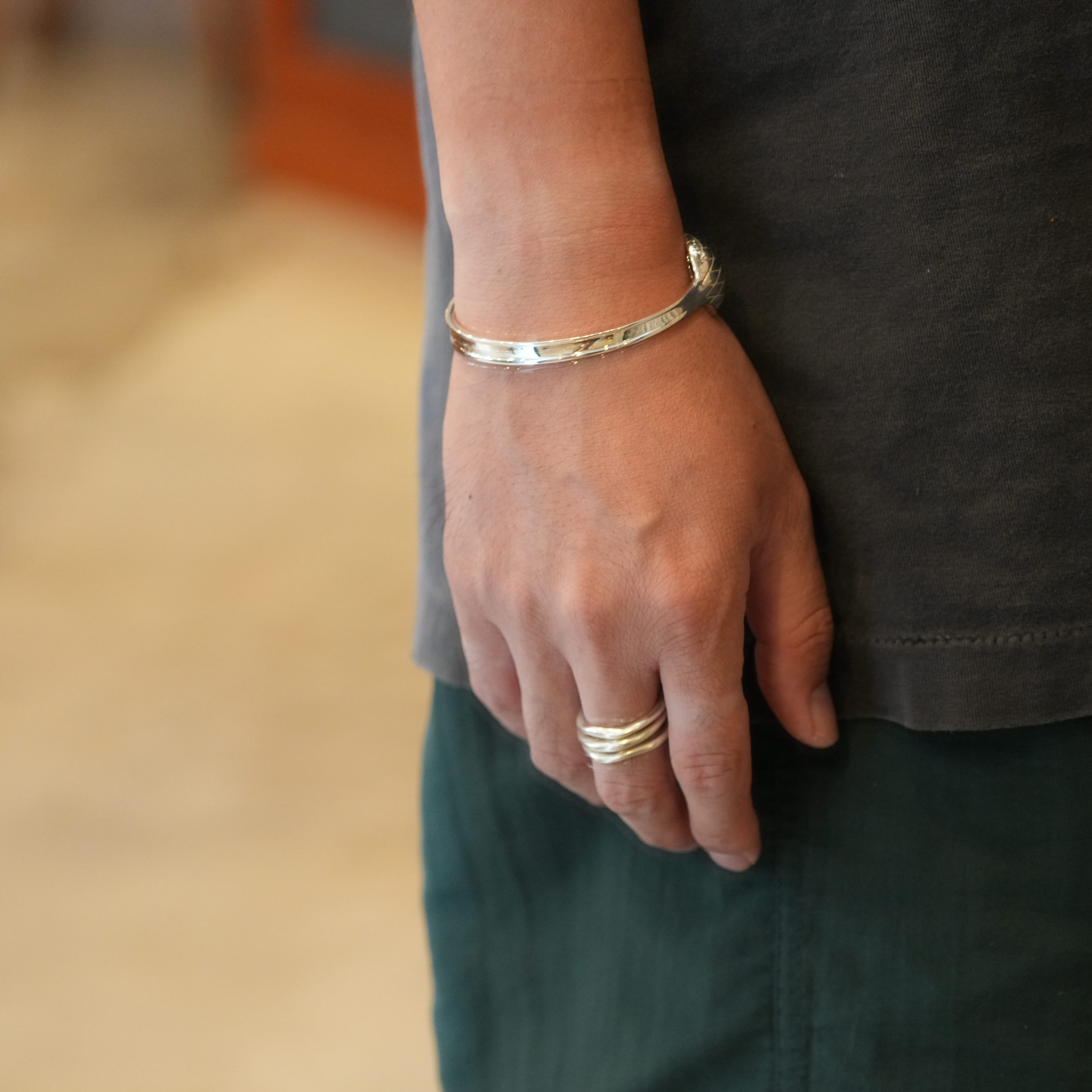 バングルとしてはシンプルなデザインなのでワンポイントで付けるも良し、重ね付けも良しです。当店のお客様でしたらジルとの重ね付けなんて良いと思いますよ。