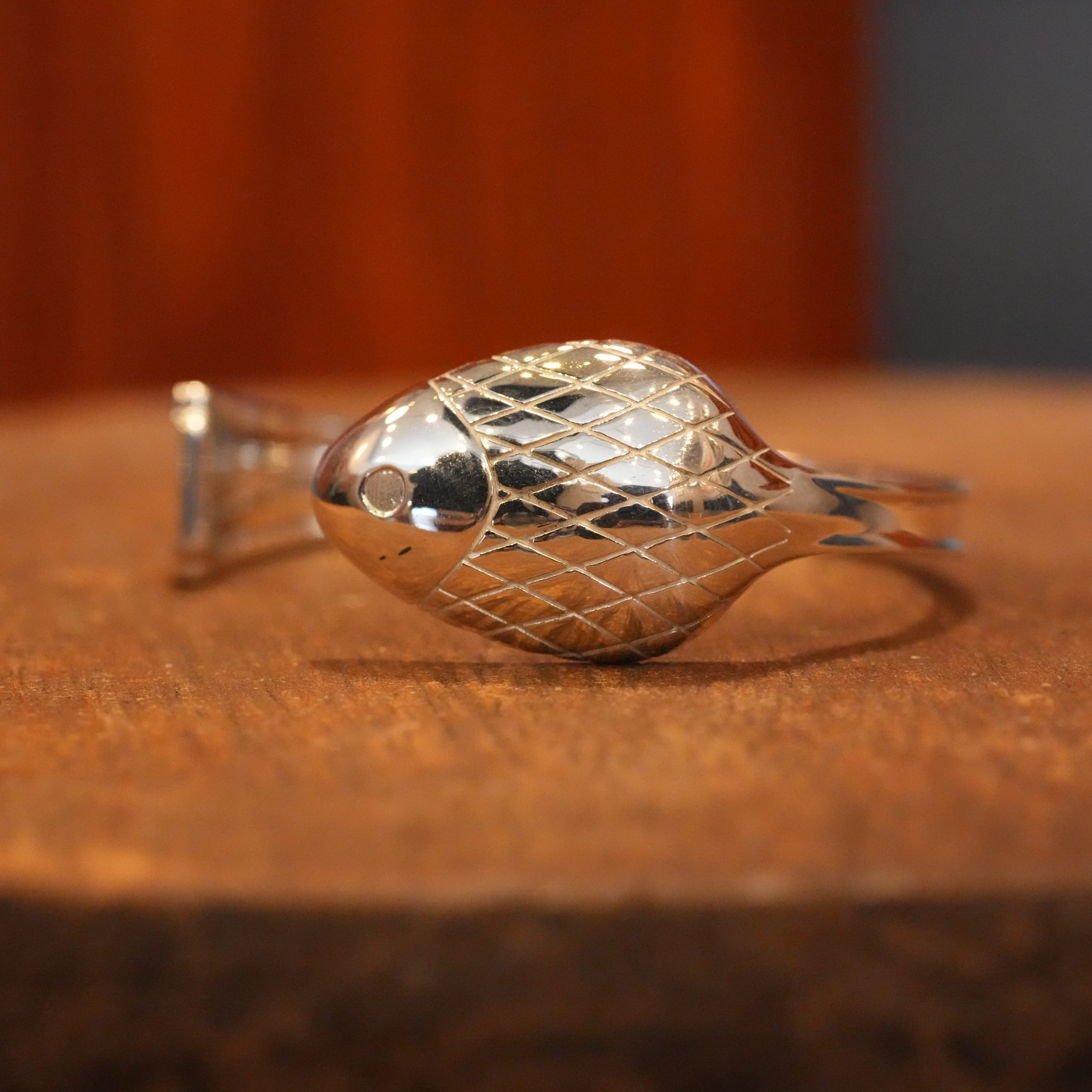 ヴィンテージフォークを使ったバングルなどマルジェラなんかでも展開されたりしていますが、そちらをモチーフにデザイナーの佐々木氏の趣味でもある釣りを掛け合わせたデザインになっています。