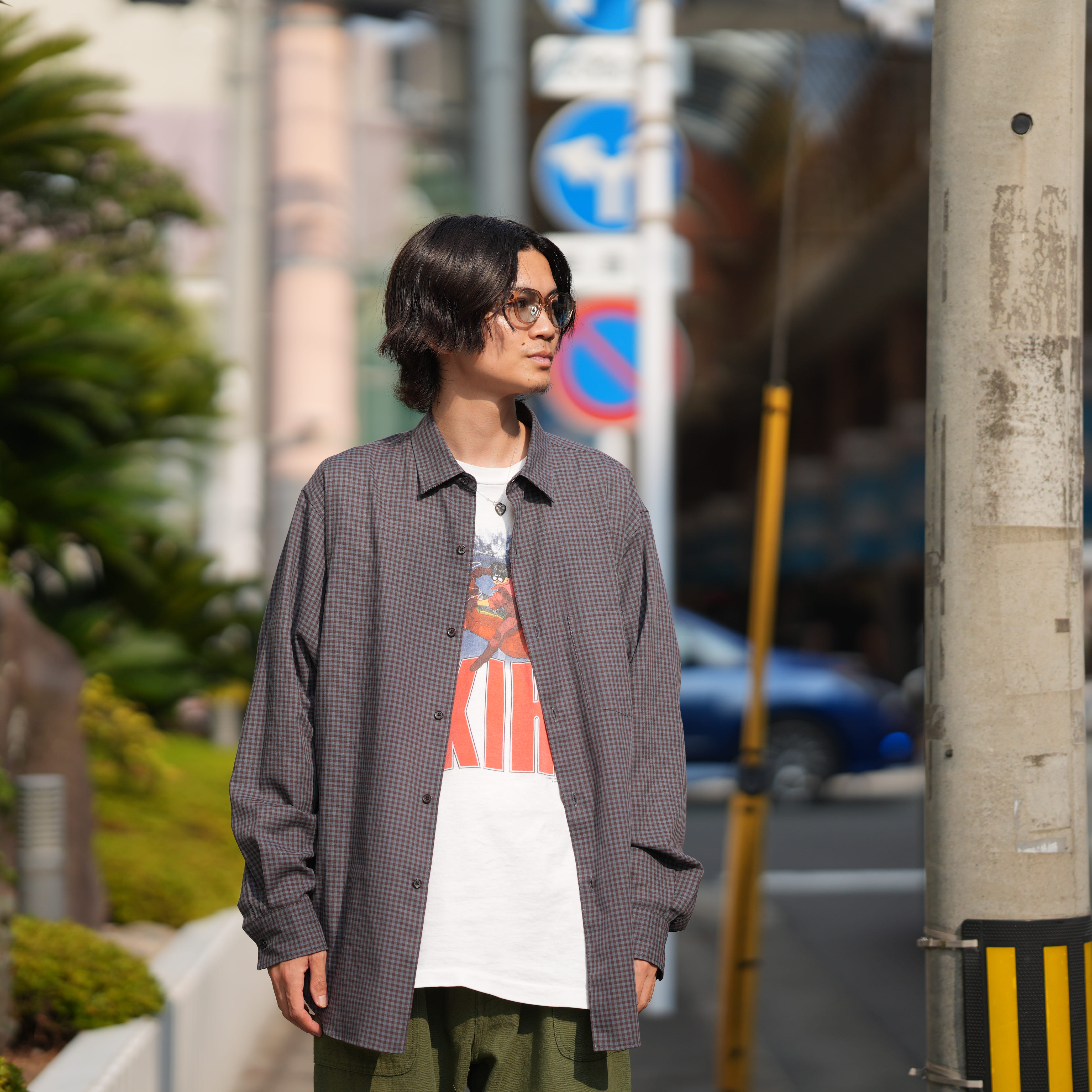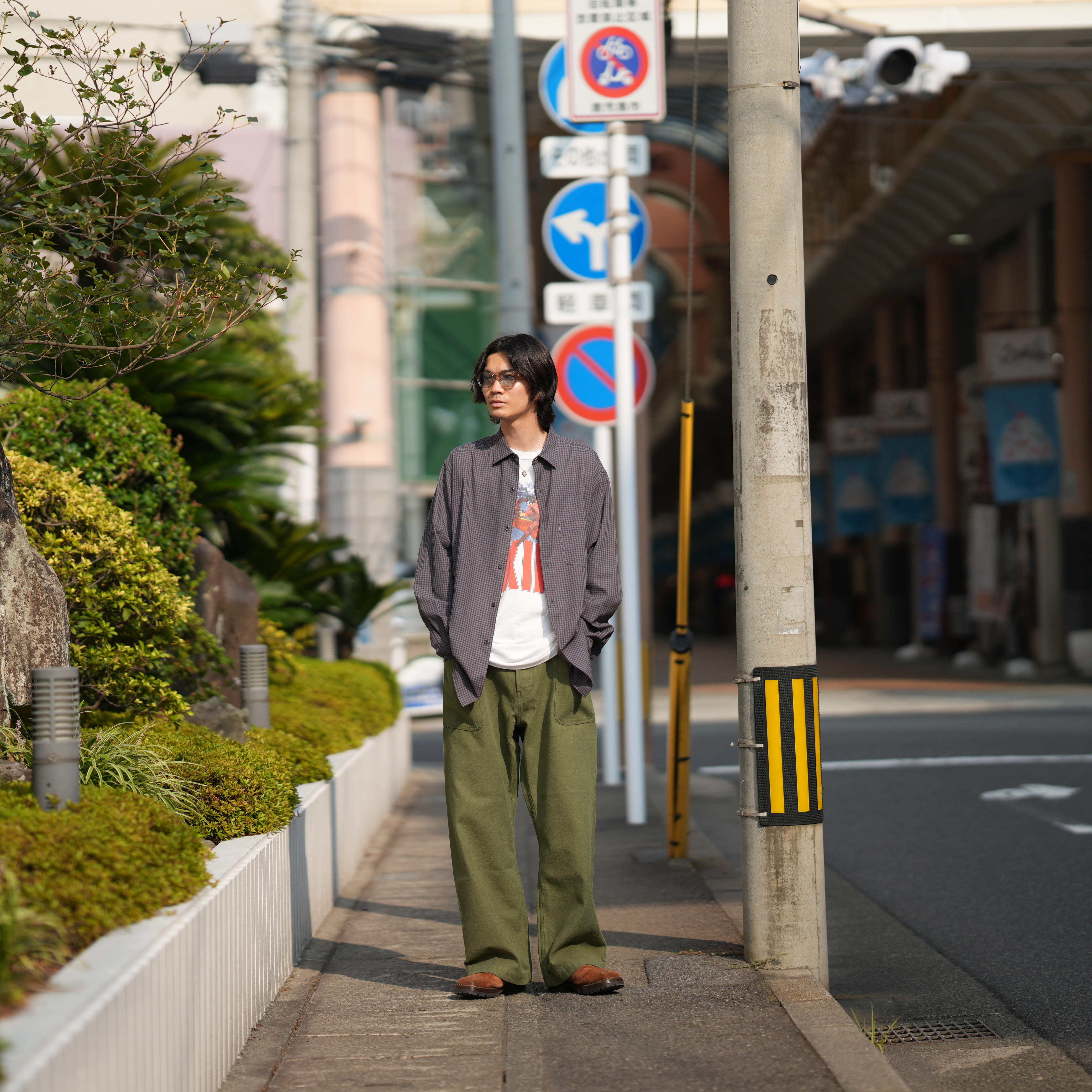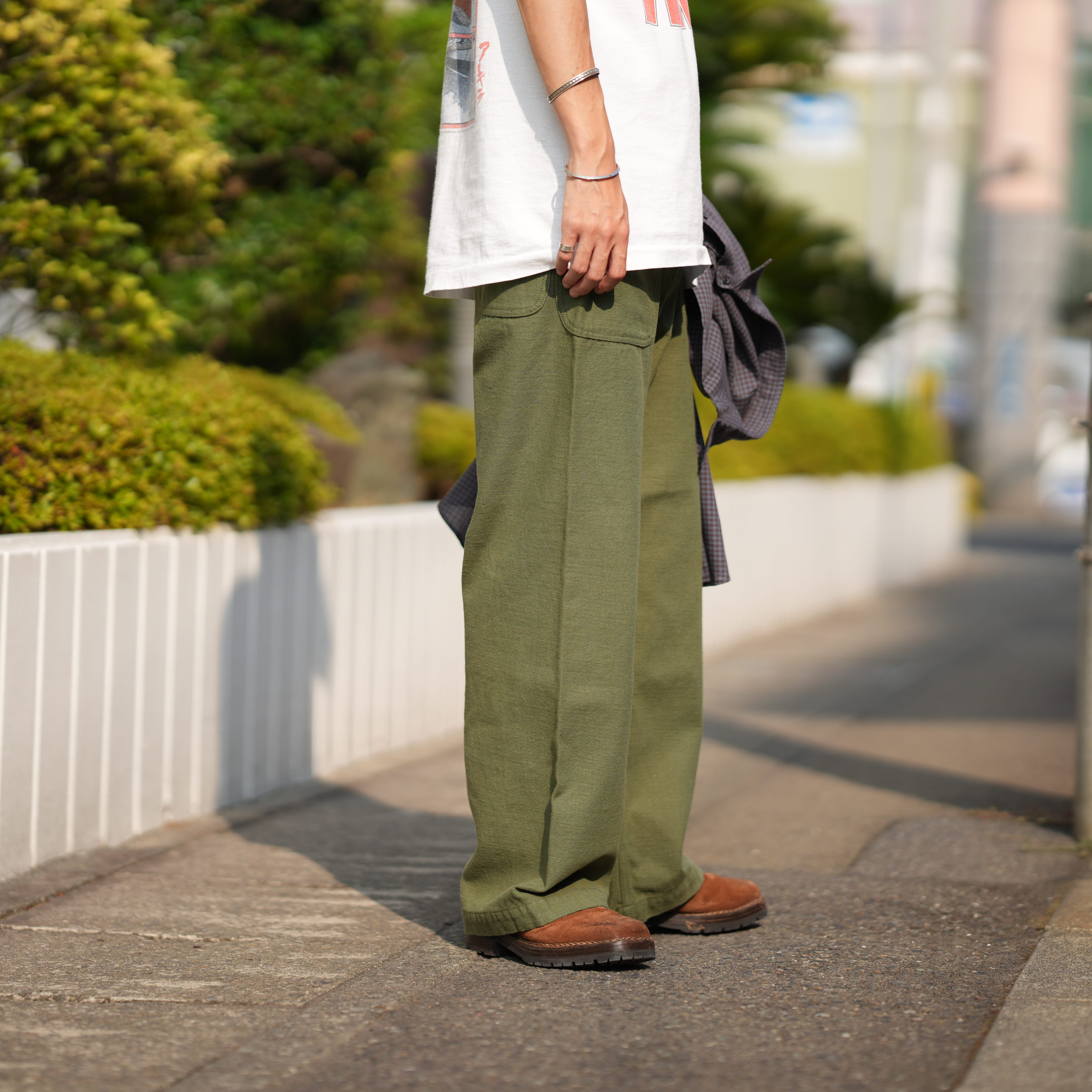 こんな感じです。ヴィンテージTにシャツで上品さを出しています。四枝さんと同じく軍パンも好きです。足元はレザーシューズを履くことが多いです。