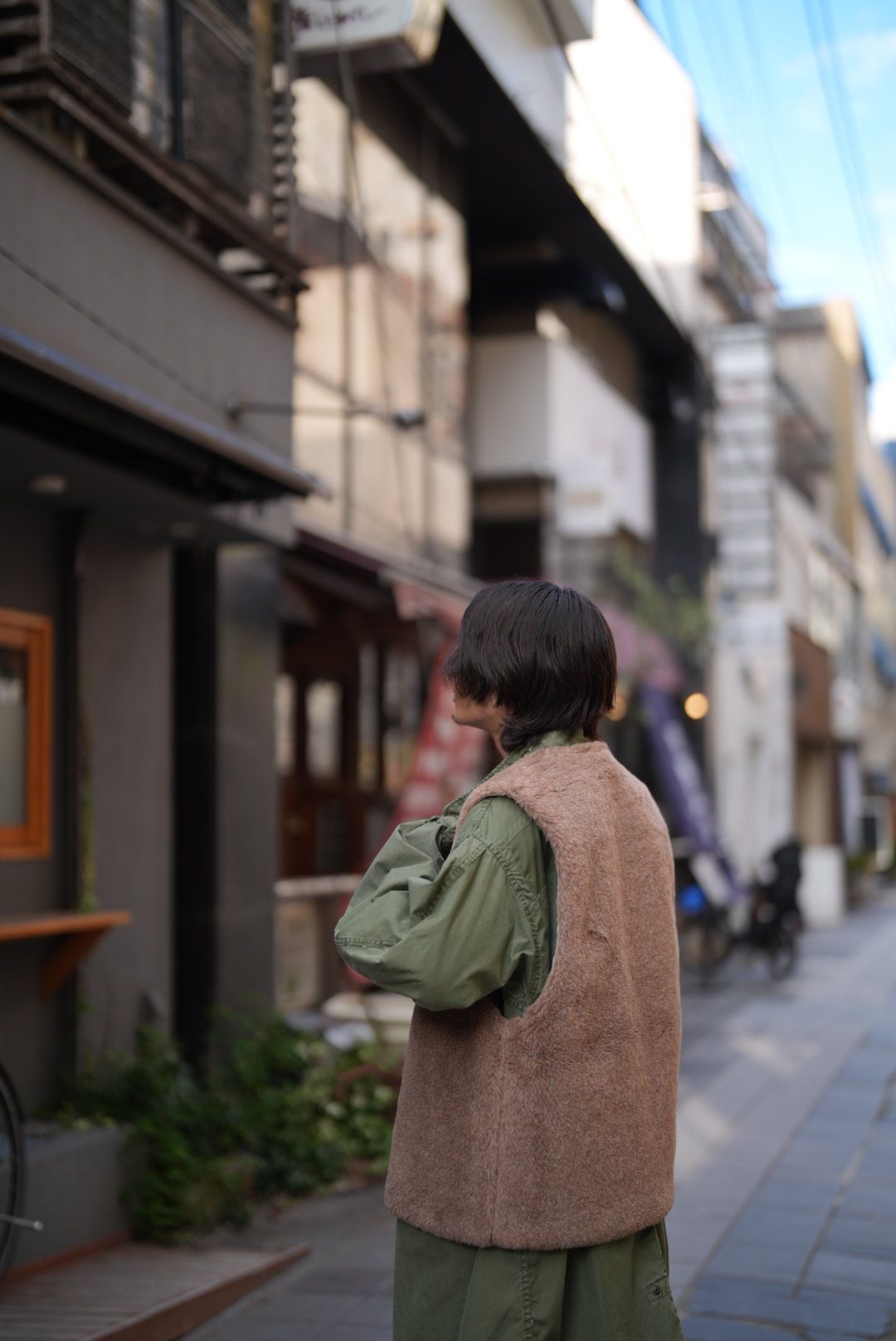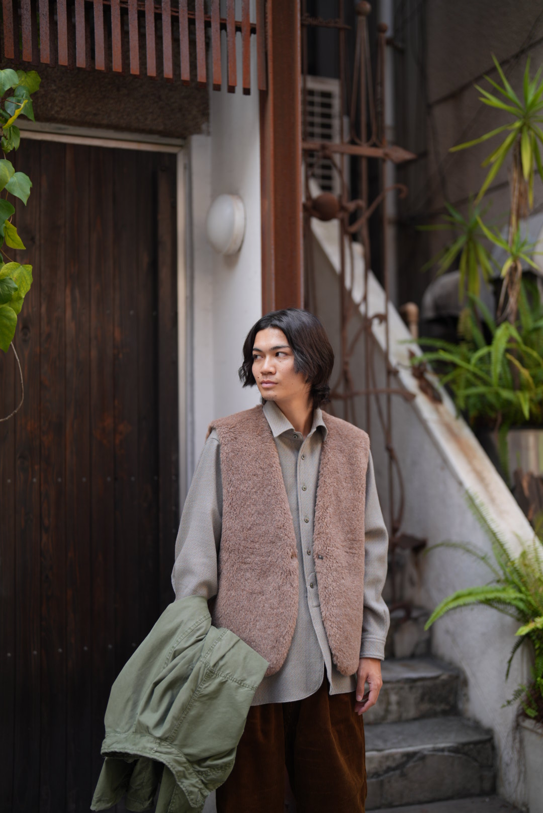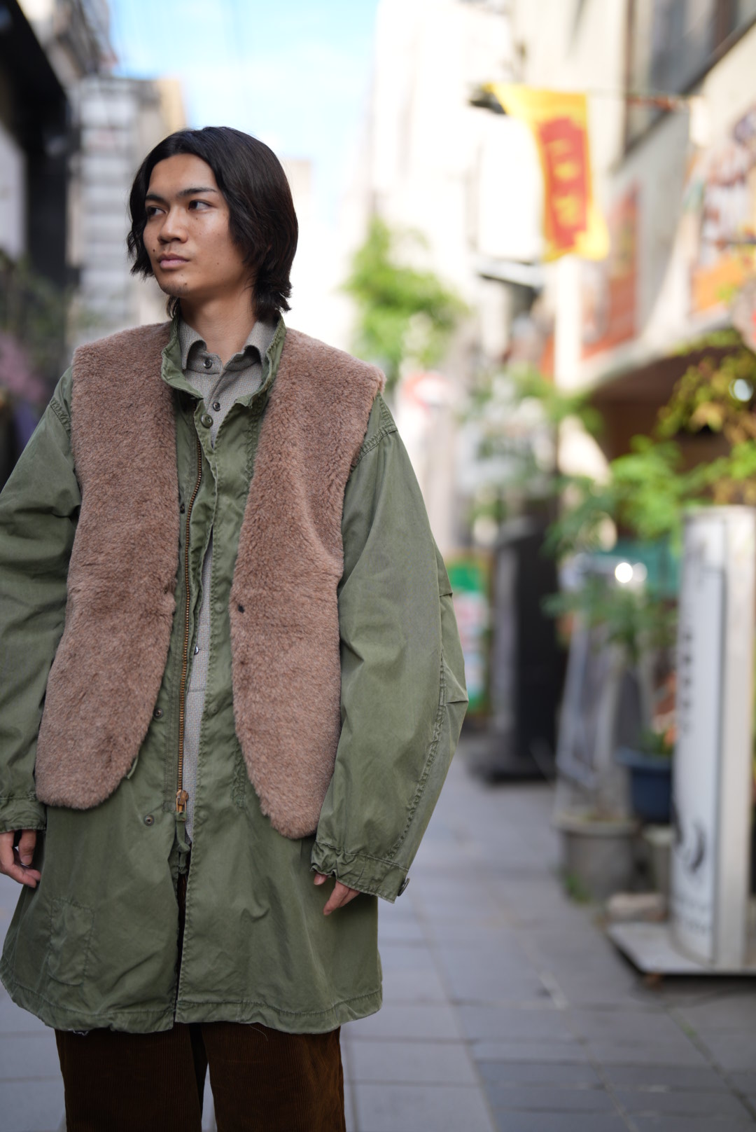 シンプル過ぎるアイテムにはベストがオススメではありますが、この手のベストはなかなか無いと思います。しかもボアベストの毛足長めで、これだけ無骨な雰囲気が出るというのも不思議なものです。