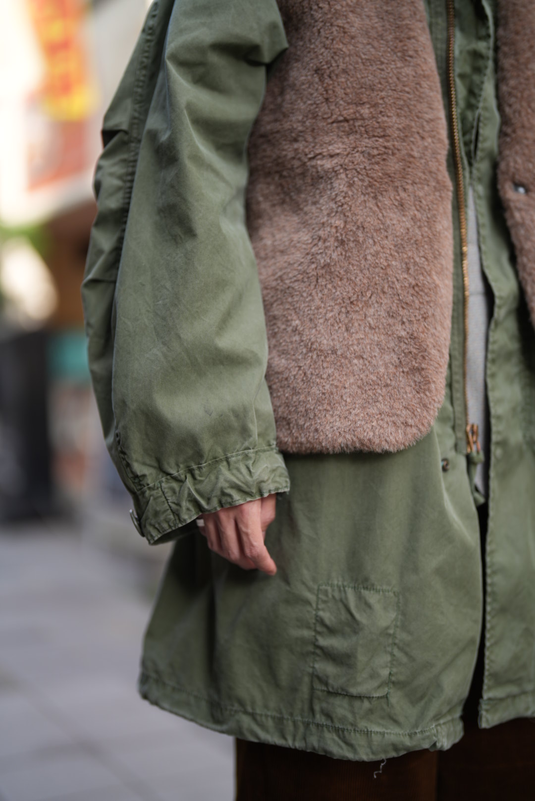 ミリタリーの生地に全くの異素材を合わせる、その違和感が良いアクセントになっている。