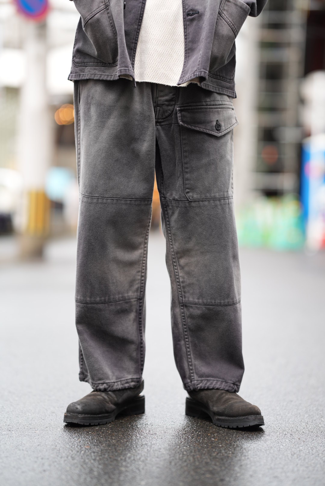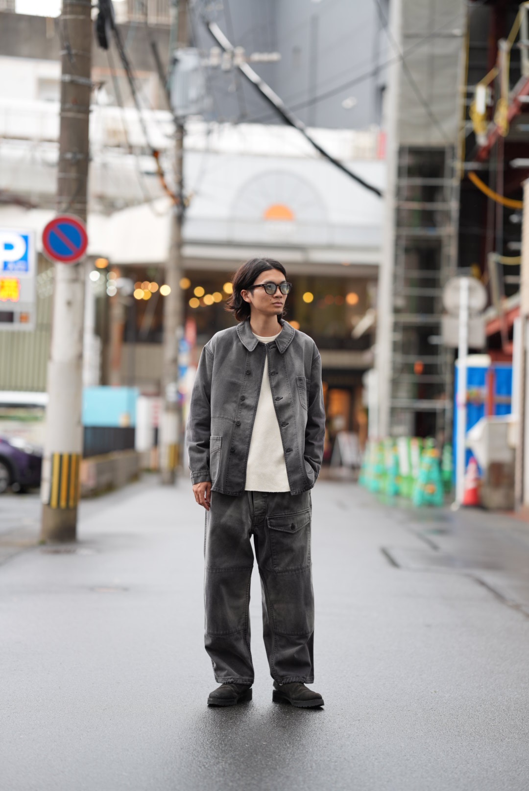 色ムラ感は窓辺のフックに襟つりでかけたまま放置されたカバーオールが太陽光線で日焼け、脱色したイメージを目指したそうです。もはやそのマニアックなサンフェードすらも超えた、アートとも呼べるフェード感に仕上がっています。