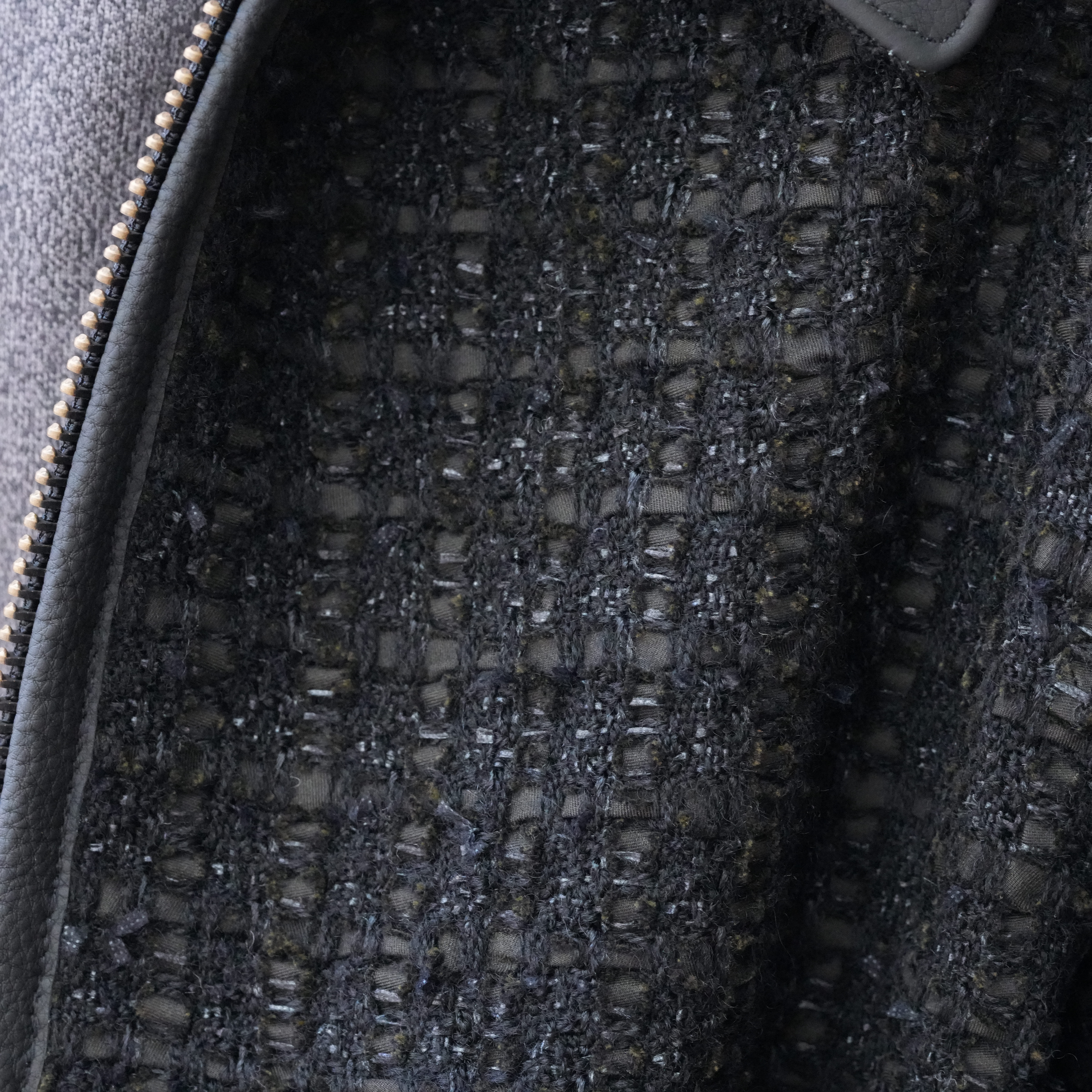 フランス本国のシャネル社が依頼している日本でほぼ唯一とも言えるシャネルツイードを量産している機屋に依頼したもので、現存する木製シャトルを駆使するションヘル織機を超低速で動かしながら織り上げた物。