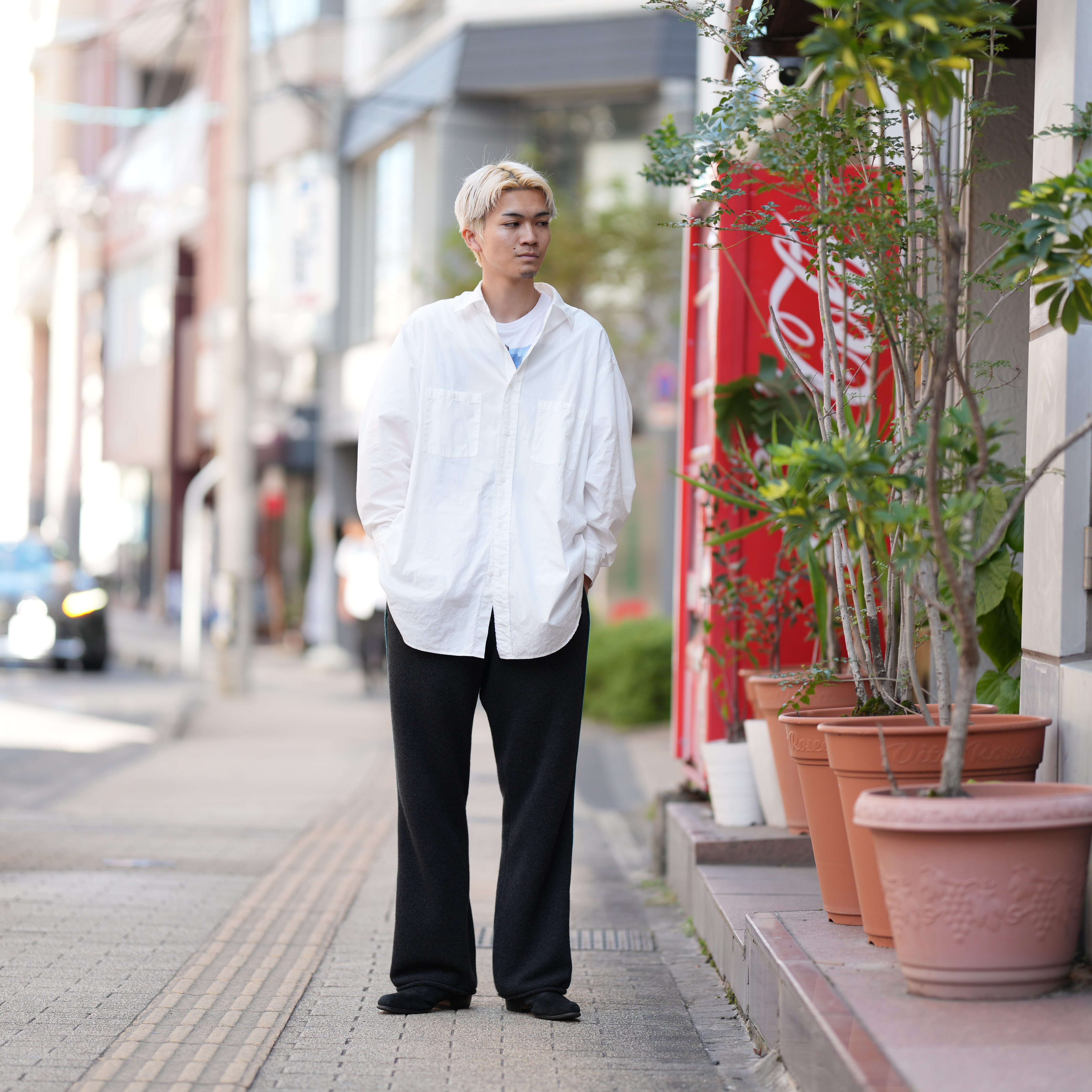 パンツはオーベルジュ定番のシルエットのパンツ。イージー仕様で楽に着用でき、しっかりボリュームがありながらレングスが長すぎない、いいバランスのシルエットです。