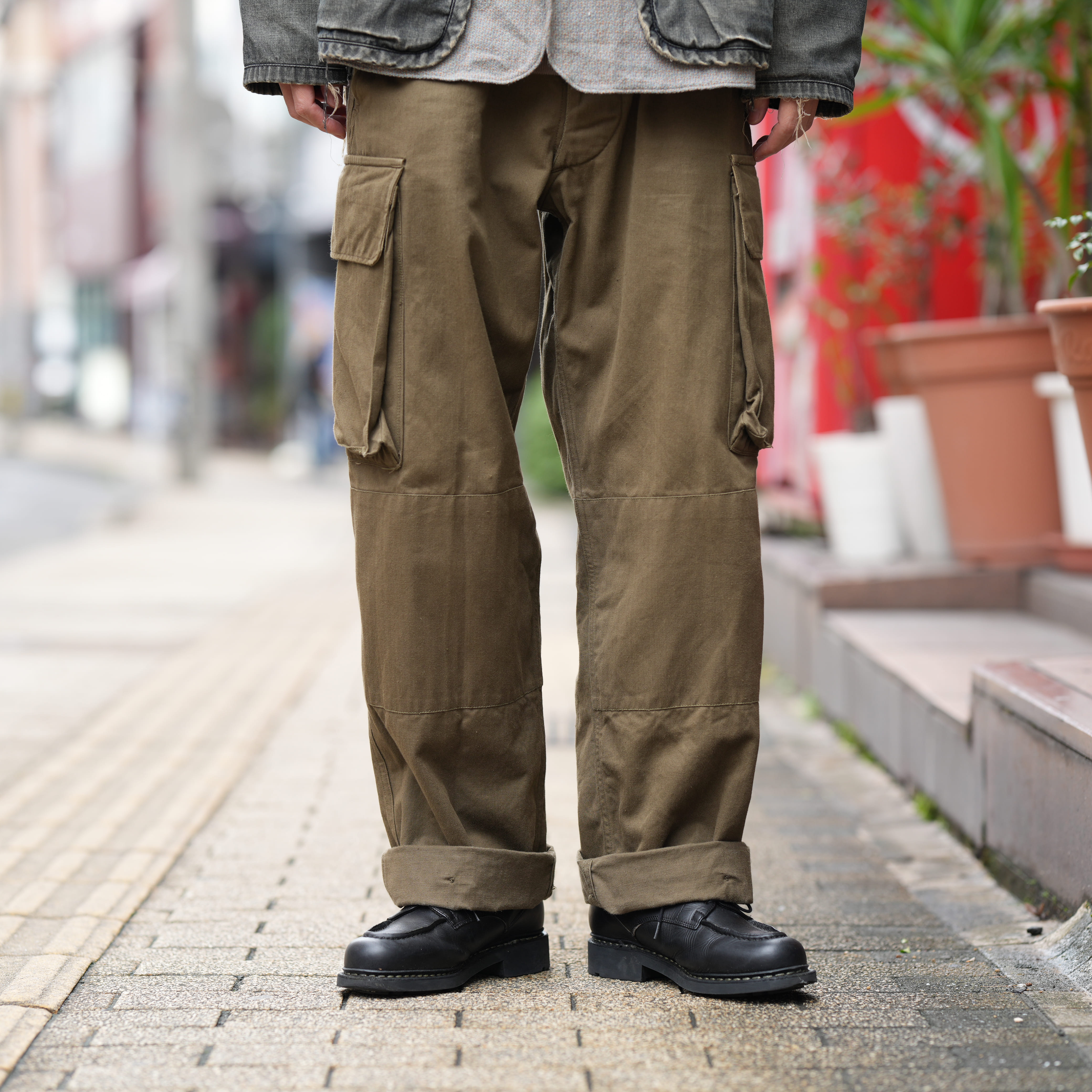当時のサイズ2なので今でいうところのサイズ3になります。初期はフラシで穿けるんじゃないかっていう長さだったので縫い代が短いのが写真でも分かるかと思います。雰囲気はスラックス、ディテールは軍パン、裾はデニムっていうのが僕の軍パンです。