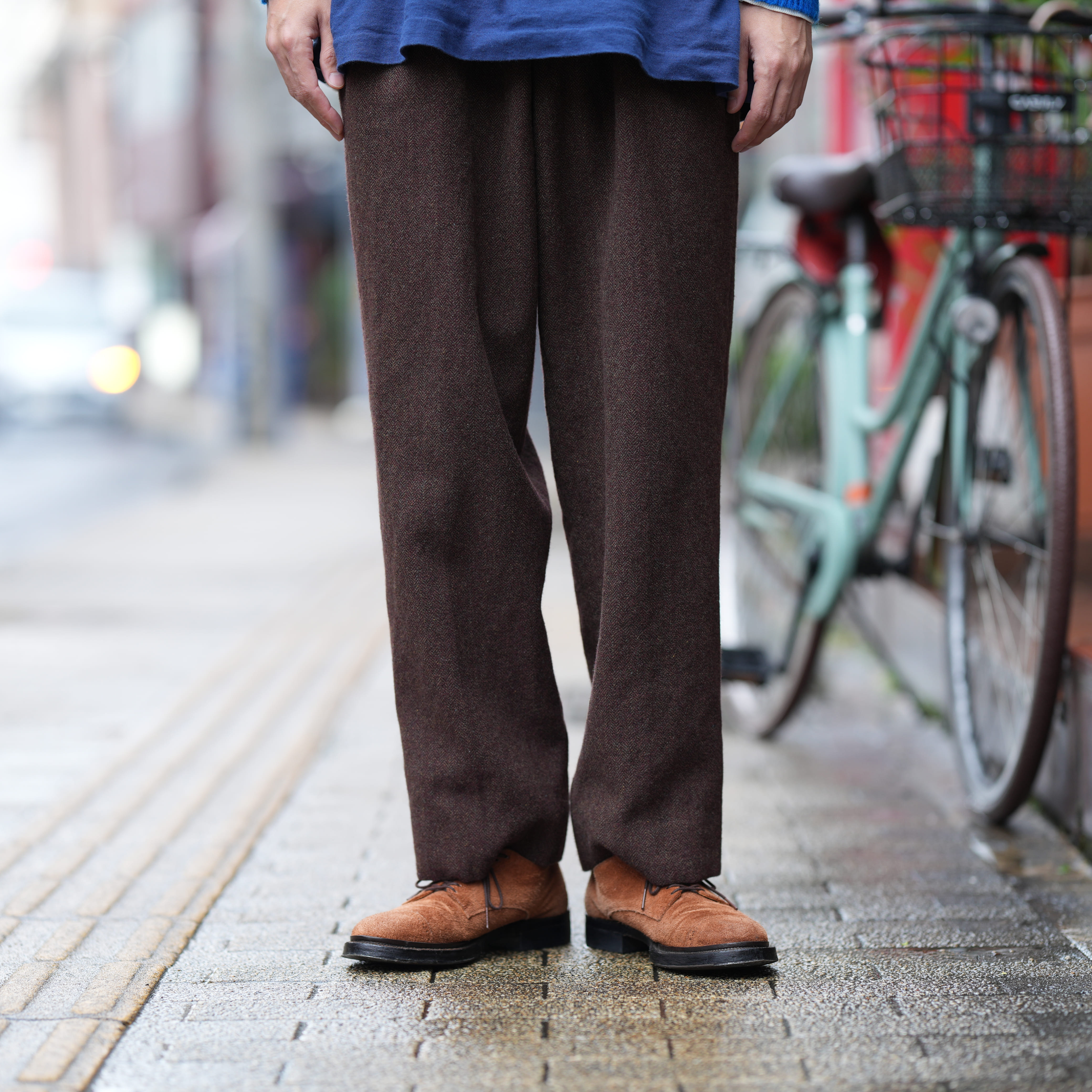 クリースが取れたことでいつもの位置で綺麗に穿くだけでなく、少し落としてカジュアルに穿いたりと着こなしの幅を楽しめるようになった気がします。この生地の厚みでも、何色もMIXした美しい色味は上品な雰囲気があって、スタイリングのいいアクセントになります。通年穿ける素材が注目されがちですが、やっぱりその時期ならではの色や素材のパンツは穿きたくなりますね。