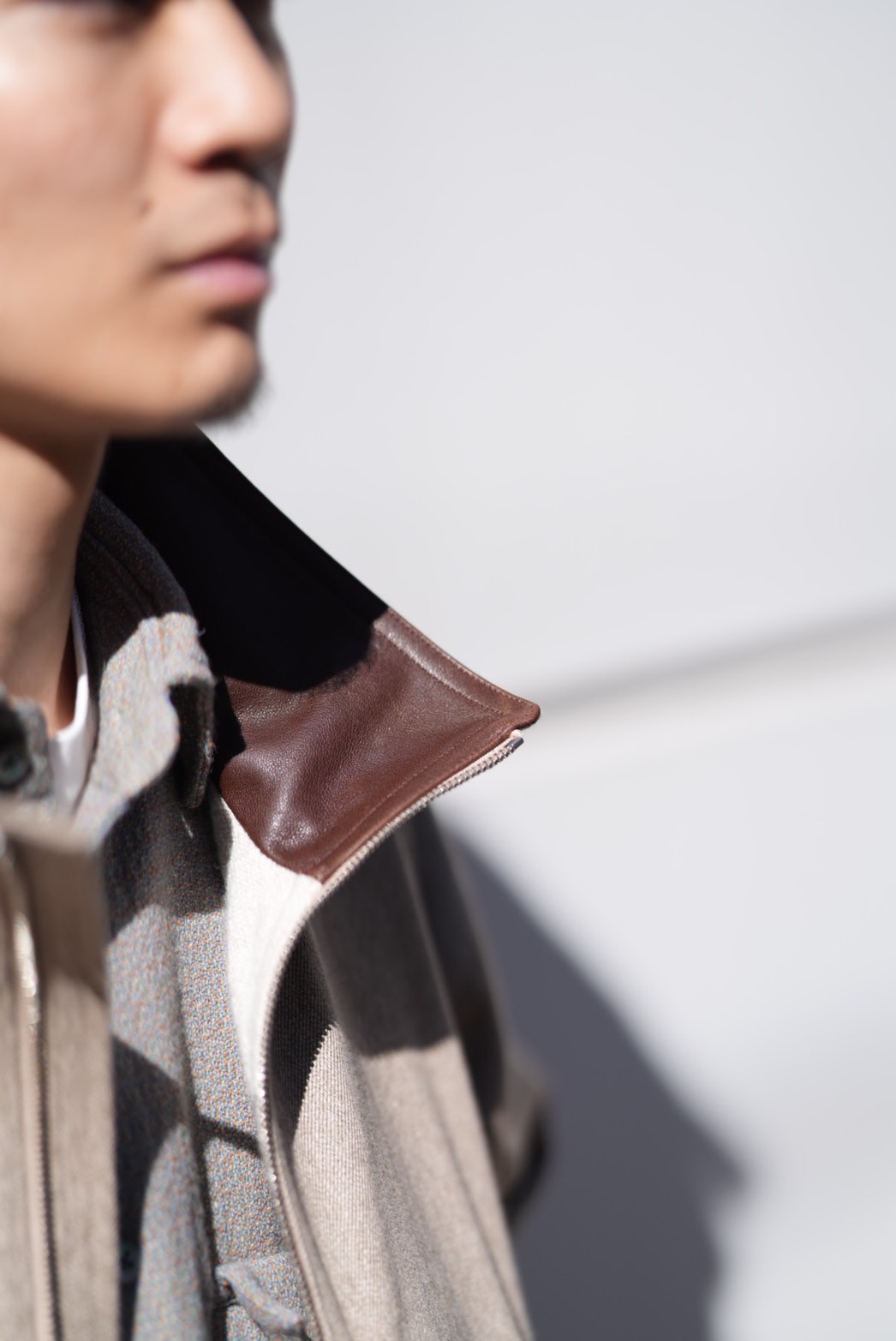 このレザーによって襟の立ち方が綺麗になり、形はスポーティーなデザインでも大人な雰囲気や上品さを醸し出しています。