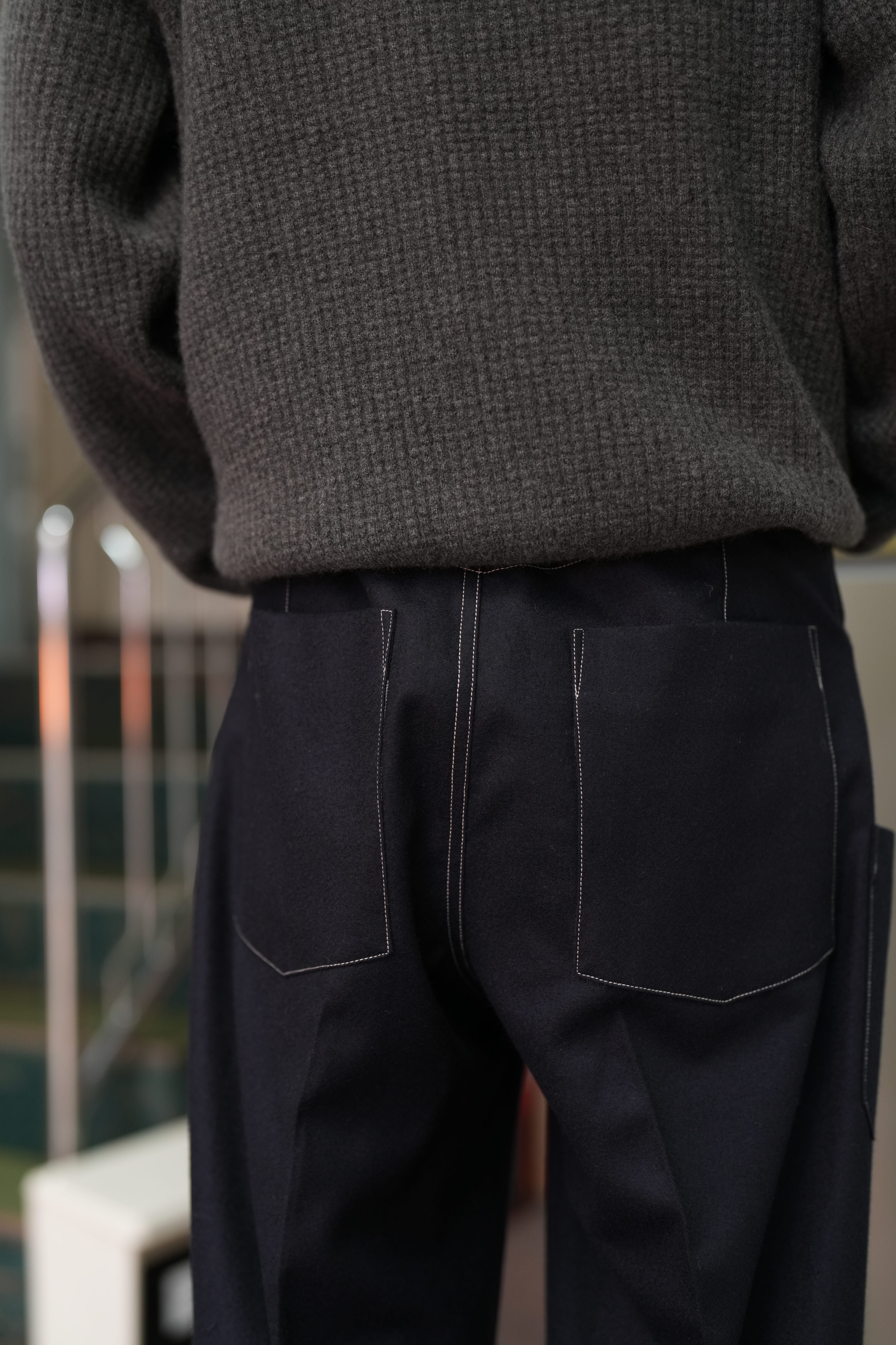 この辺りのディティールはゆったりスウェットやニットで被せてしまうと、無になってしまうのでそこは比較的ジャストサイズのニットをウエスト部分で溜めて着ることで、このデザインを活かすことが出来ます。