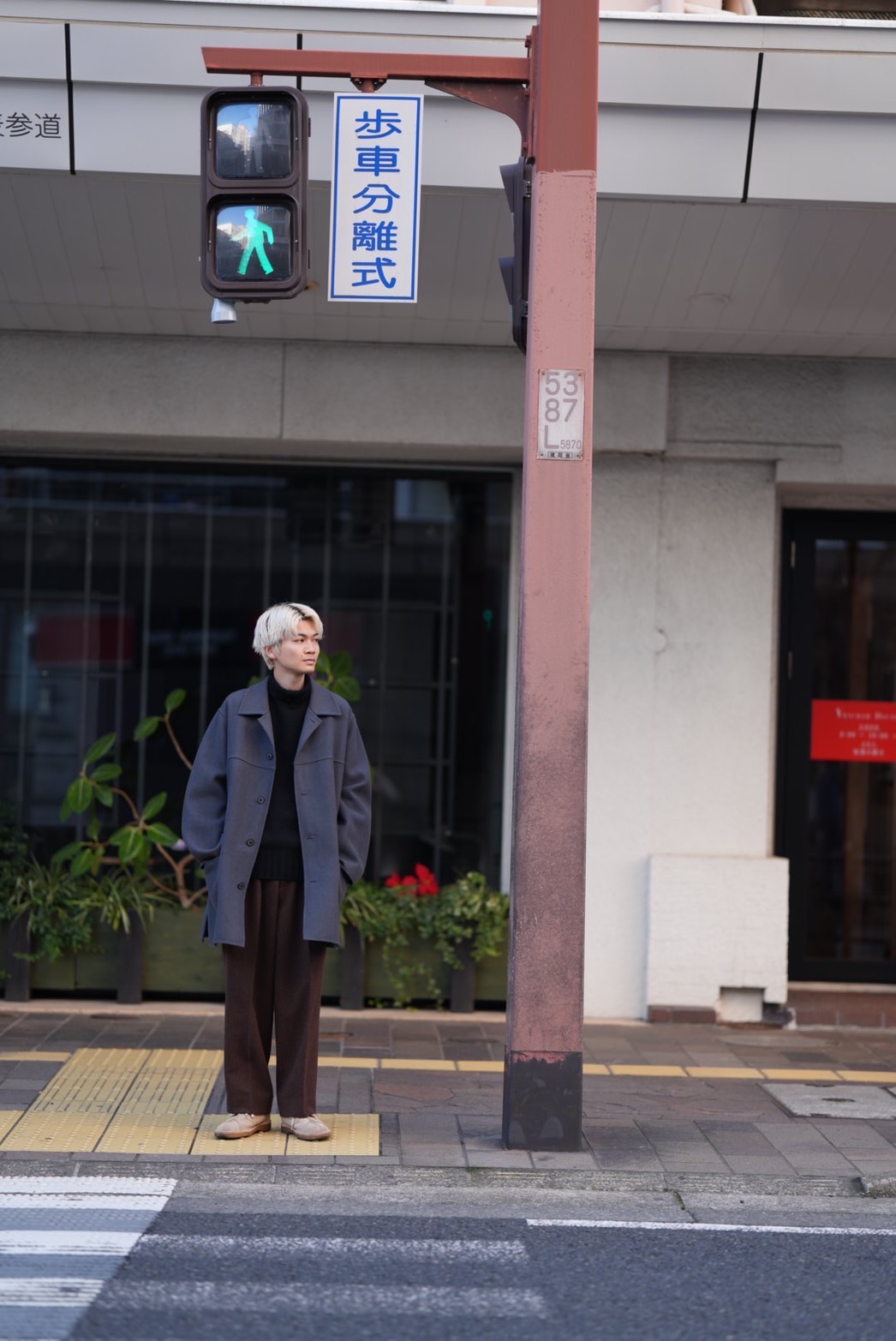 上品なコートらしく、タートルネックのニットとゴーシュのスラックスと合わせてクリーンなスタイリングにしました。