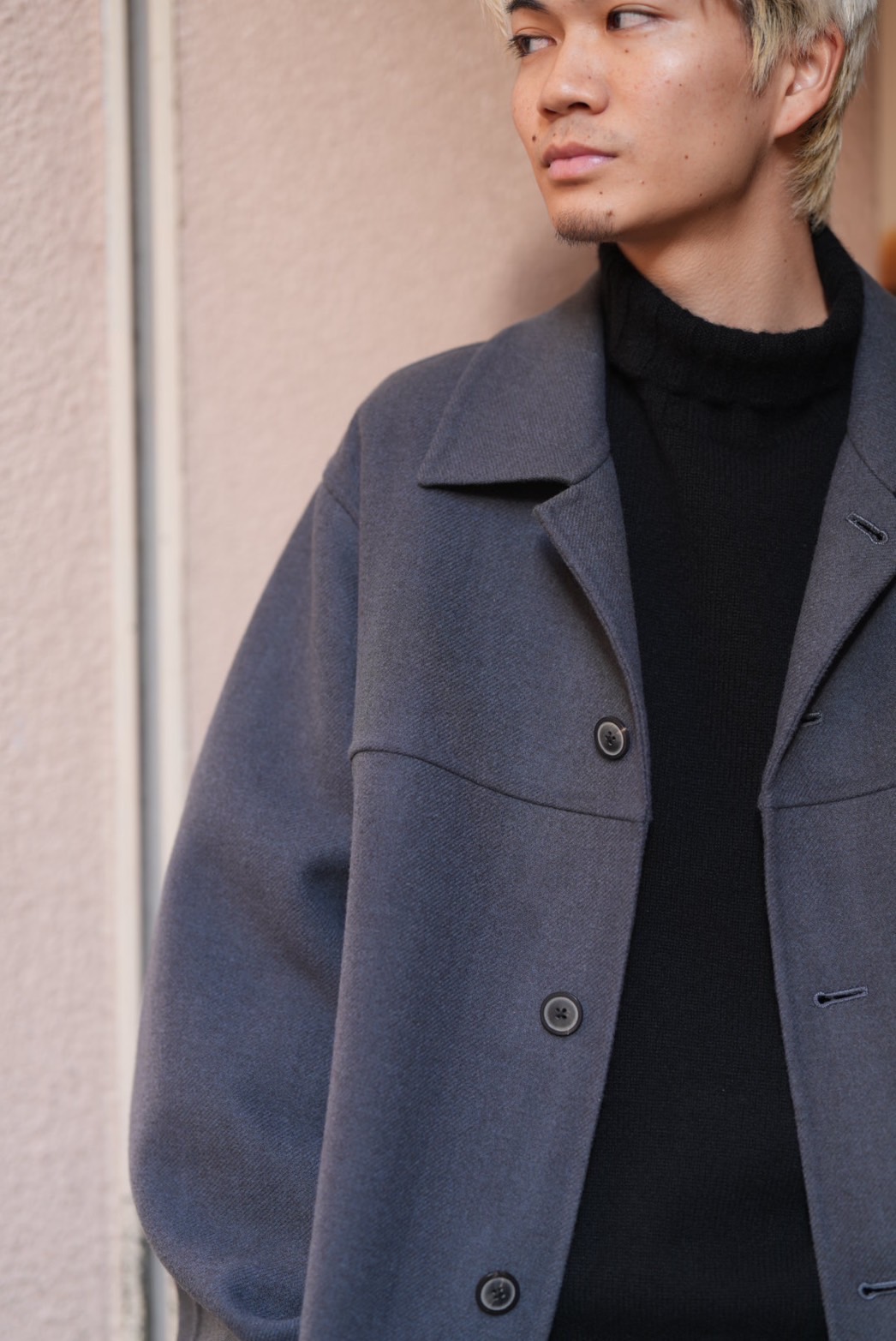 昔は車のシートが今よりもフラットだったので、もっと着丈の長いものもあったようですが、こちらは現代的に絶妙なミドル丈になっていることで、カバーオールとコートの中間のような感覚で羽織ることができるなど、使い勝手のいいアウターになっています。