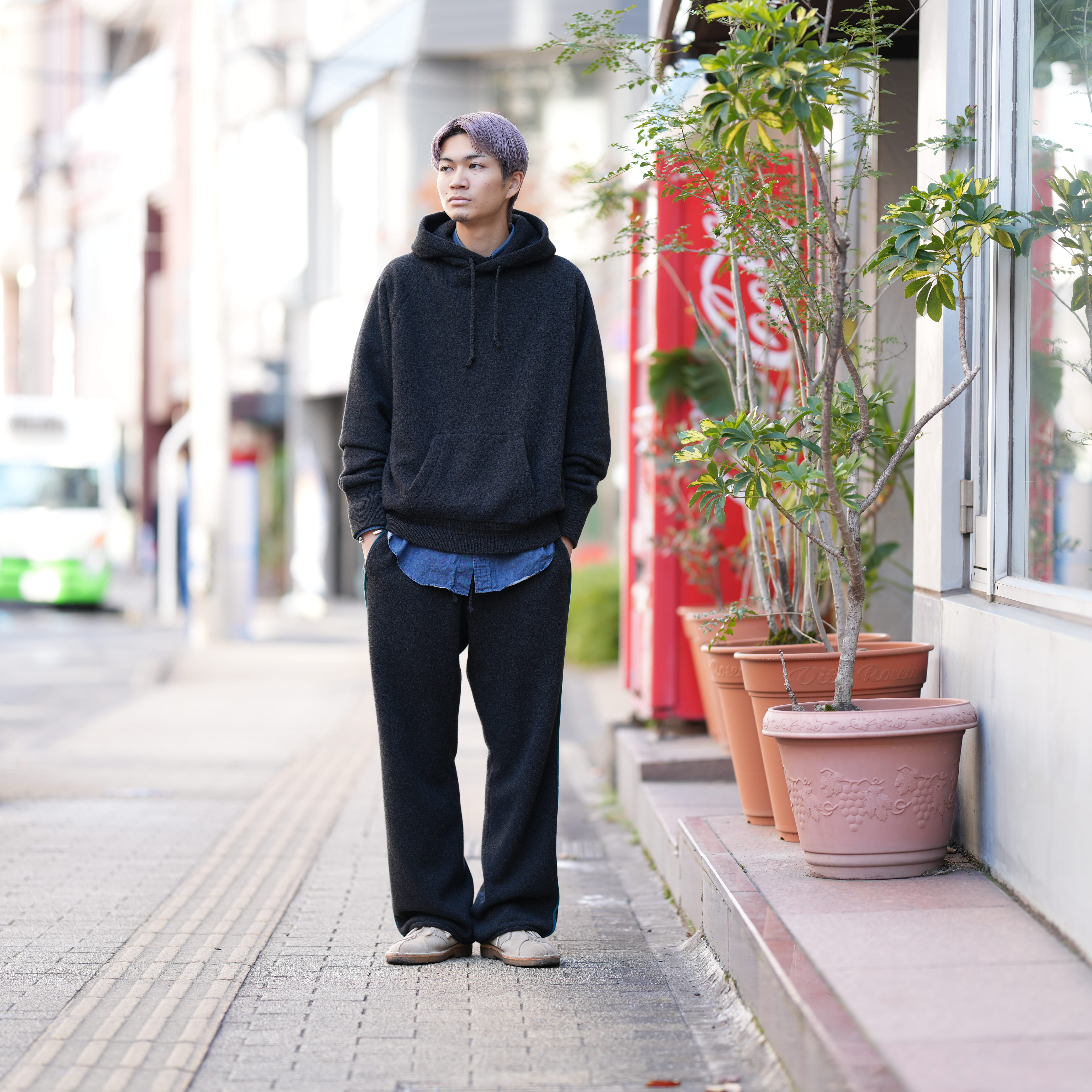 まずはフーディ。シンプルになりやすいフーディこそ生地の雰囲気や細かいディテールが大事だなと改めて思います。