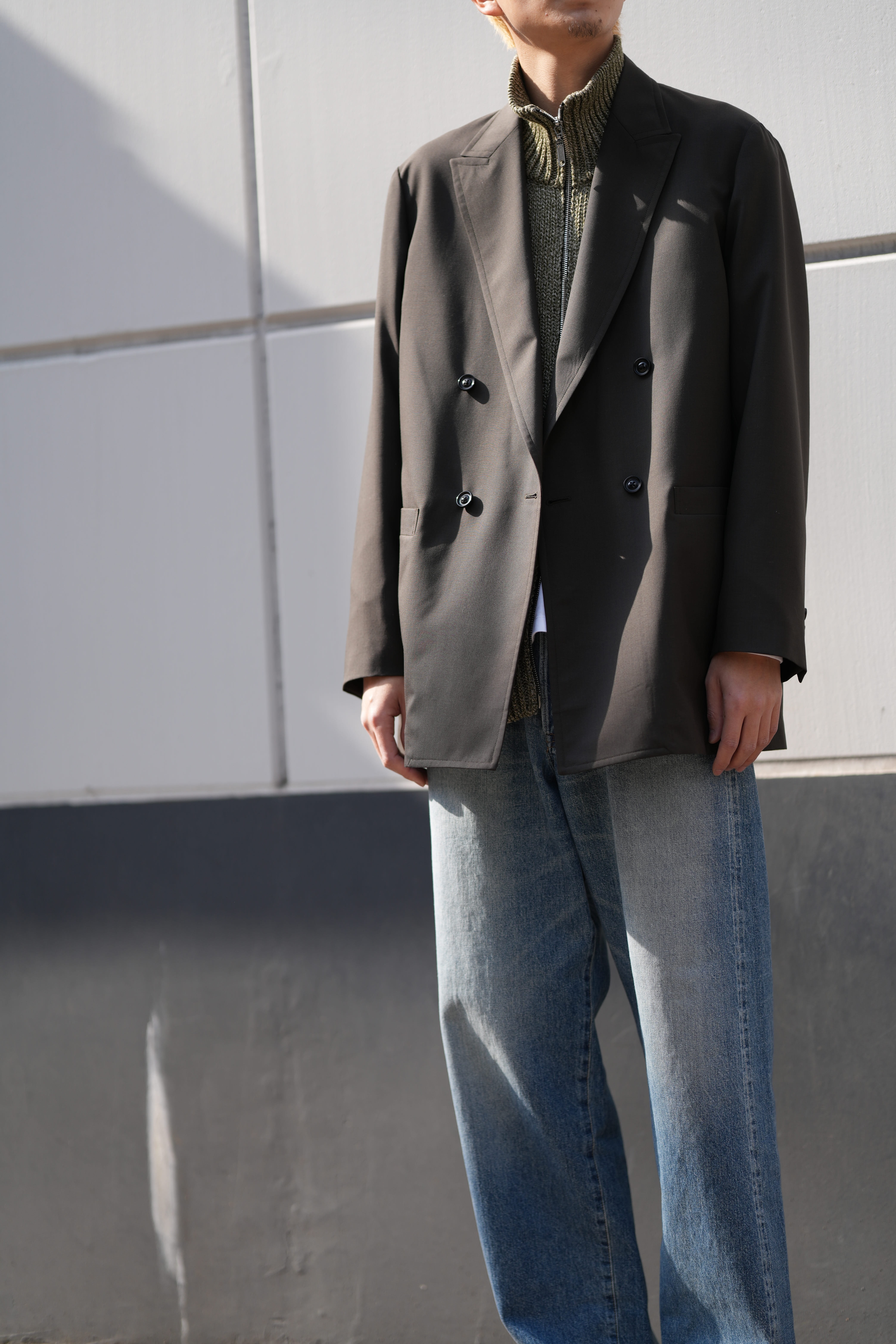 サイズ感に関しては176cm53kgのスタッフでサイズ3を着用してちょうど良いぐらいです。肩周りは少し余裕のある程度で、アームは綺麗なラインを描きます。身幅はダブルの中でもたっぷりと取られているサイズ感になっているので余裕を持って着用していただけます。
