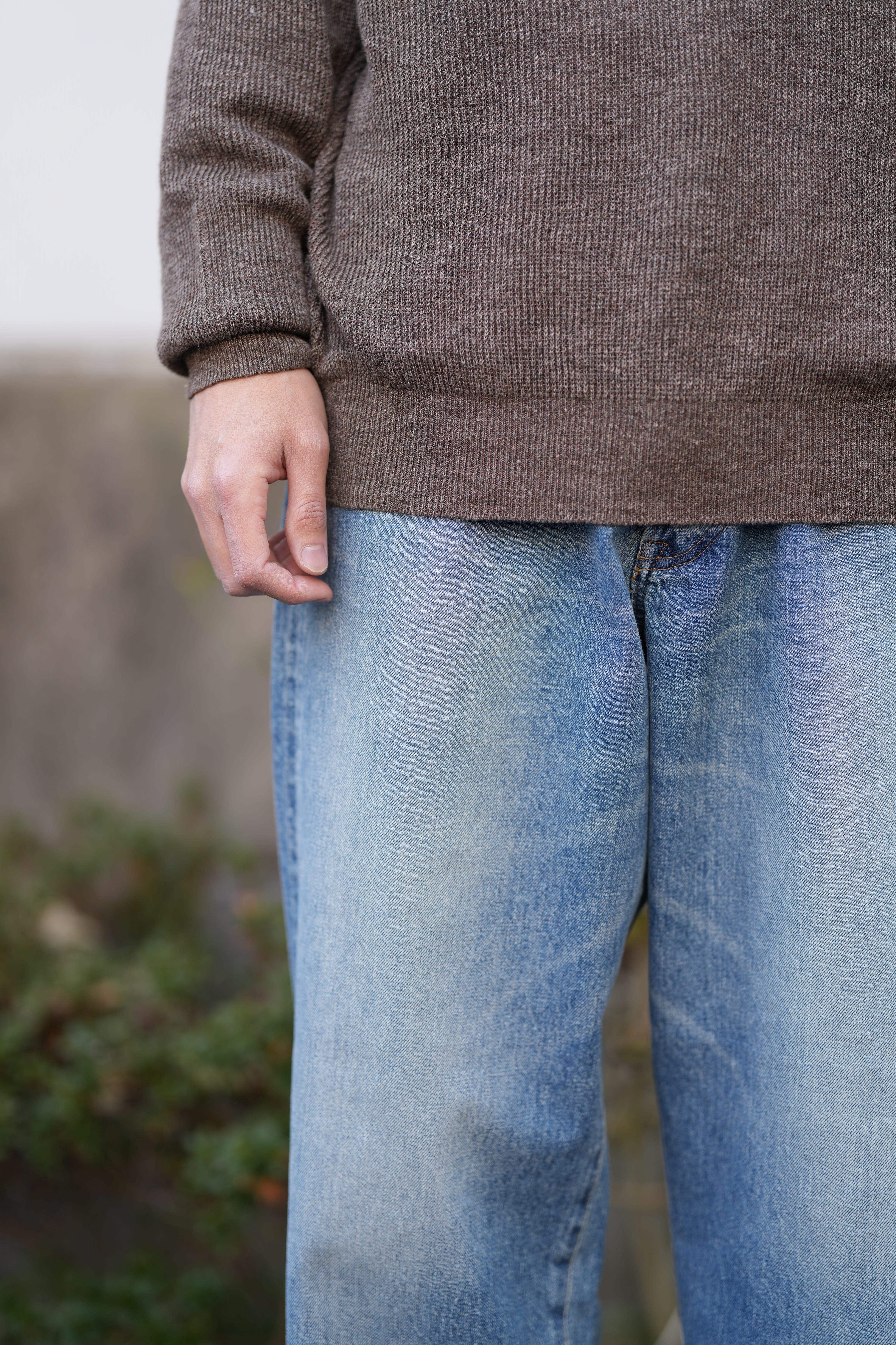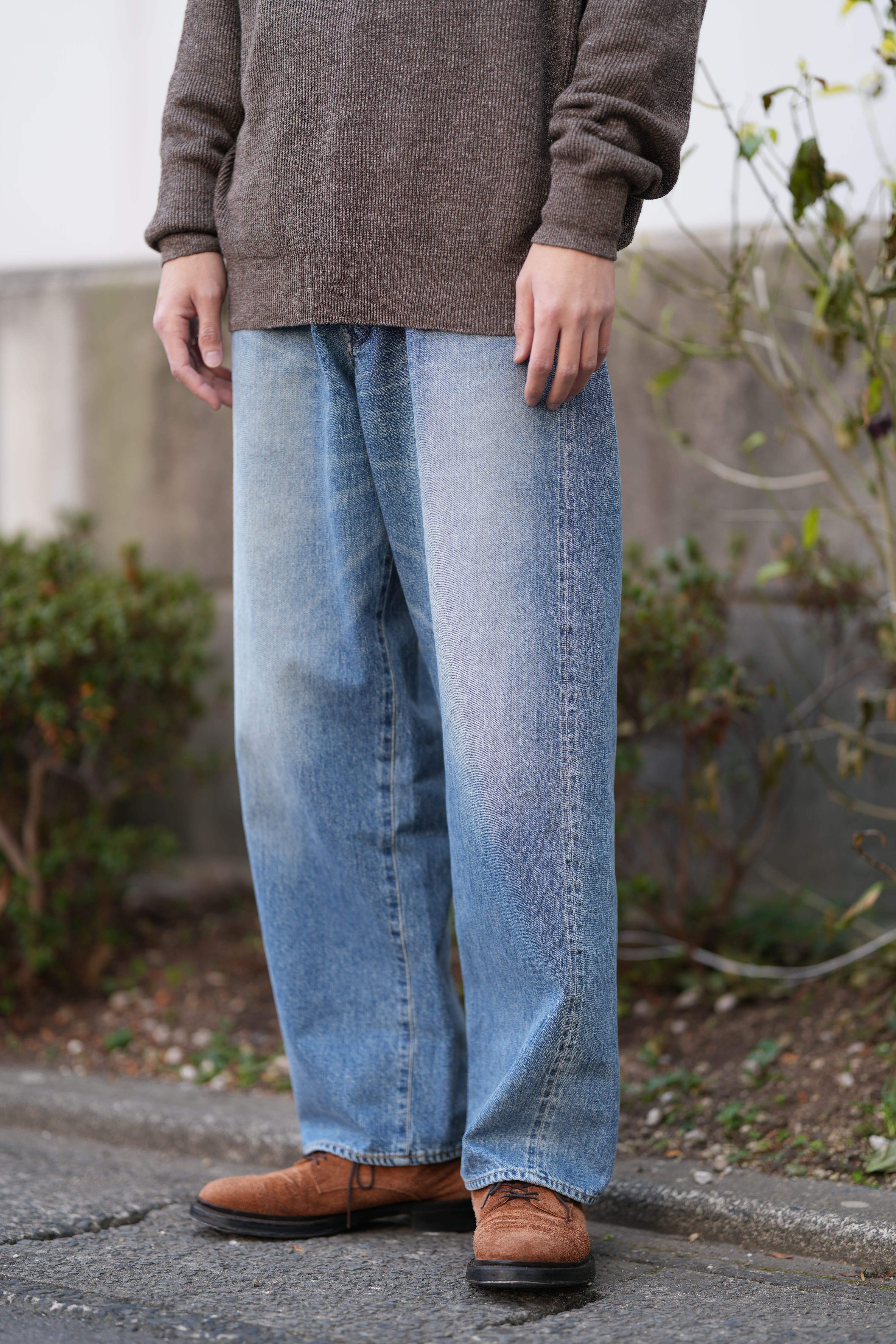 色味に関しては、今季は僕の中でトップスは「色」をテーマにしているので、その「色」を活かせるデニムを仕入れようと思ってこの淡いブルーにしました。ヴィンテージで見つけたら1番理想的な色落ちの具合いだと思います。