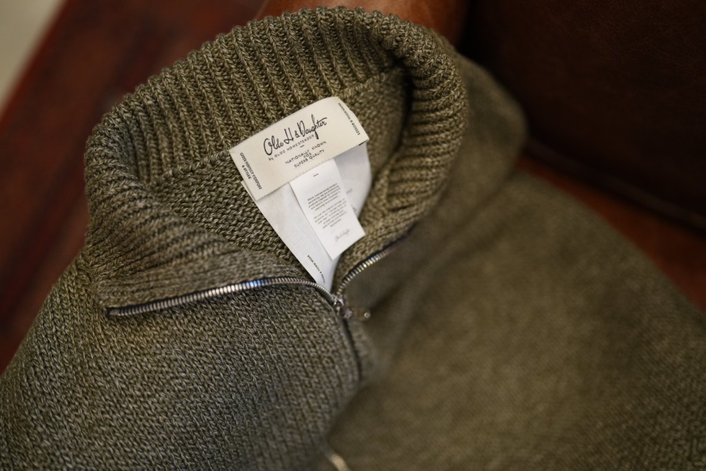 糸はオリーブに生成りの糸をミックスさせた全体的に落ち着いたトーンのニットです。スタイリングにも落とし込みやすいので今時期あとりあえず手持ちのアウターのインナーにかましてみて下さい。かなりしっくりくるはずです。