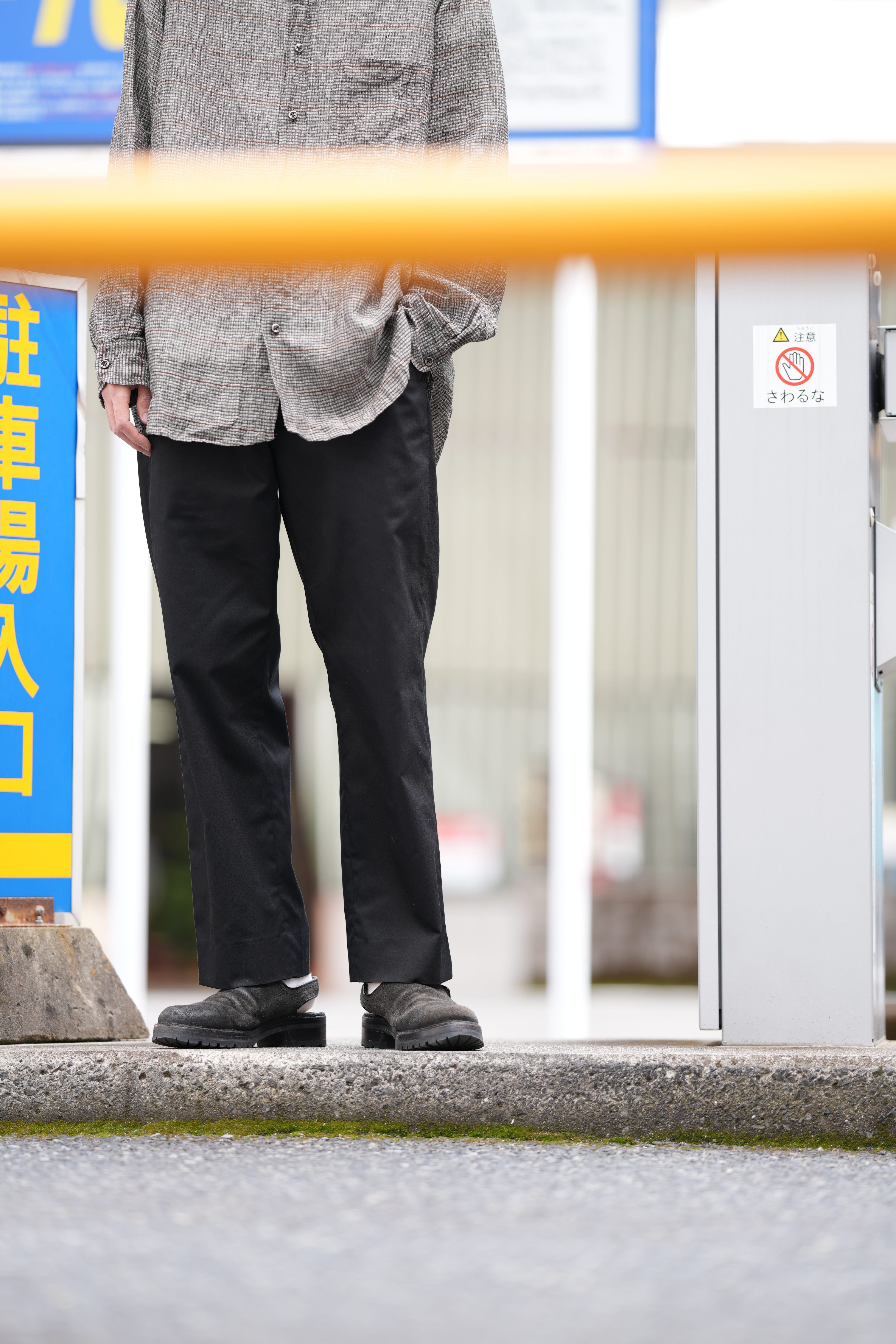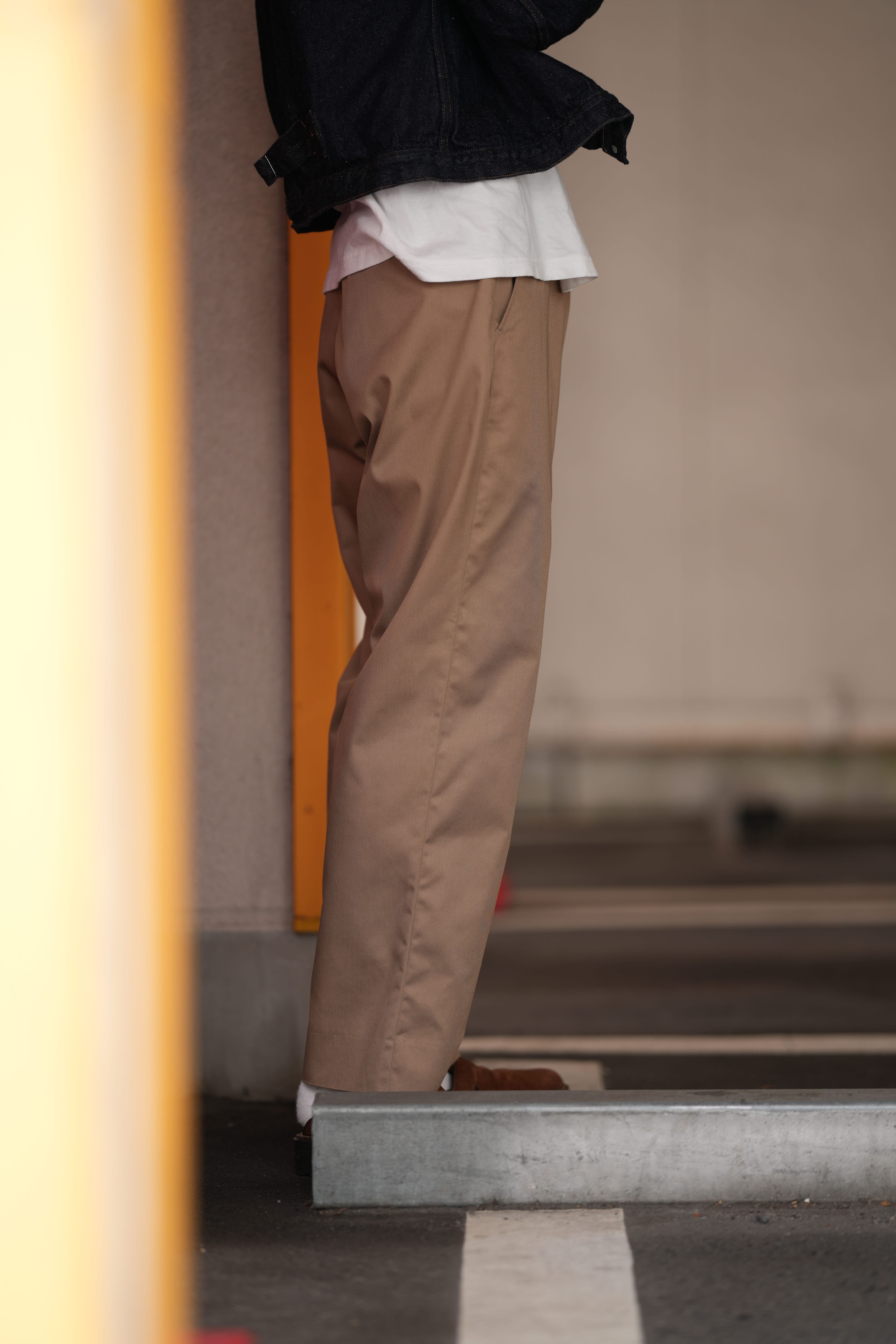 シルエットはストレートシルエットのモノをセミワイドーテードぐらいの太さに調整。生地はTC素材でより軽やかで使い勝手の良い質感に抑えています。