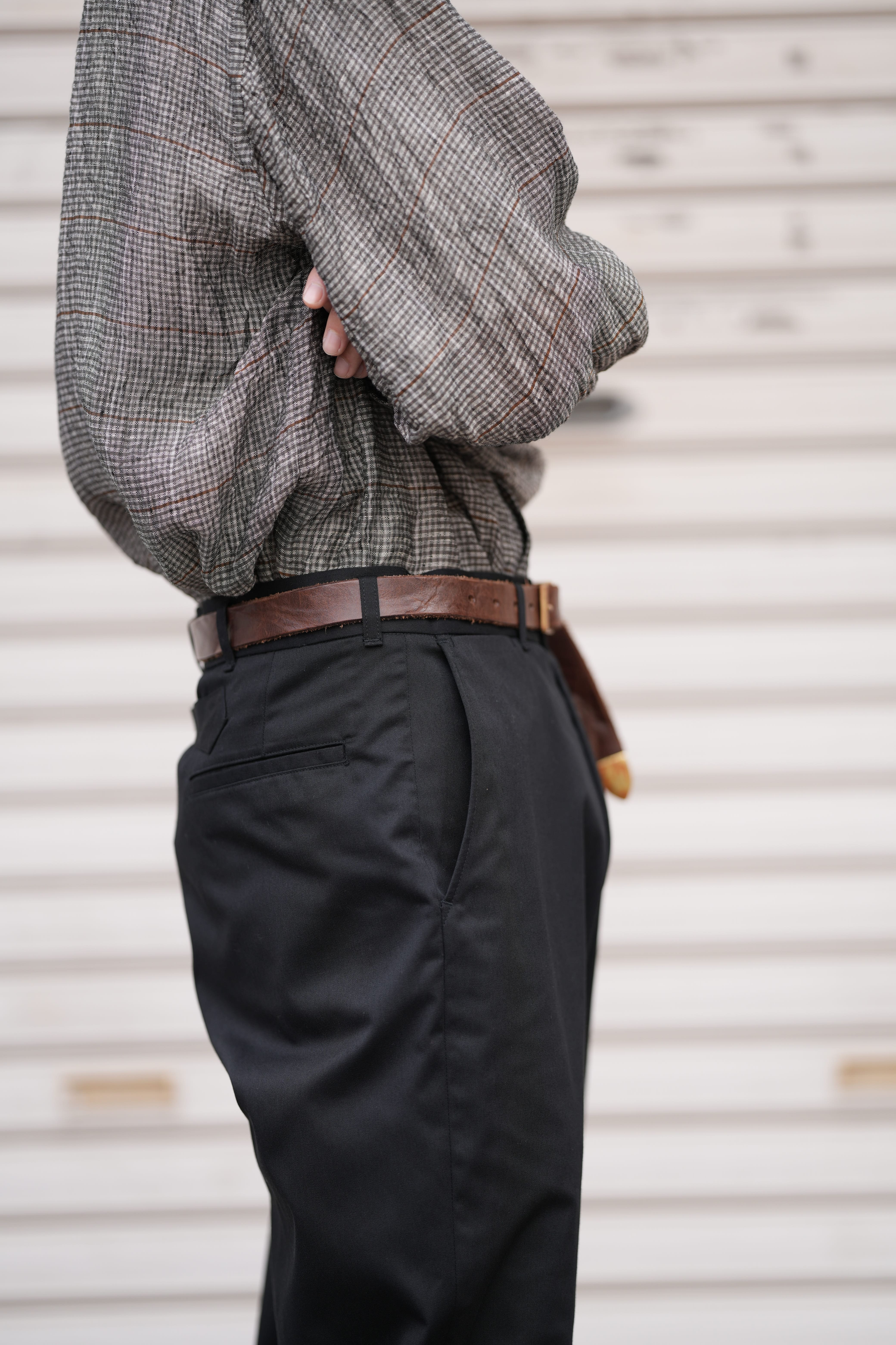 元ネタは金子さんが古着屋で買った年代不明のチノだそうです。シンチバックがあるのに、ベルトループもある、年代が古いことは確定しているが詳細は未だ不明だとか。しかし、ちょうどこの前の展示会が行われた数日前に同じディティールのチノパンを古着屋で見つけて即買いしたそうです、しっかり展示会で履いてました。
