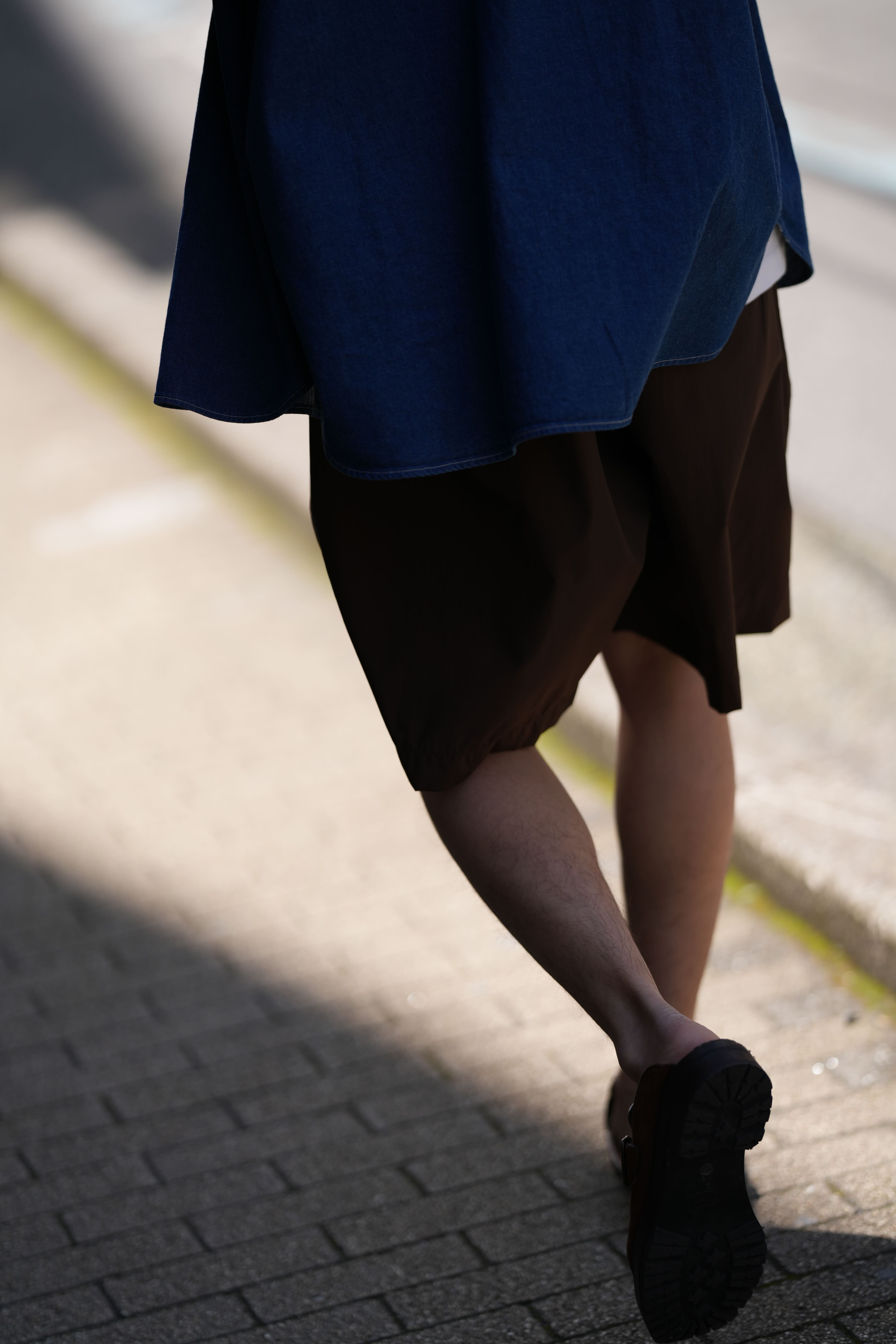 この写真だとワイドなシルエットが伝わりやすいかもしれないですね。このシルエットで膝上レングスのショーツは本当に穿きやすいです。ショーツ慣れしていない方もこのサイズ感なら間違いなくすんなりと穿いて頂けるはずです。