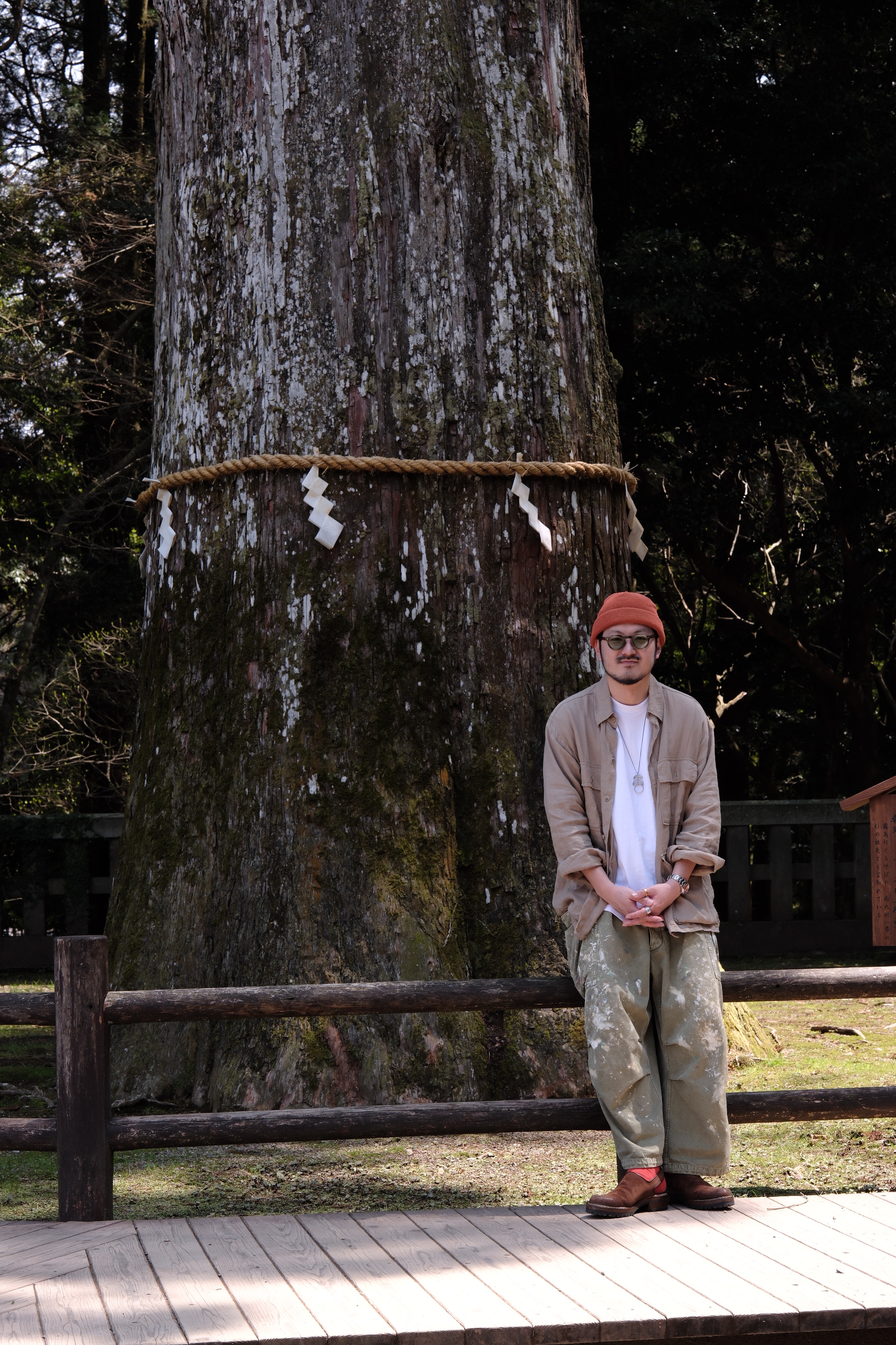 最後に先日の僕の休日スタイルと霧島神宮のおっきな木とのショットを見ながらのお別れです。