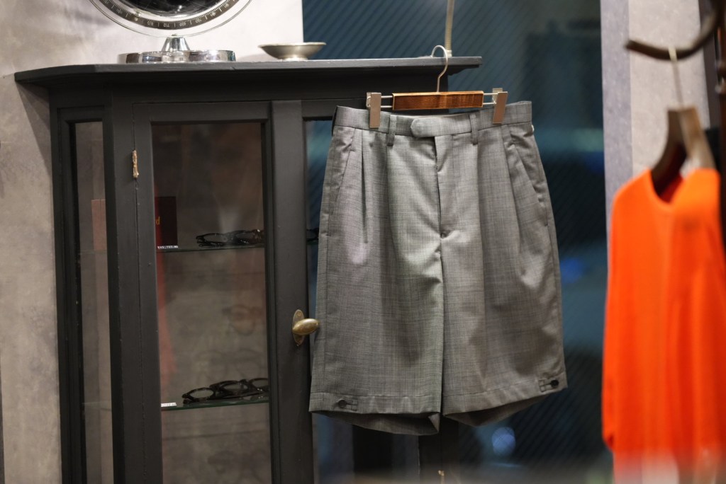 それだけではないです。先日入荷したイタリアンカラー、折って折ってのチェックもそう。多分コットンやヘンプなどのカジュアル要素の強い生地との合わせも勿論いですが、このウールショーツでもっと大人っぽく、クールな印象で合わせて頂けるはず。