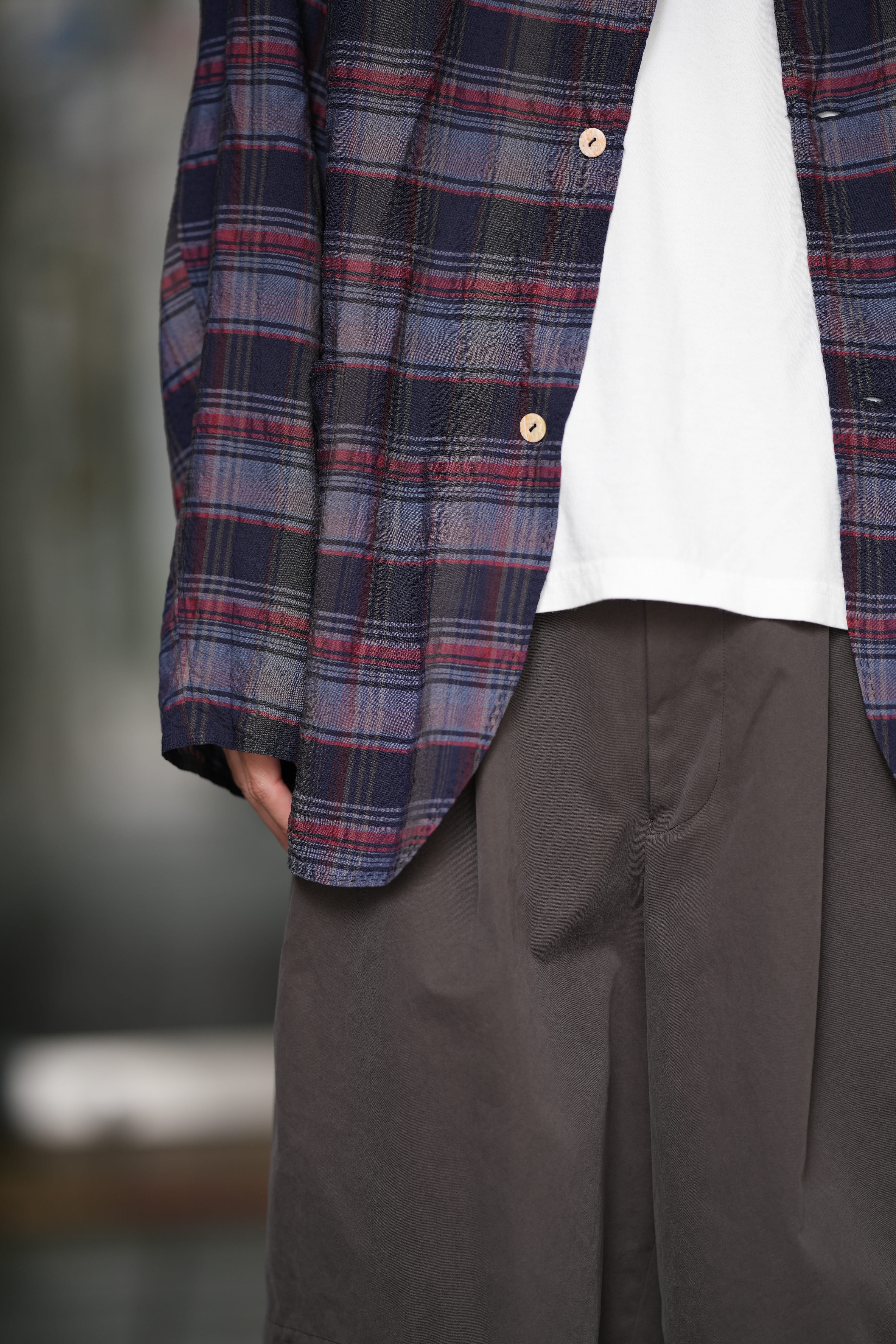 ハンドダイによるチェックも子供っぽさはなく、大人がサラッと1枚羽織るだけでグッとしまるような印象を受けます。