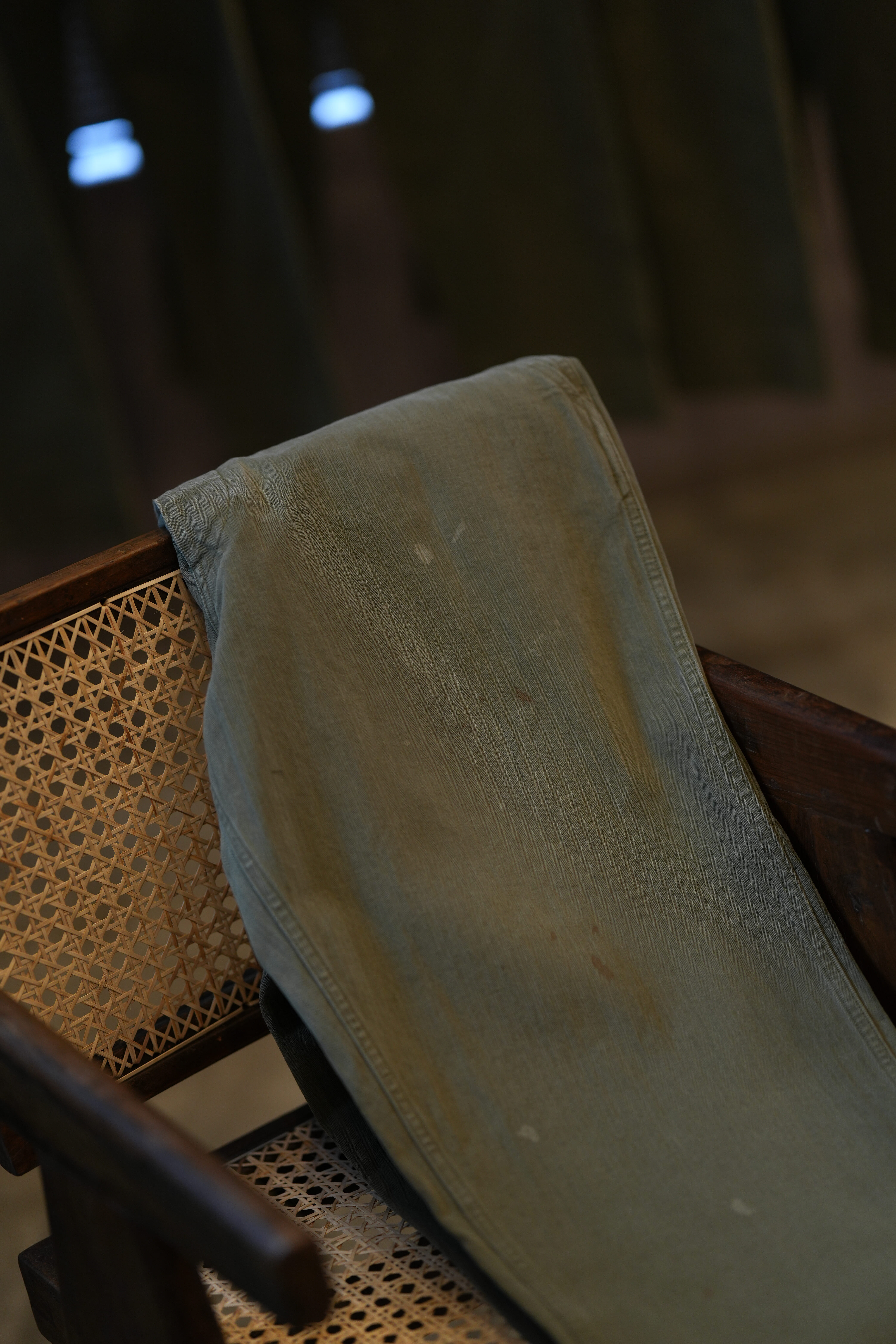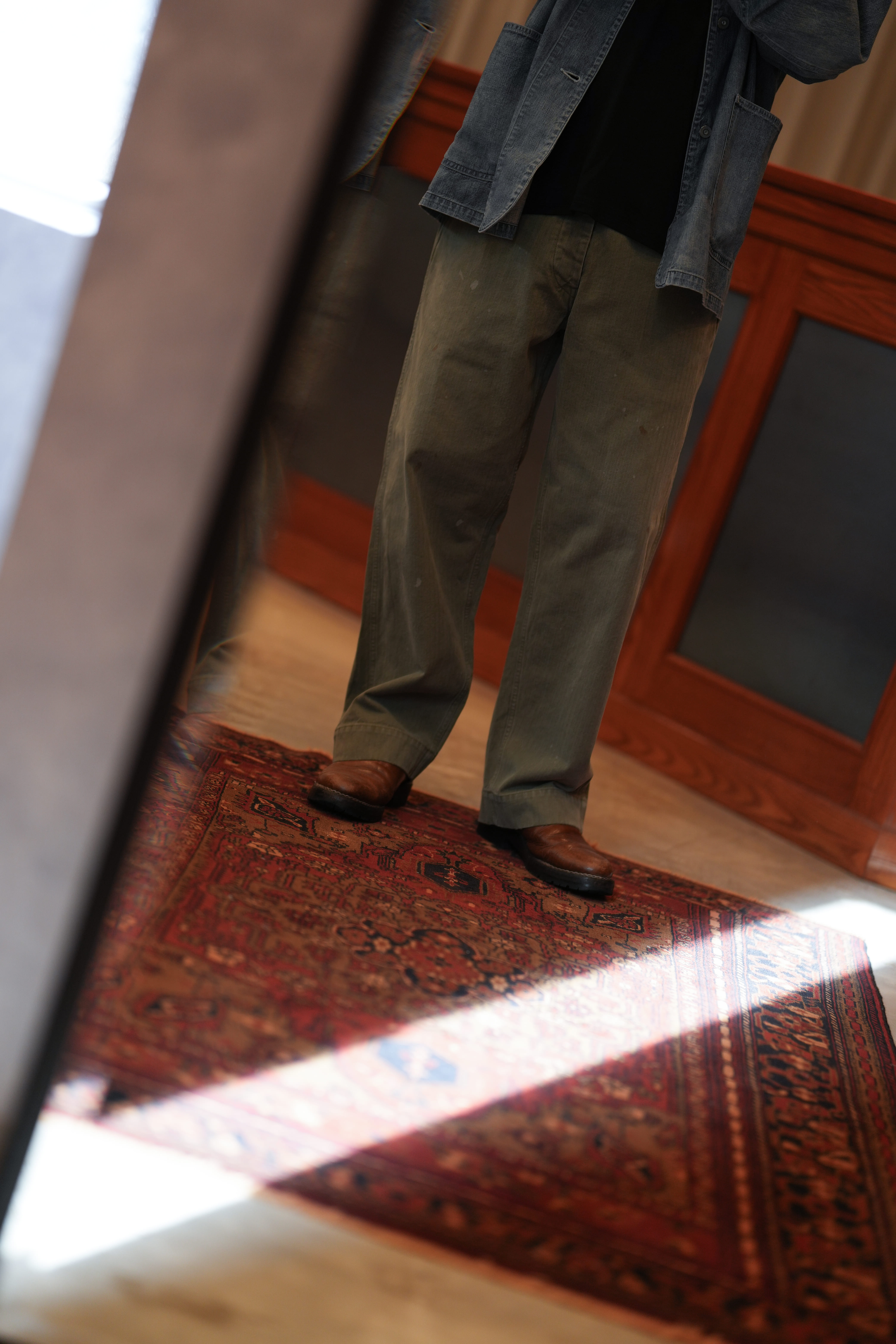 秋冬を想定した時このコシのあるコットンが相性が良いと言う穿きまくって気付いた答えだとか。