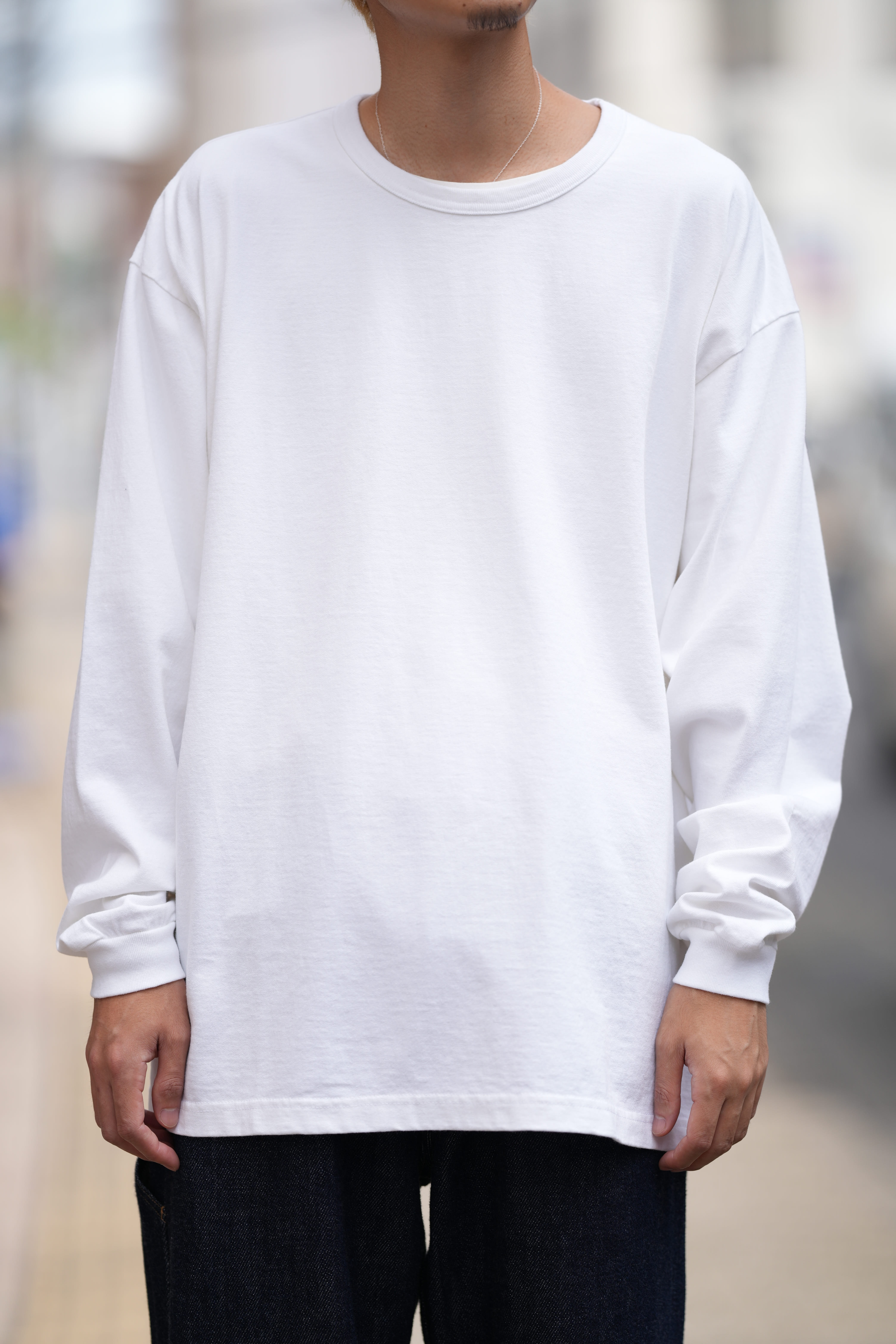 まずはサイズ感、身幅は程よく大きく、肩も少しドロップ、アームはインナーとして邪魔にならない程度に太めに設計、着丈もやり過ぎない程度に調整、まさに1枚で着るにもインナーとして着るにもちょうど良いサイズ感です。