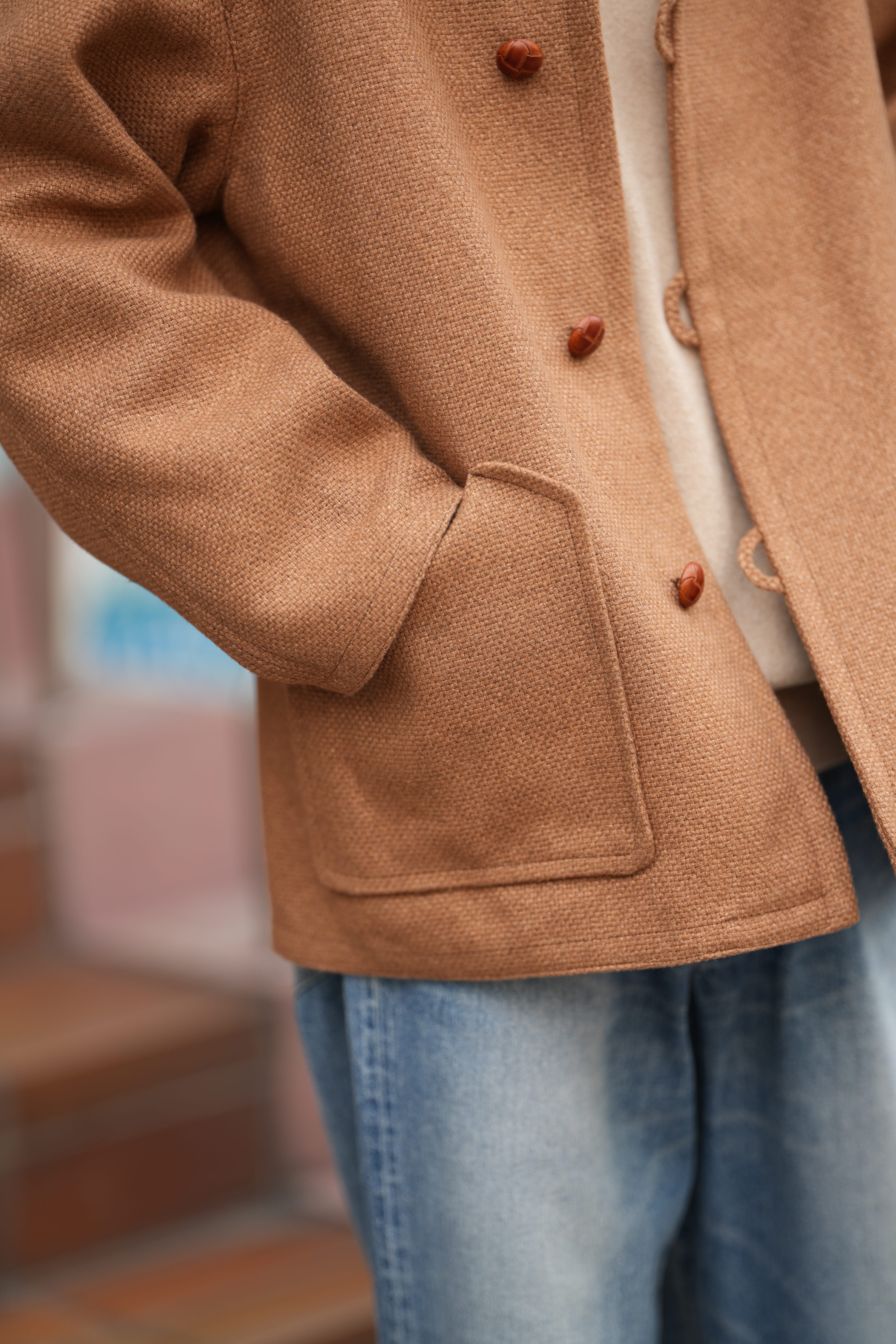 素材はカシミヤ、リネンが約半々の混率になっています。本家のウールに近いような硬さや風合いを出すためにリネンも多めに使っています。