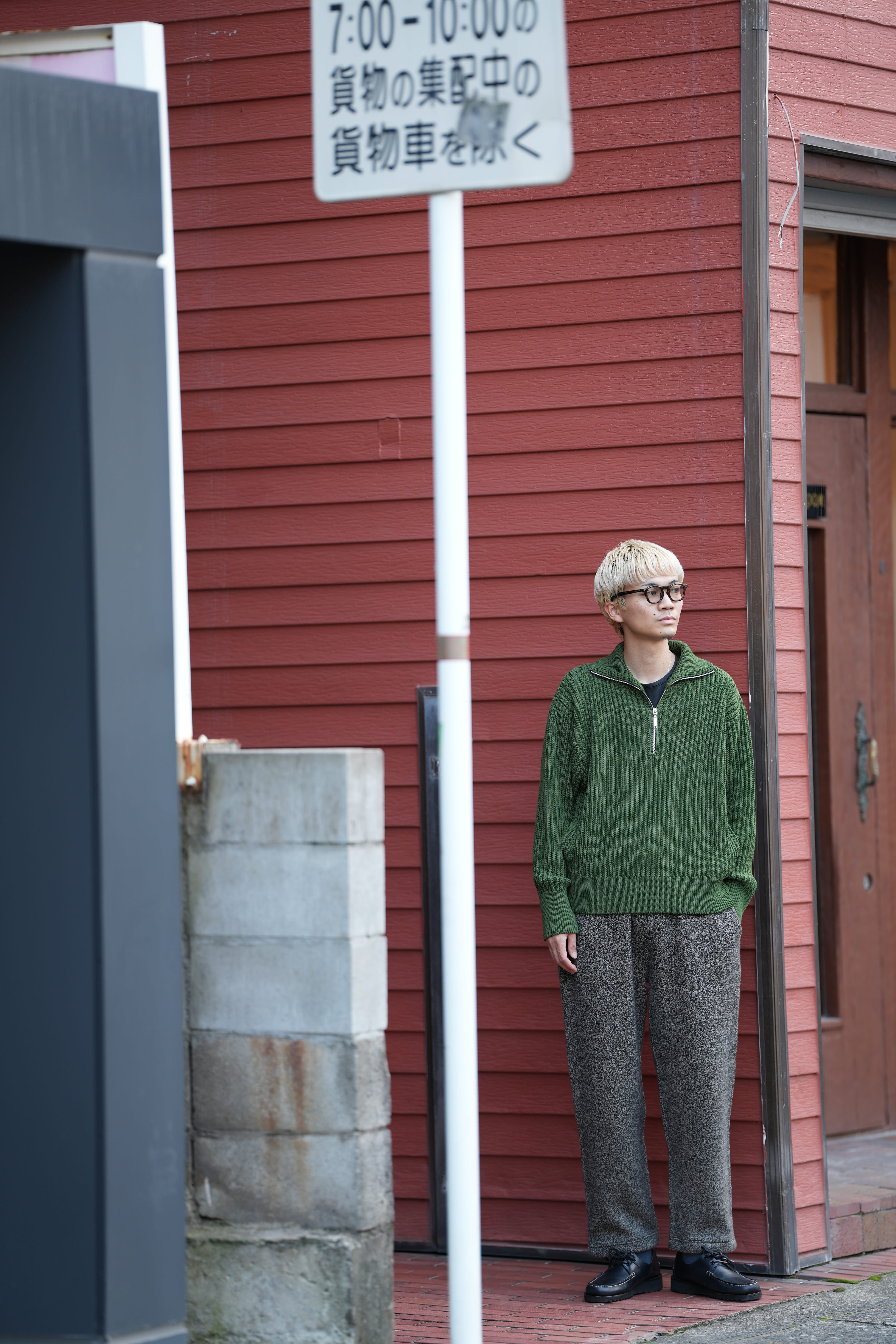 ニット:Olde H & Daughter(オールドエイチアンドドーター) 25AW “TWIST WOOL HALF ZIP NECK P/O” -MOSS- ¥86,900-(intax) 着用サイズ10