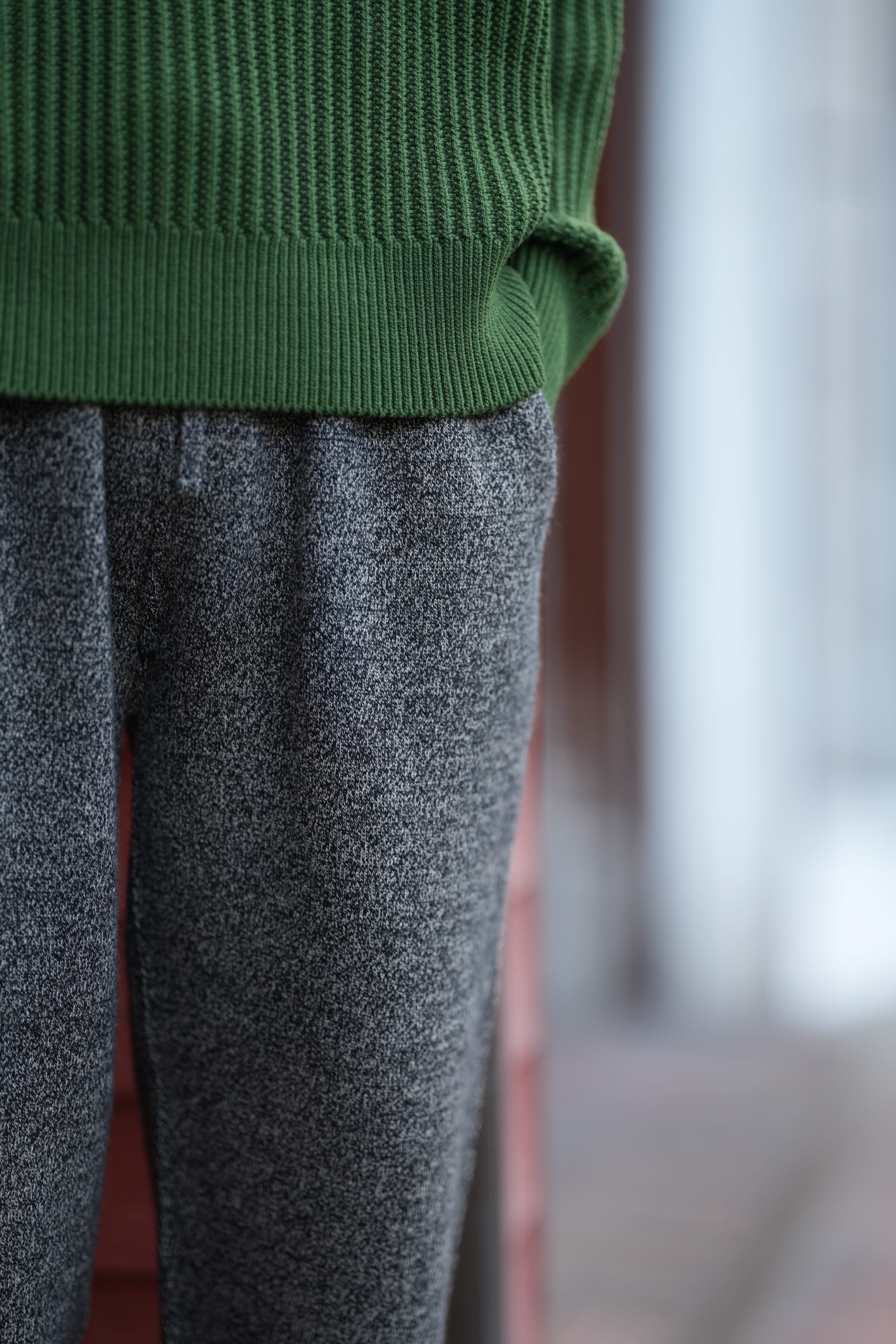 僕も元々はニットパンツとかスウェットパンツは履きませんでした。今季購入したULTERIOURに関してはとにかくシルエットが抜群に良かった。しかしHERILLはよくあるスウェットパンツの形です、それでも極上のカシミヤにする事で何故かスタイリングに馴染みやすい、、、これは僕も既に2本所有しているから分かった事でもあります。違和感なく溶け込む、合わせようと思って選ぶのではなく、たまたまそれをパジャマとして履いていて、パッとアウターを羽織ったらハマったそんなパターンです。