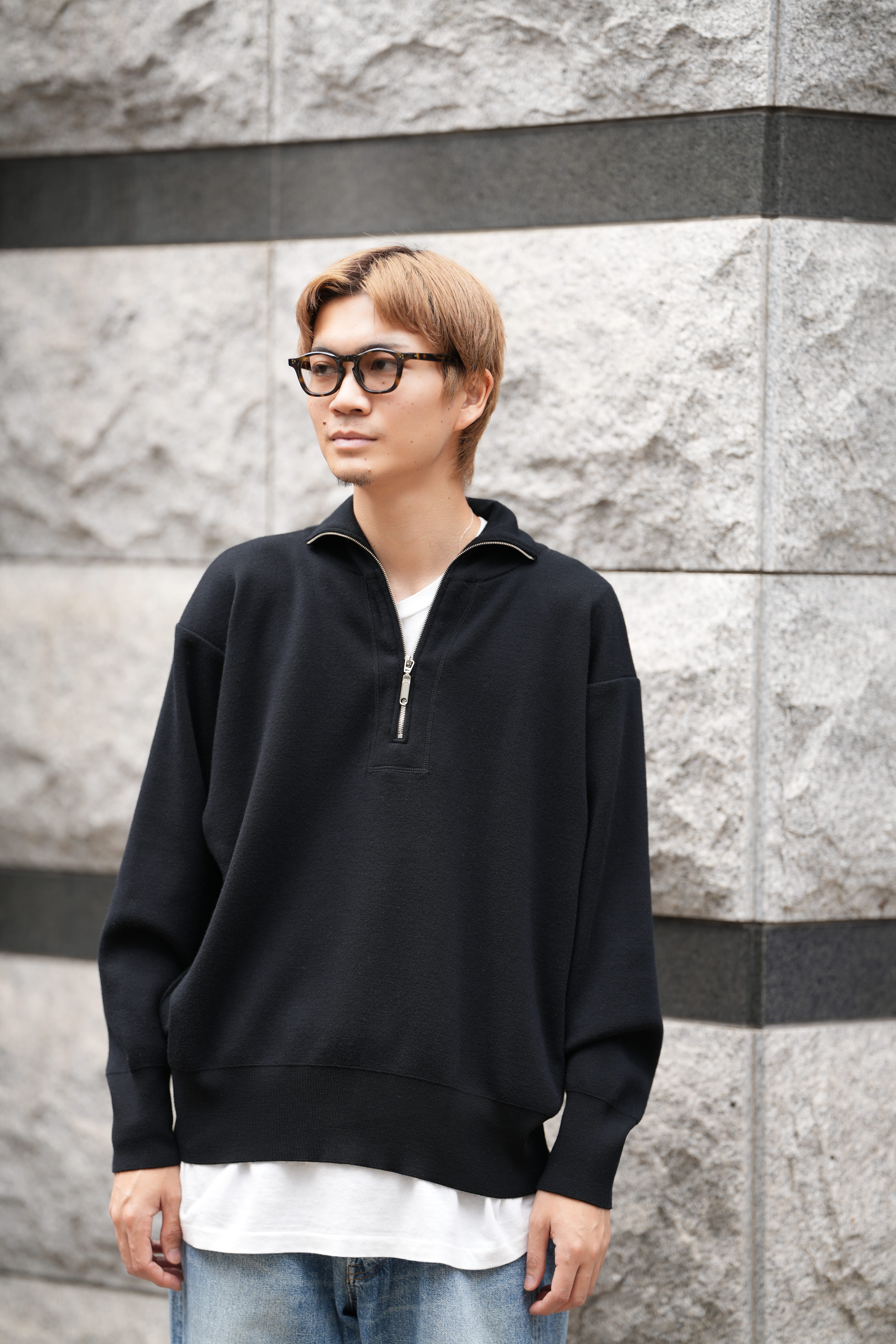 昨今の暖冬を考えるとニットを1枚で着る期間が長い。クルーのニット1枚でも勿論いいんだけど少し物足りなさを感じる時もある、そんな時にハーフジップって良くないですか?
