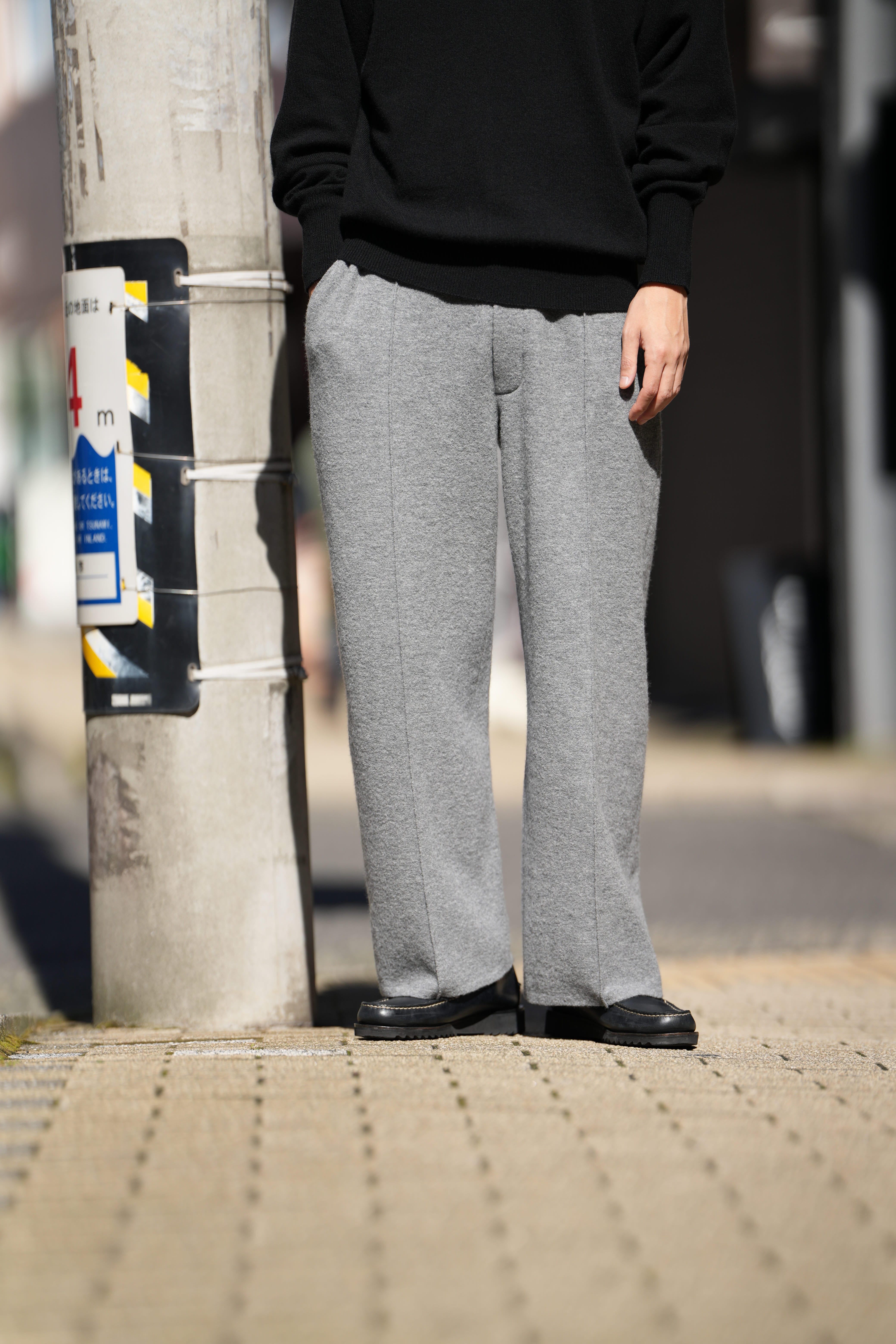 嬉しいポイントとしてはセンタークリースが縫われいているので、洗っても現状のスラックス的綺麗目な要素を残しつつ穿くことが出来ます。このセンタークリースがなくなると一気にスウェパン感が出てくると思うので、これは流石のディテールです。