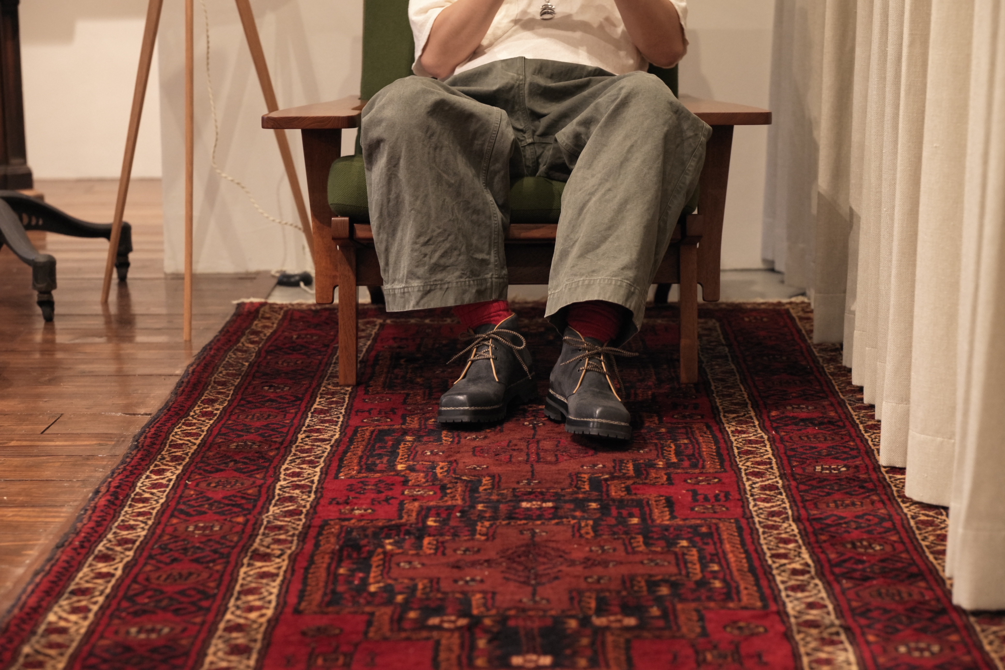 メーカーの秋山さんに絶対次はこれだろって言われて、ないけどなーって内心思いながら試してみましたが足を通した瞬間に僕の大好きなゆとりのあるフィット感がだったので一気に期待を持ちました。そして靴紐もトレッキングブーツと同じというセンスにも惹かれつつ、実際に履いた自分を見て一瞬でした。