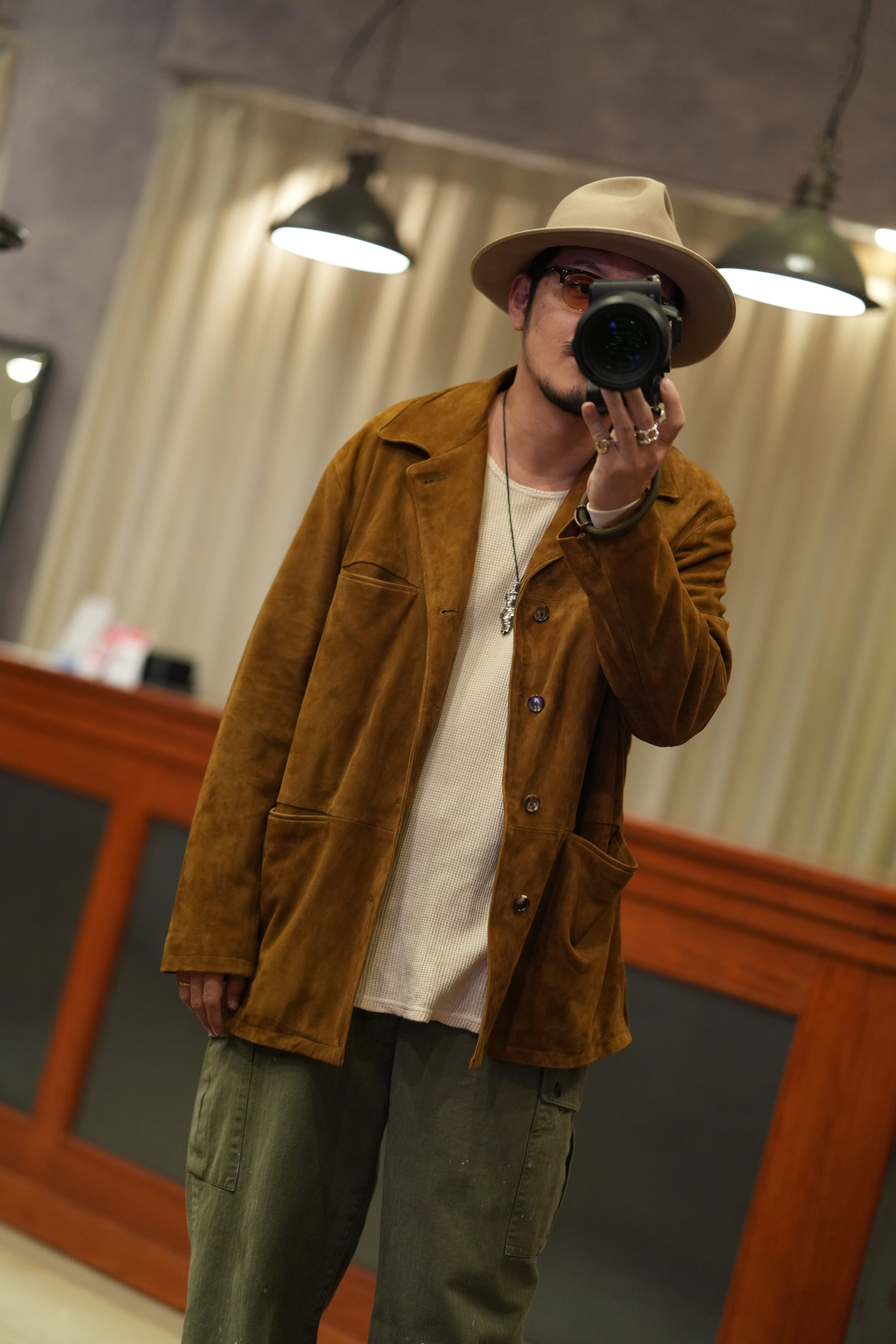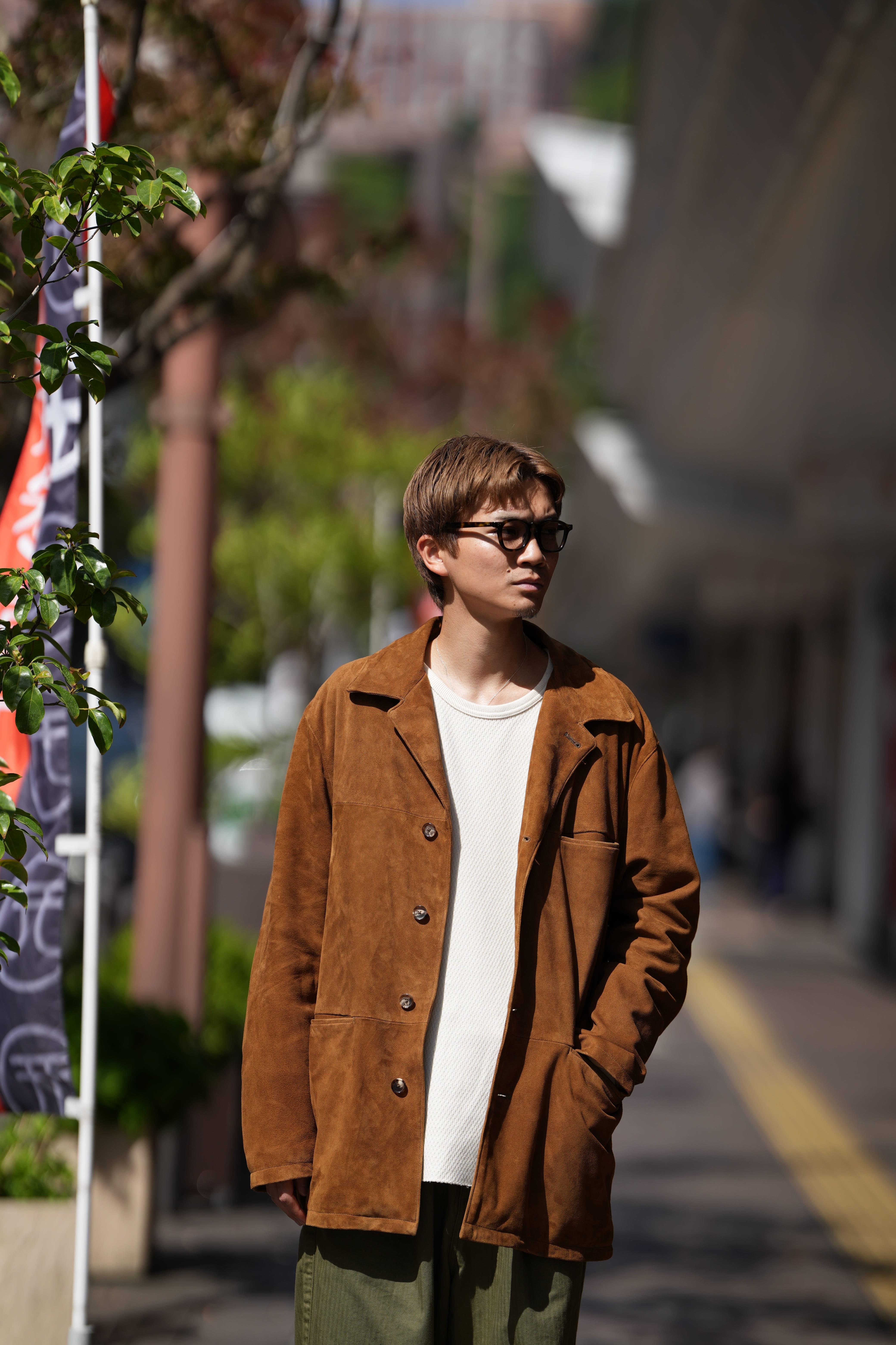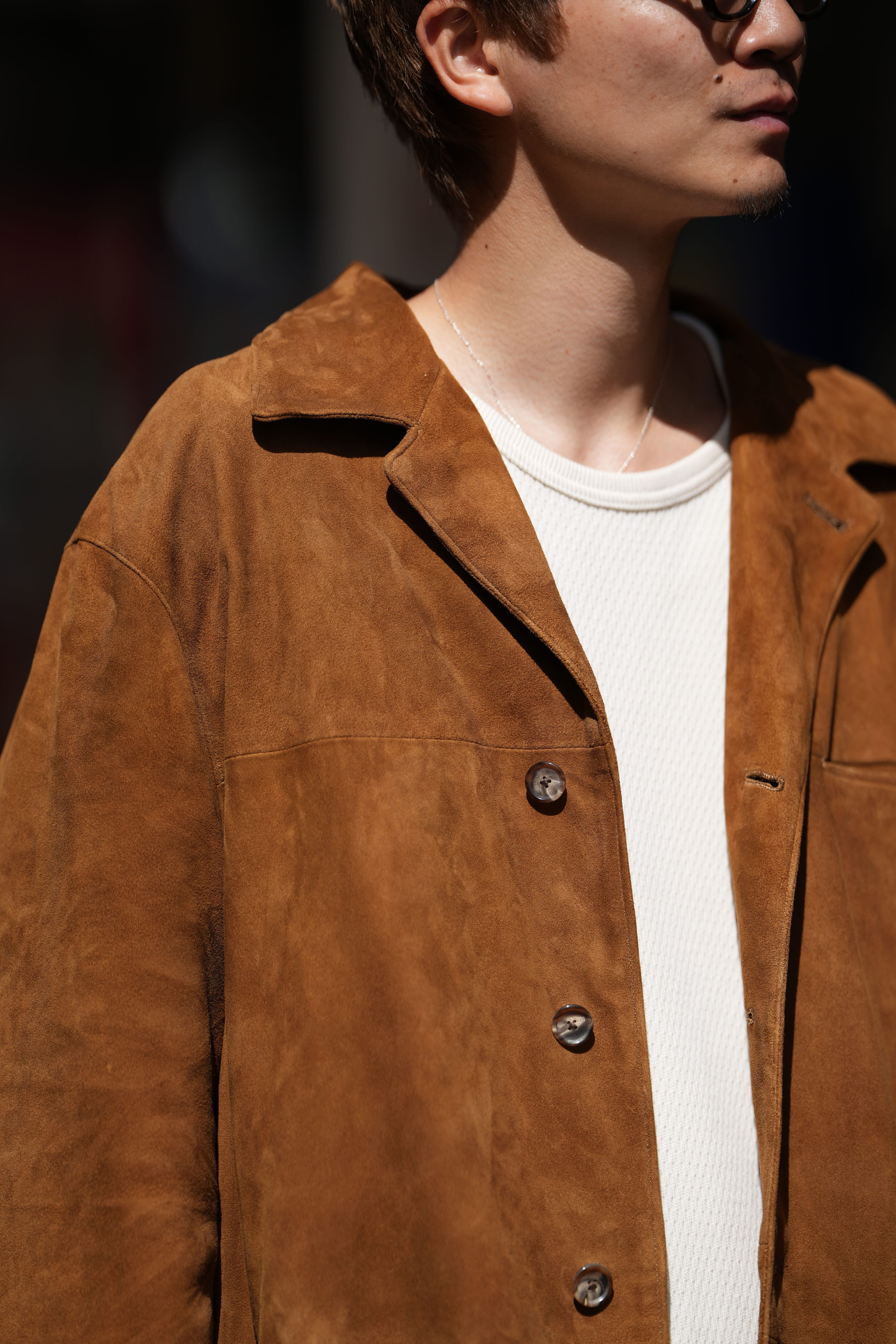 この色味のスウェードを見るとどうしてもヴィンテージのラルフだったりGAPが作るレザージャケットのがチラついてきます。僕自身この色味が好きで、これにカーキのパンツを合わせるのが鉄板だと思っているのですが、やはり古着のスウェードだと匂いがキツかったり、明らかに革のクオリティーが低かったり、そもそも形が悪かったりして試着はしても購入には至りませんでした。