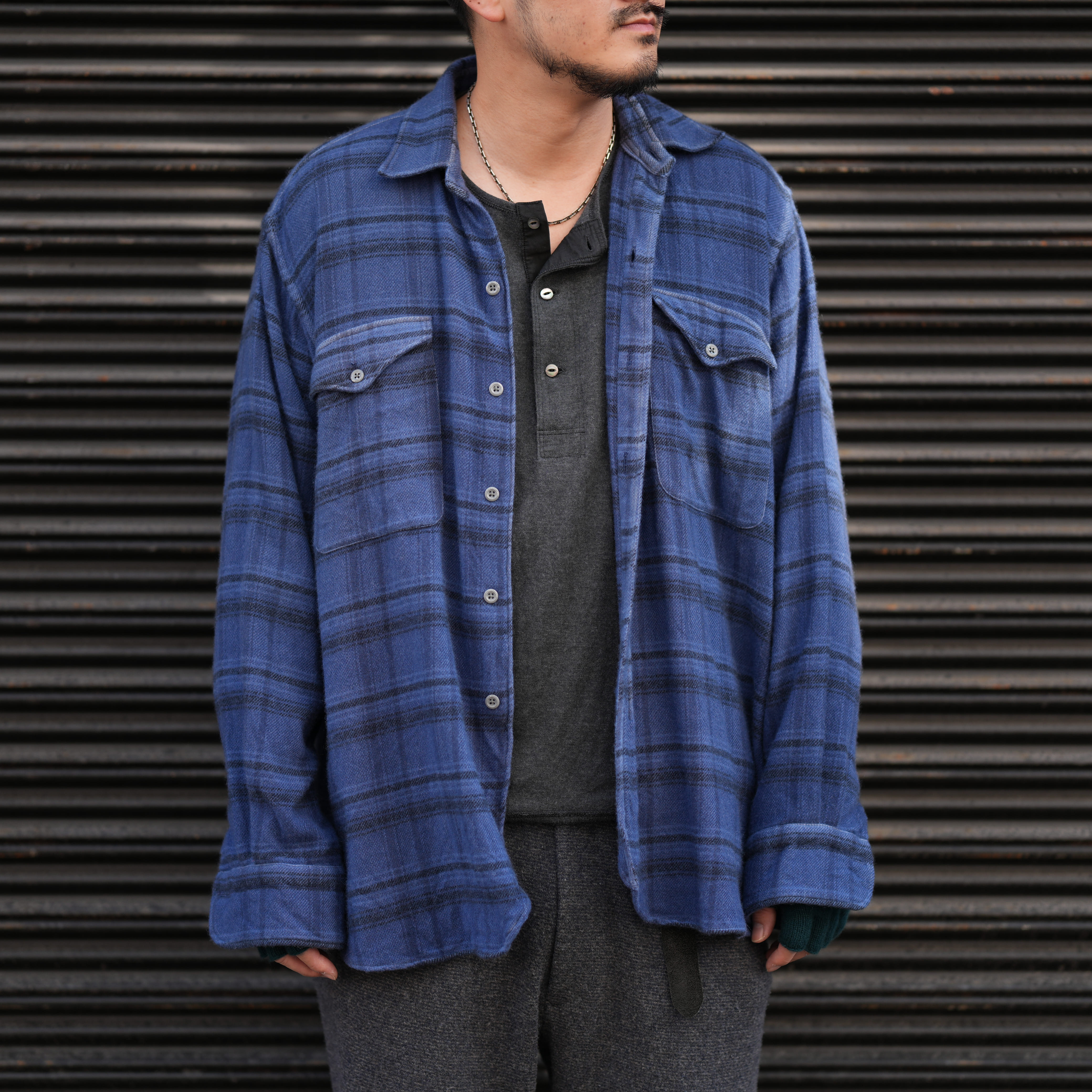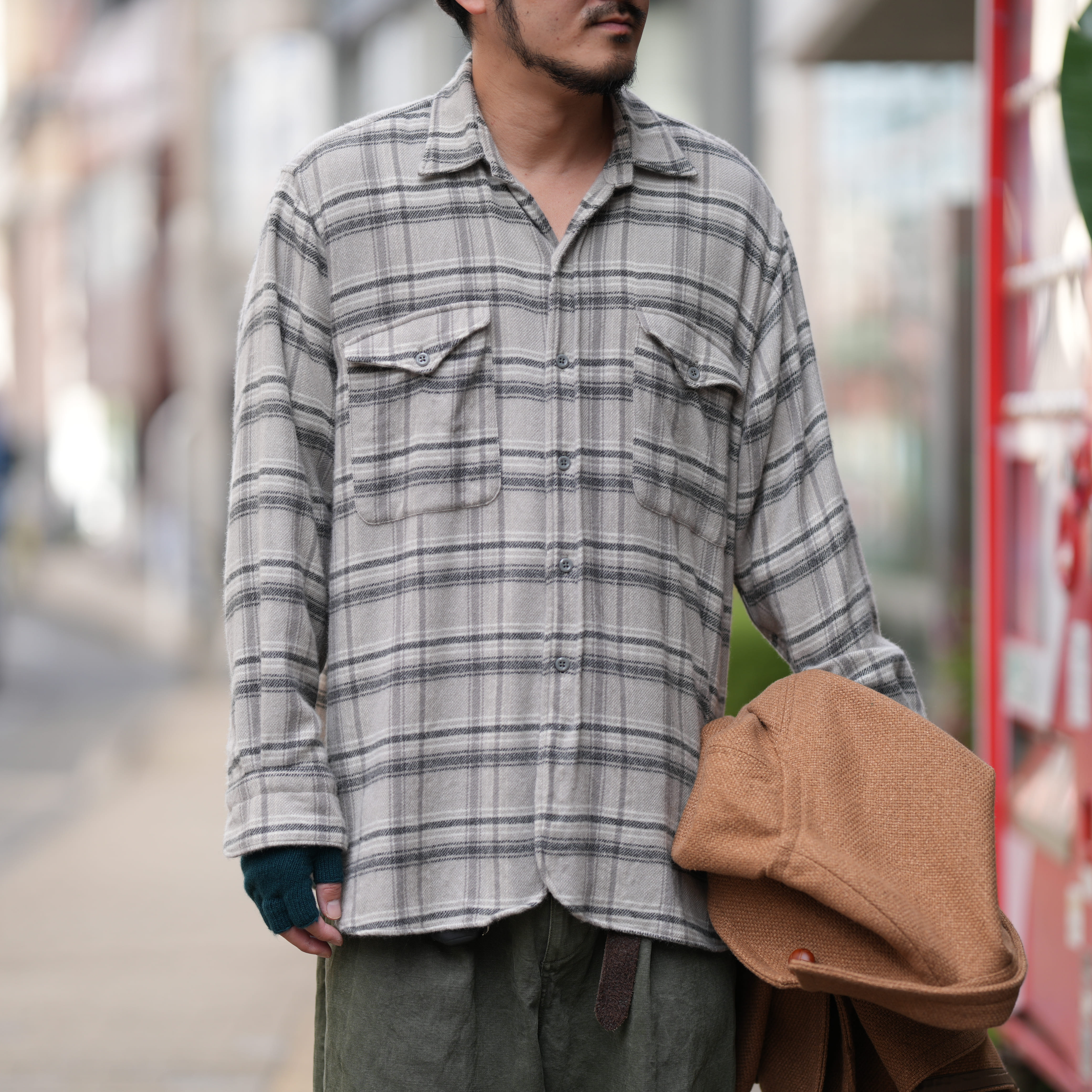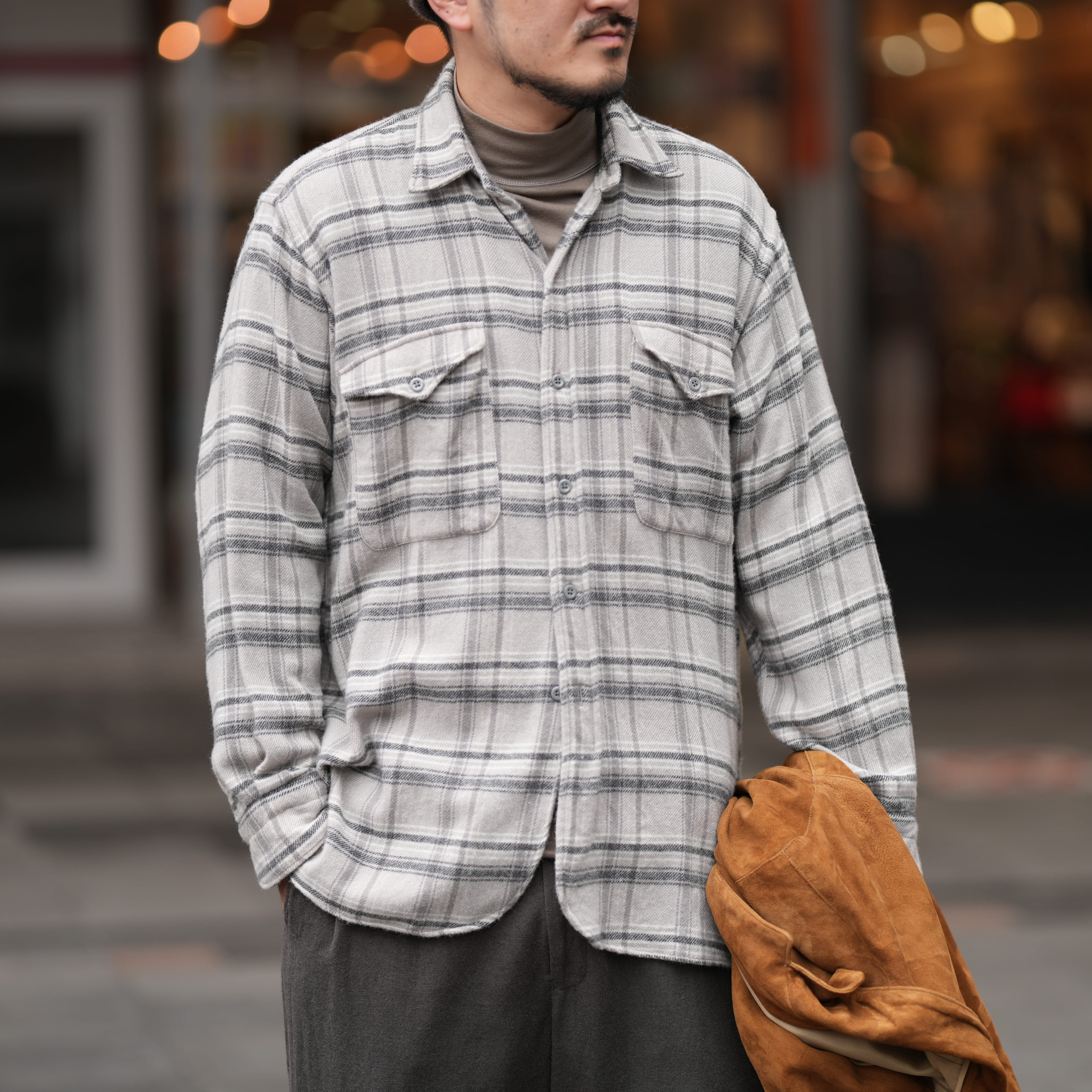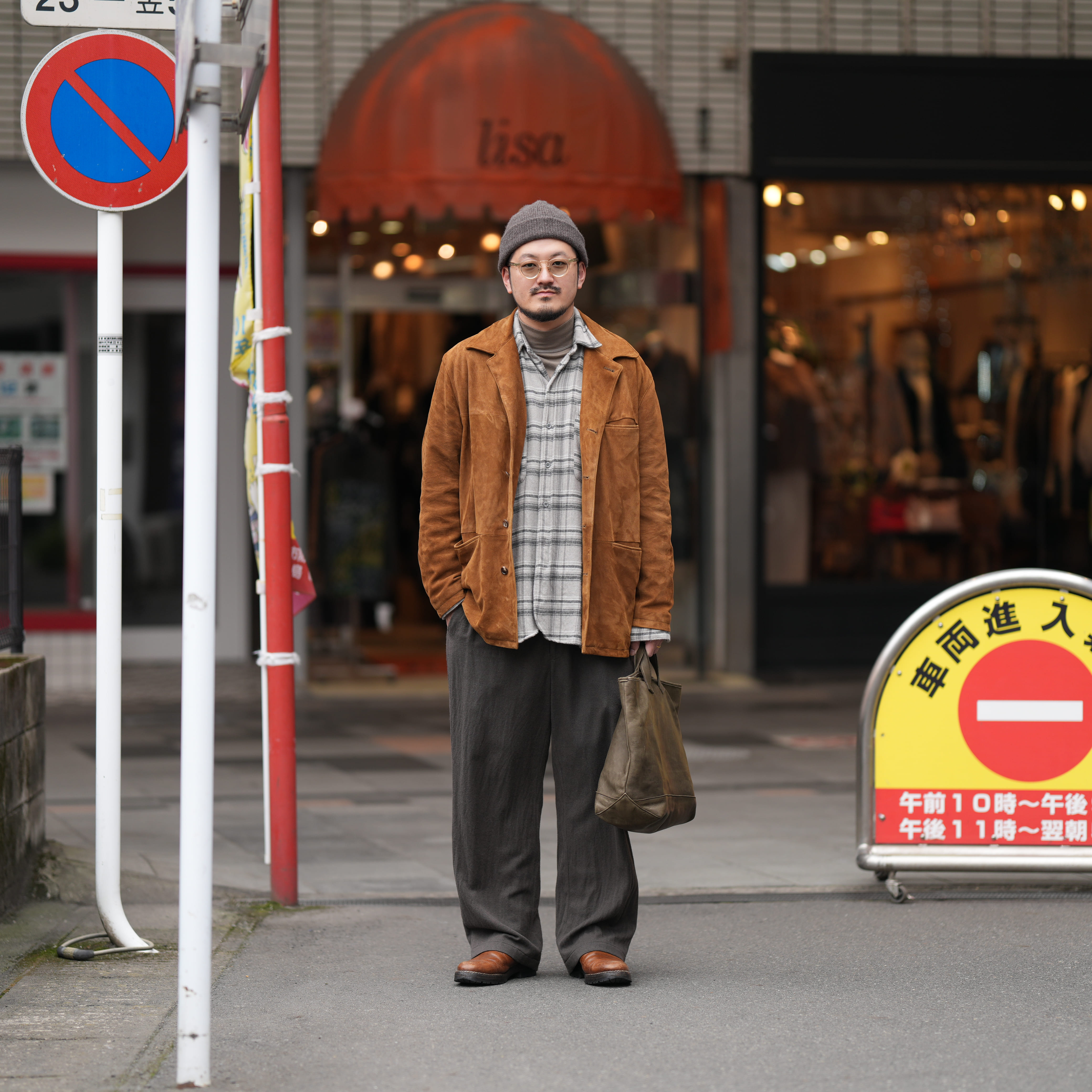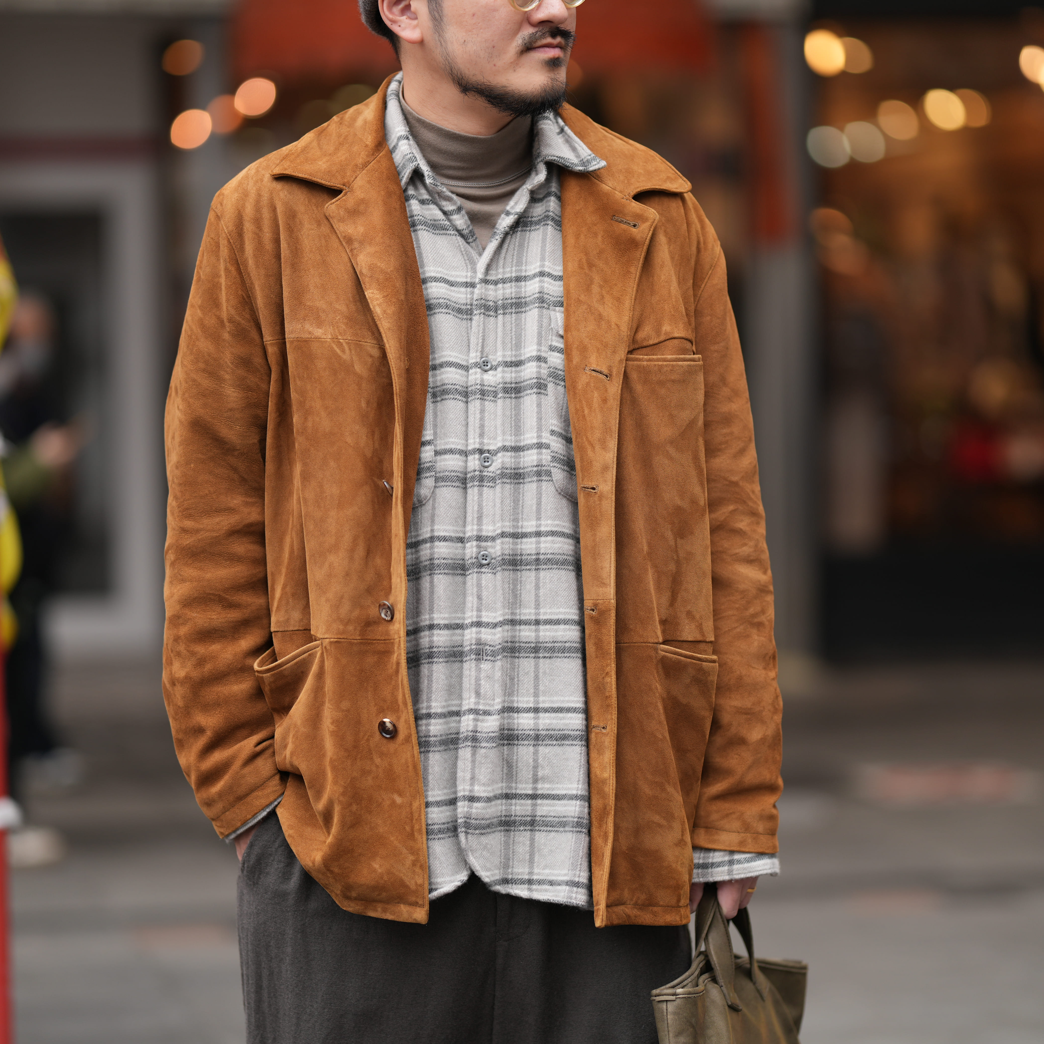 元々古着で似たような物を着ていた時の感覚でチェックシャツを入れて、その中にはモックを着て。今は全てがアップデートされて、イタリア製のモチモチスウェードだし、カシミヤのネルシャツだし、ふわふわのコットンモックだし。大人版にアップデートです。