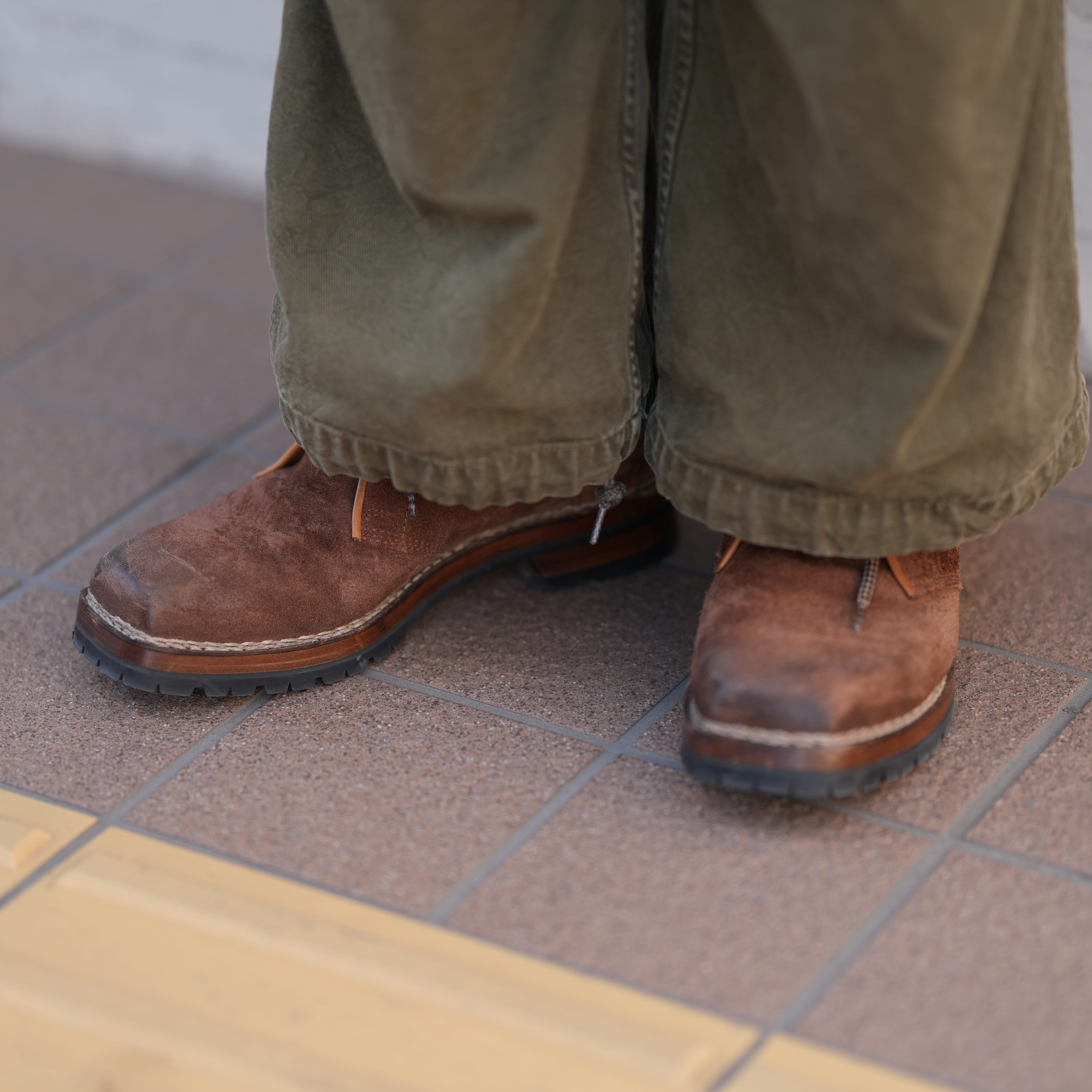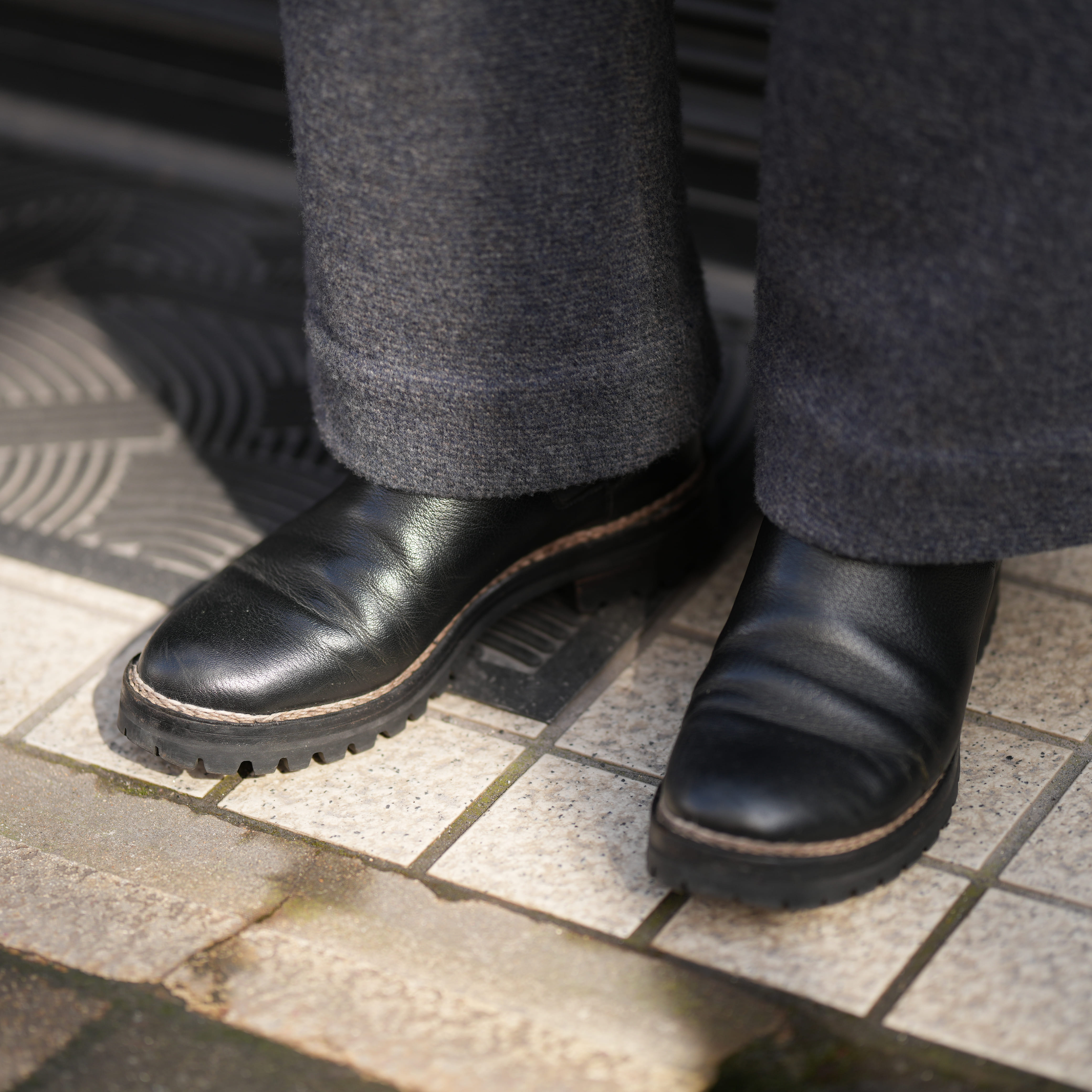 足元はいつもマルモラーダで、最近一番お気に入りのチャッカブーツです。スリングバックが一番履きやすいと思っていたけど余裕で超えてきました。靴紐めんどくさい族の僕でも全く気にならないぐらい脱ぎ履きは楽です。