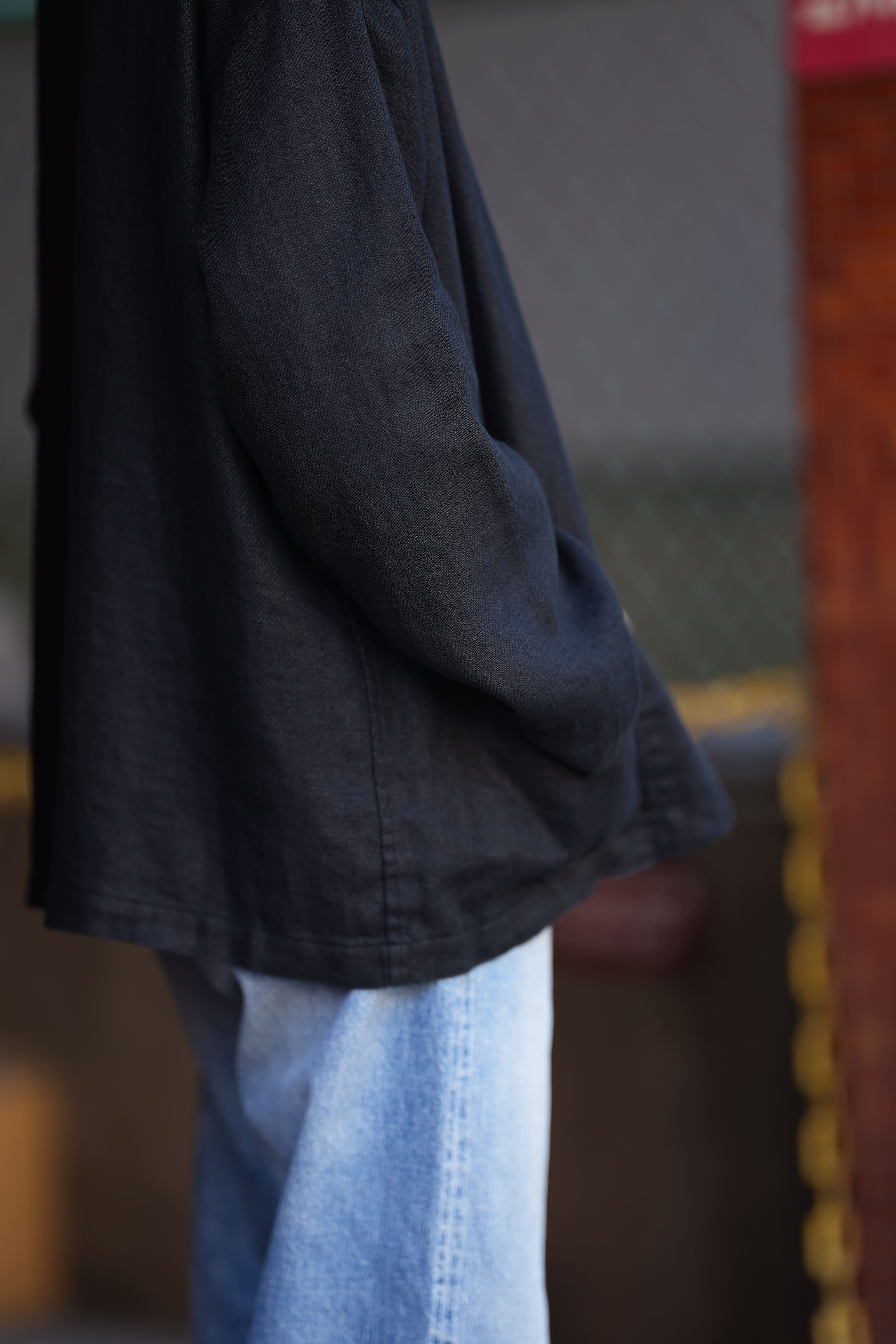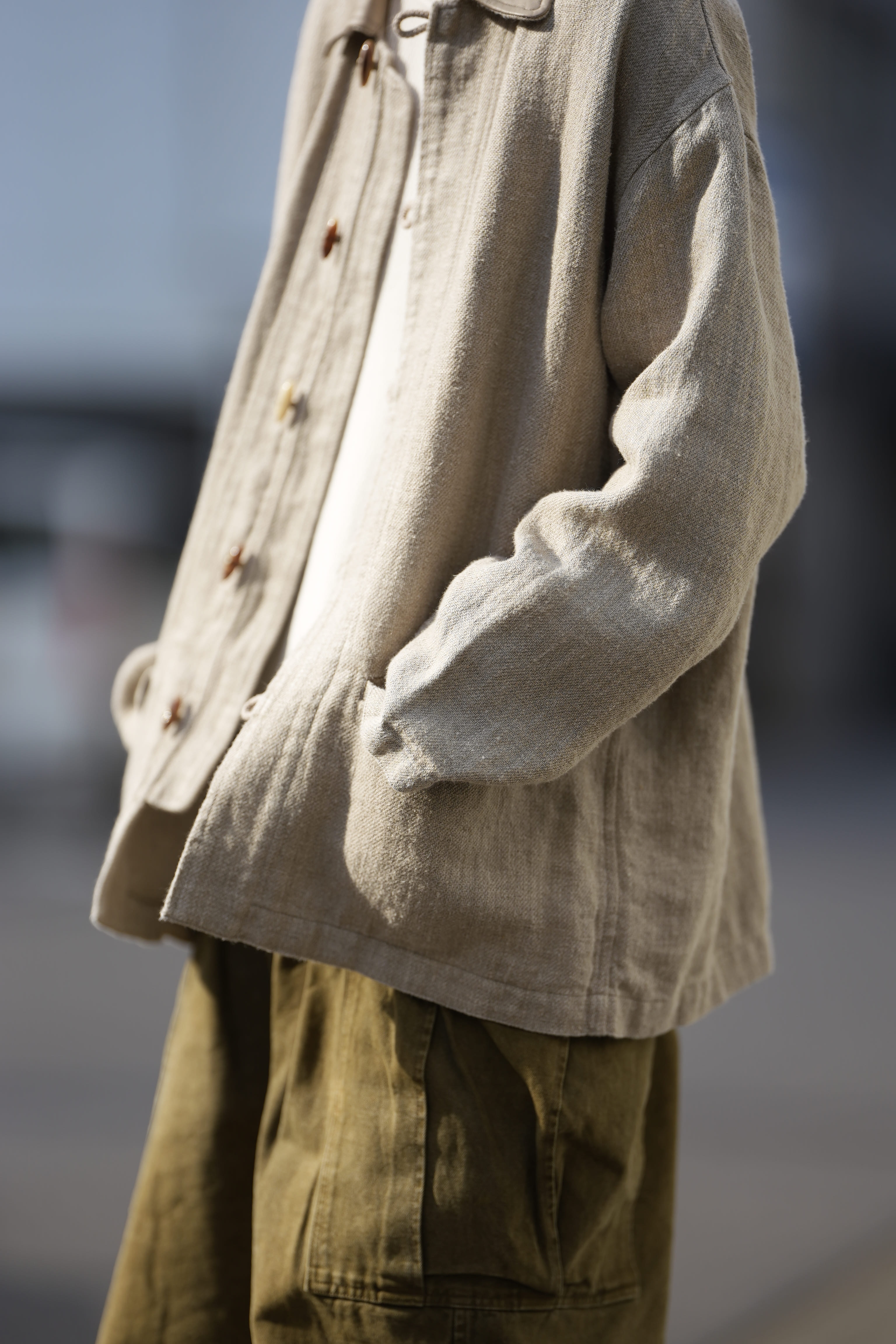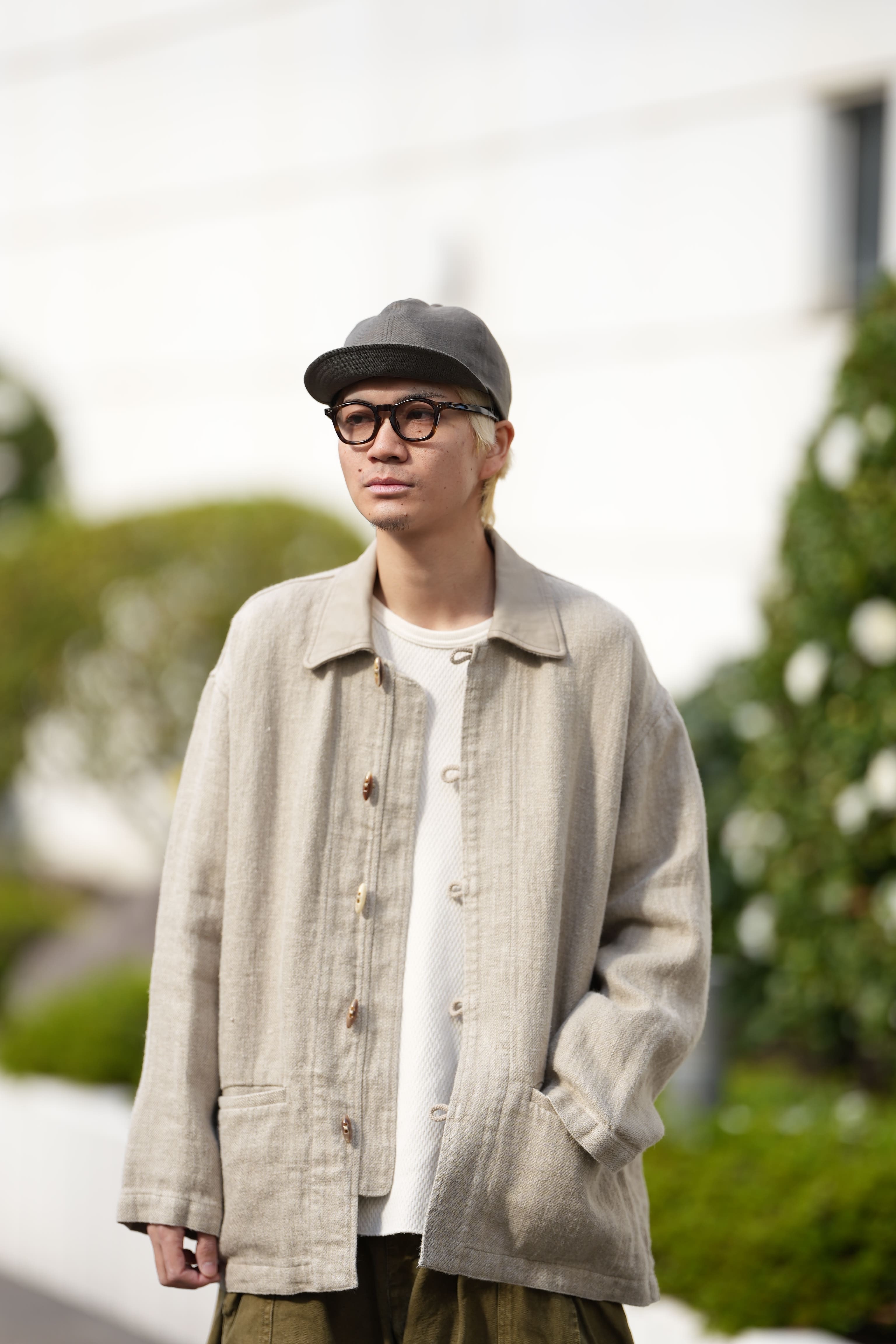 ドSリネンのように所謂、夏に想像するあのリネンとは少し異なります。シルクもさらさらがあれば起毛させたシルクネルと呼ばれるフワフワしたものがあるように、こちらもリネンに加工を加える事で起毛させて、モサモサの風合いに仕上げています。若干厚みもあり、重量もあるのでライトオンスのデニムのカバーオールを羽織っているぐらいのテンション感でしょうか。