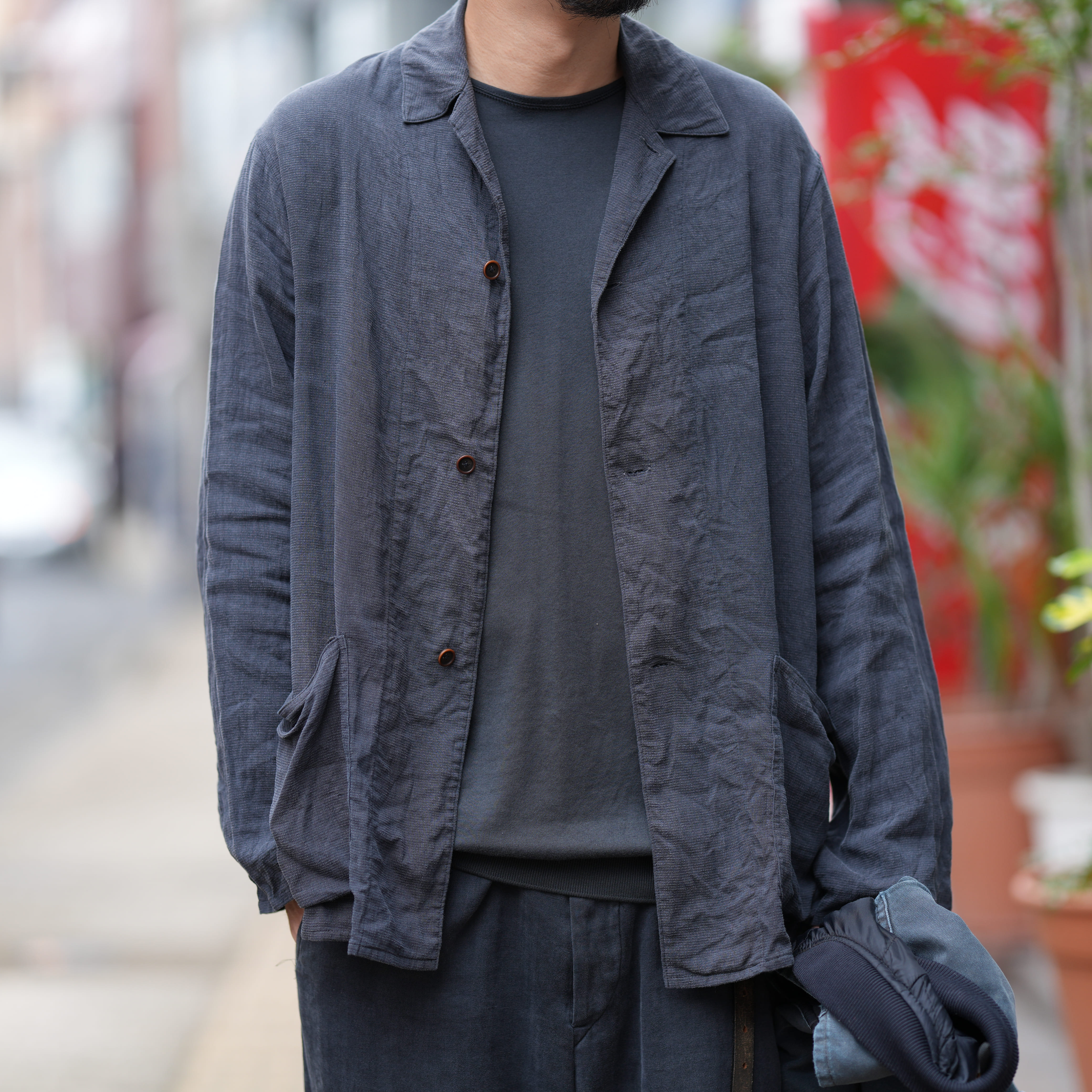 このジャケットの良いところは生地は勿論ですが、僕が良く穿くパンツのシルエットとの相性がすこぶる良いところと、インナーが何でもいけるところです。