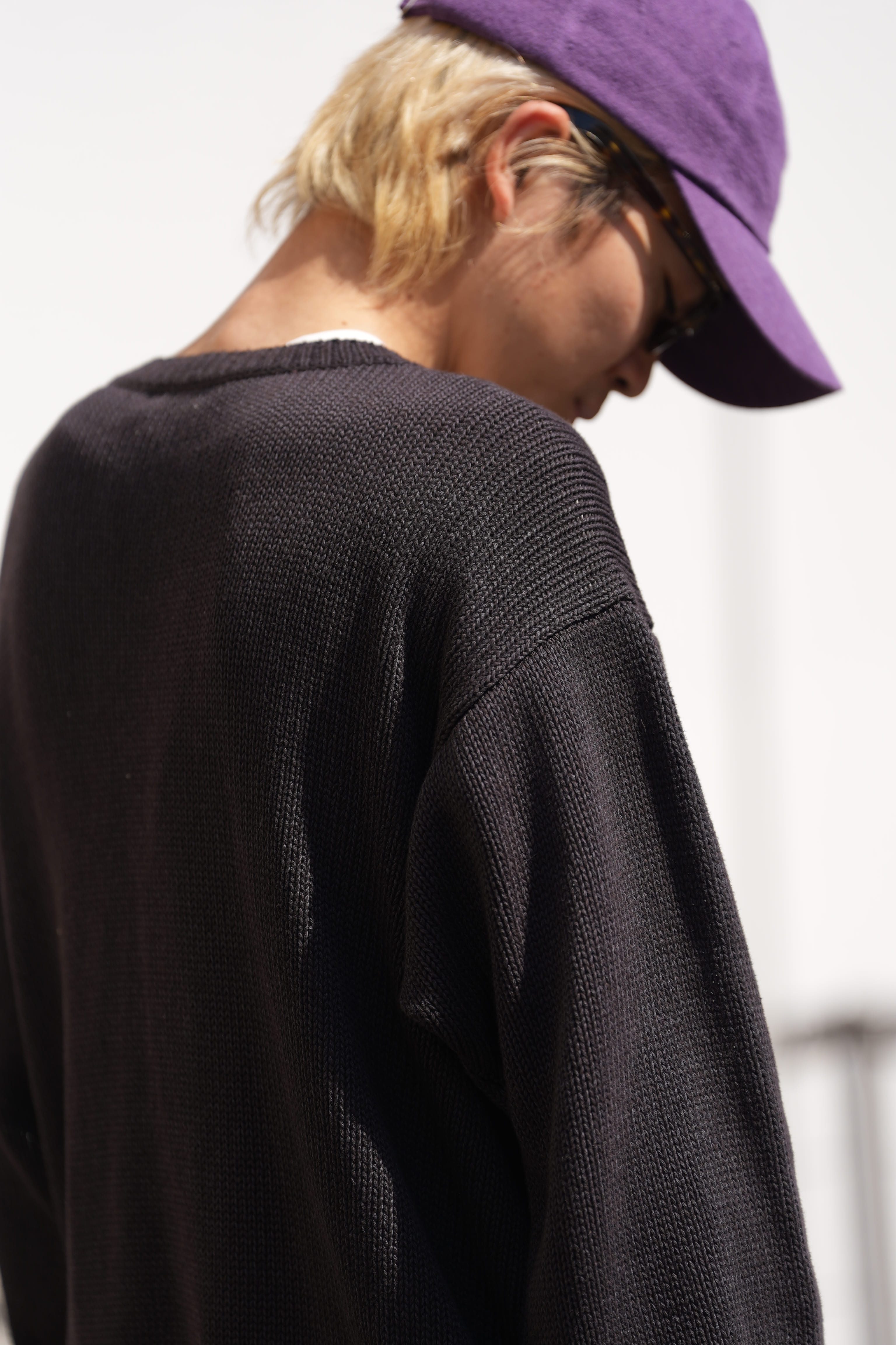 見た目からするとコットンでずっしりとしたニットでどちらかと言えば春でも暑苦しいような見た目ですが、ローゲージで糸も細く実はインナーも透けるぐらいに風の通りは良いです。